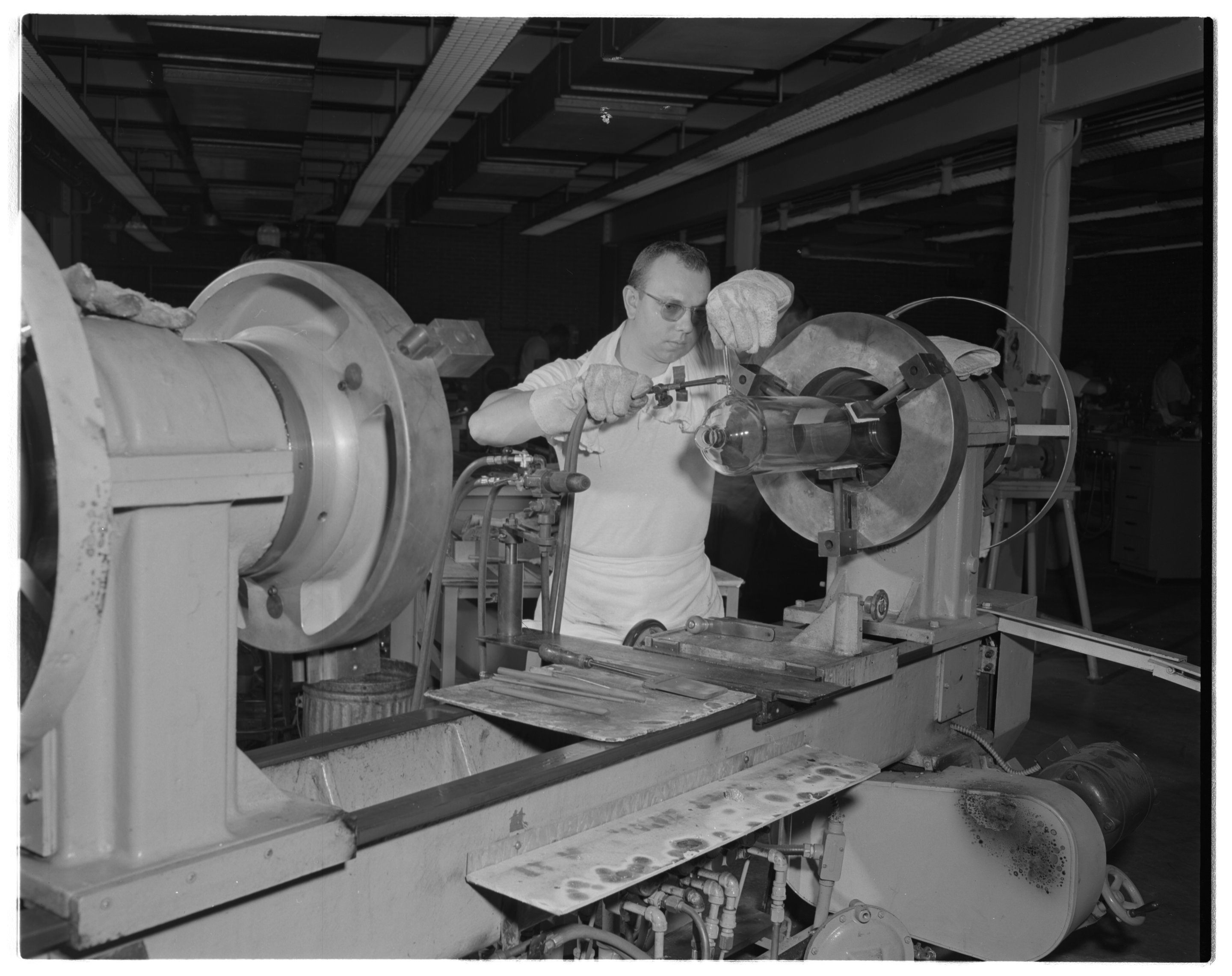 General view of Dick Kowalczyk welding a side arm onto a glass polymerizer manufactured in the Dow Chemical Company's Glass Fabrication department. Founded in 1925, the department was responsible for the fabrication and repair of specialty glass equipment used at the Company's plant in Midland, Michigan.