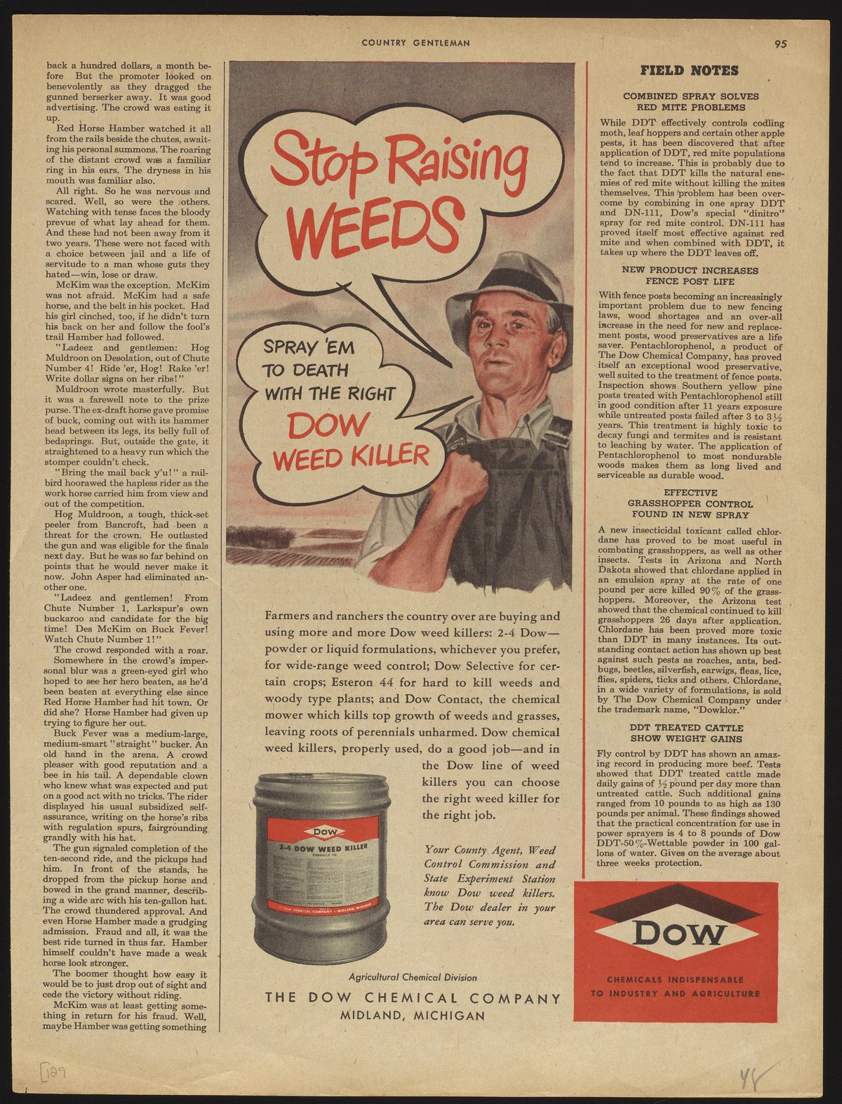 Dow Chemical Company. “Stop Raising Weeds: Spray 'Em to Death with the Right Dow Weed Killer,” March 1948. Advertisements from the Dow Chemical Historical Collection, Box 7. Science History Institute. Philadelphia. https://digital.sciencehistory.org/works/xd07gt470.