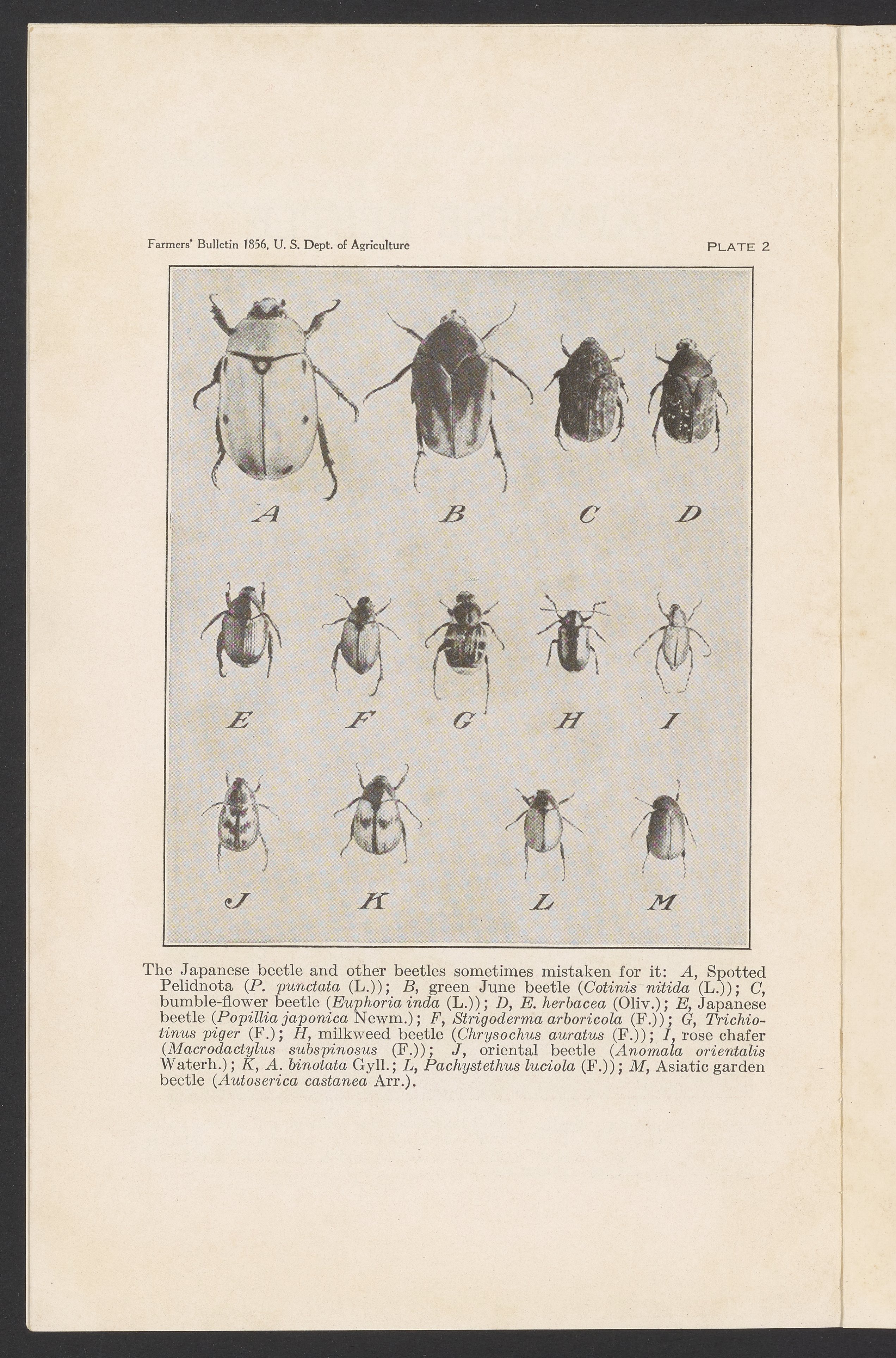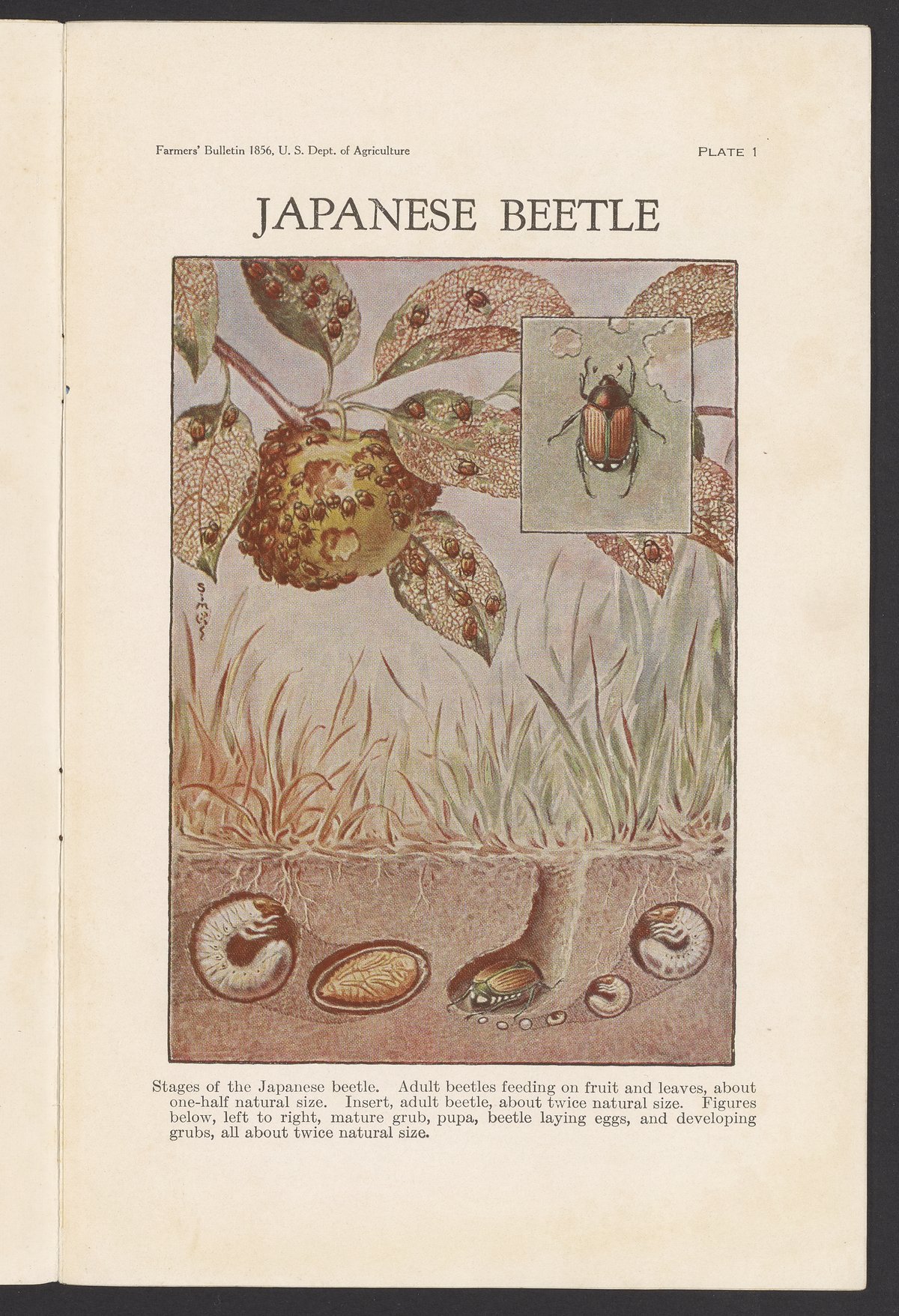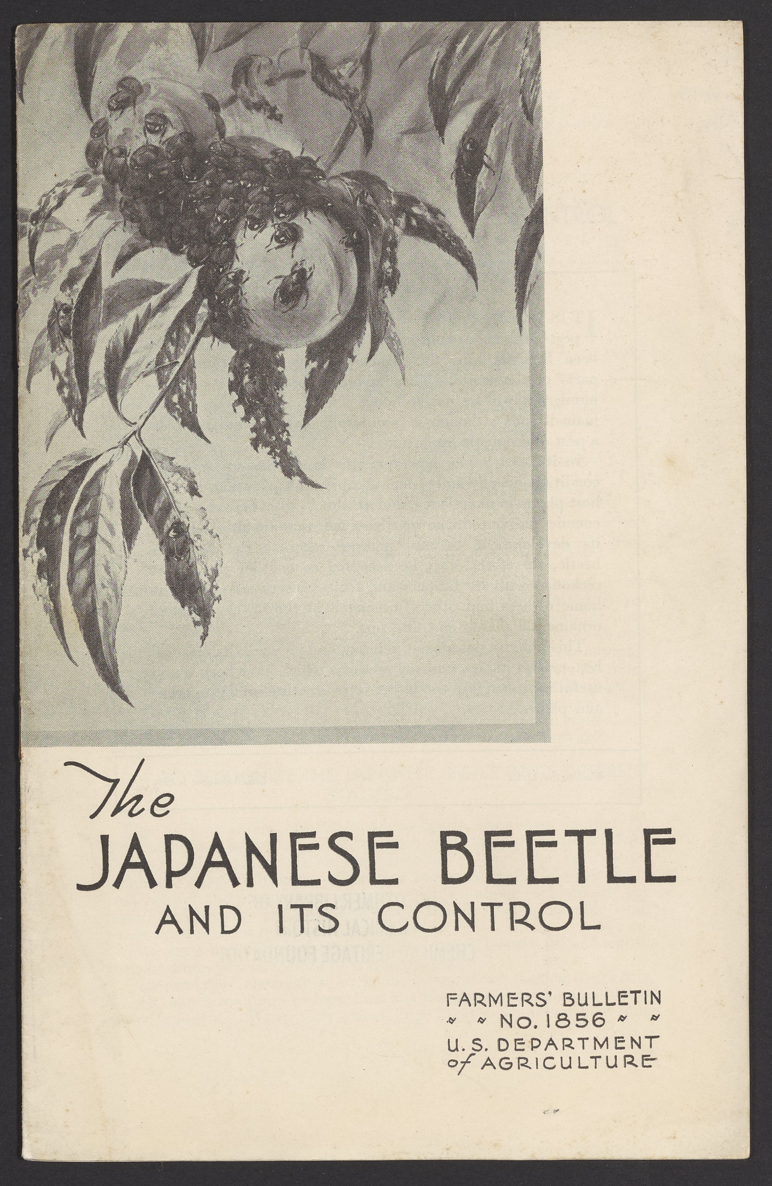 Small JPG1200 x 1843px — 544 KBFull-sized JPG2509 x 3853px — 2.3 MBOriginal fileTIFF — 2509 x 3853px — 27.7 MBJournal number 1856 in the Farmers' Bulletin series published by the United States Department of Agriculture. The article describes the Japanese beetle, a pest brought to the United States from Japan, including its seasonal history, harmful habits, and the methods found useful in destroying the insect or preventing injury to crops and plants. The work includes both black and white and color illustrations. This issue was contributed to by the United States Bureau of Entomology and Plant Quarantine.