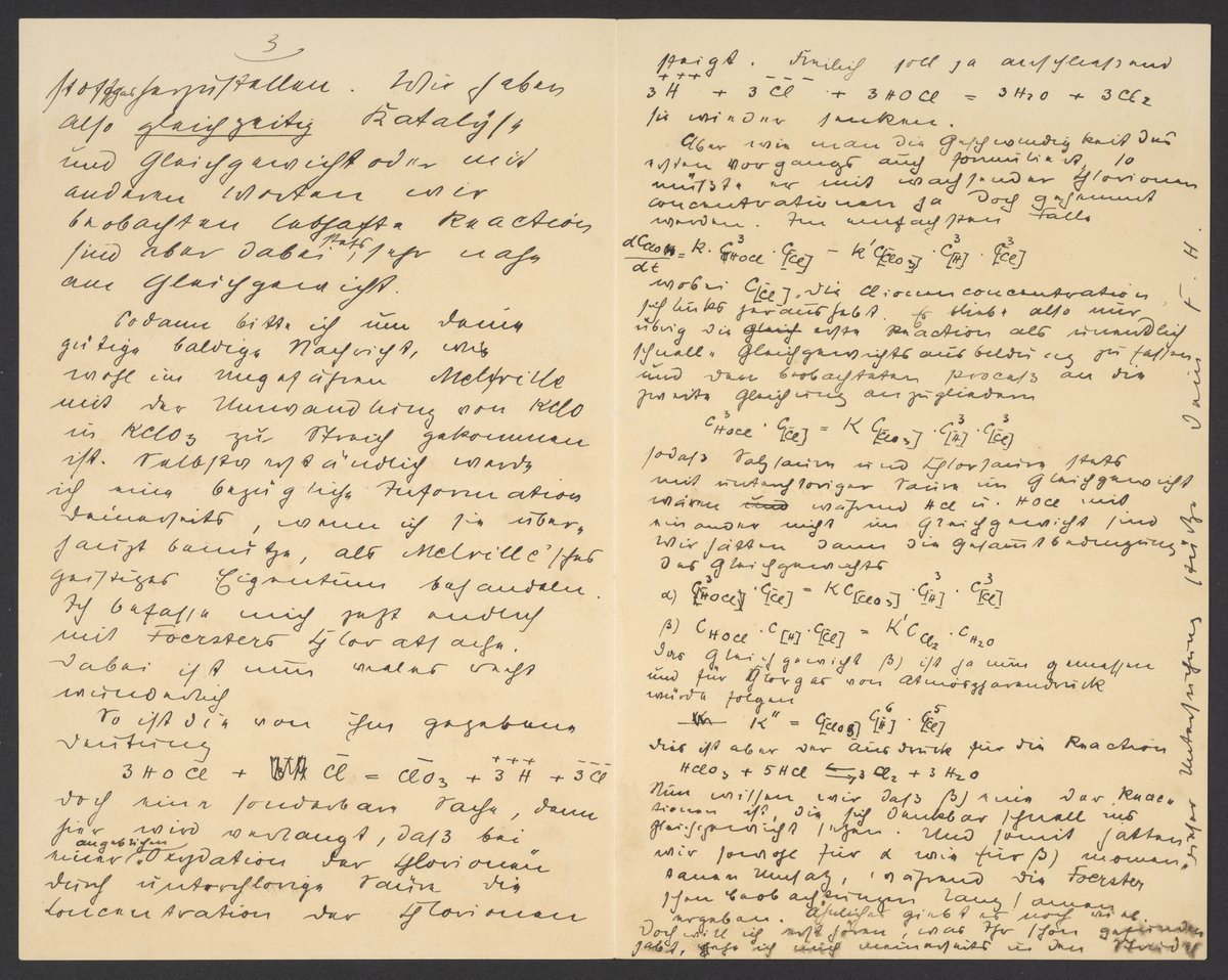 Small JPG1200 x 1851px — 315 KBLarge JPG2880 x 4443px — 1.5 MBFull-sized JPG2886 x 4452px — 1.5 MBOriginal fileTIFF — 2886 x 4452px — 36.8 MBFritz Haber (1868-1934), a German chemist and 1918 winner of the Nobel Prize for Chemistry, updates his colleague, Georg Bredig (1868-1944), on the current status of his chloride chemistry research, including an extensive discussion of Haber's recent experiments in the field. Haber inquires if Bredig knows how a "Melville" was able to transform potassium hypochlorite (KClO) into potassium chlorate (KClO3). Haber is attempting to understand "Foerster's" chlorate research and describes his issues with it to Bredig in depth.