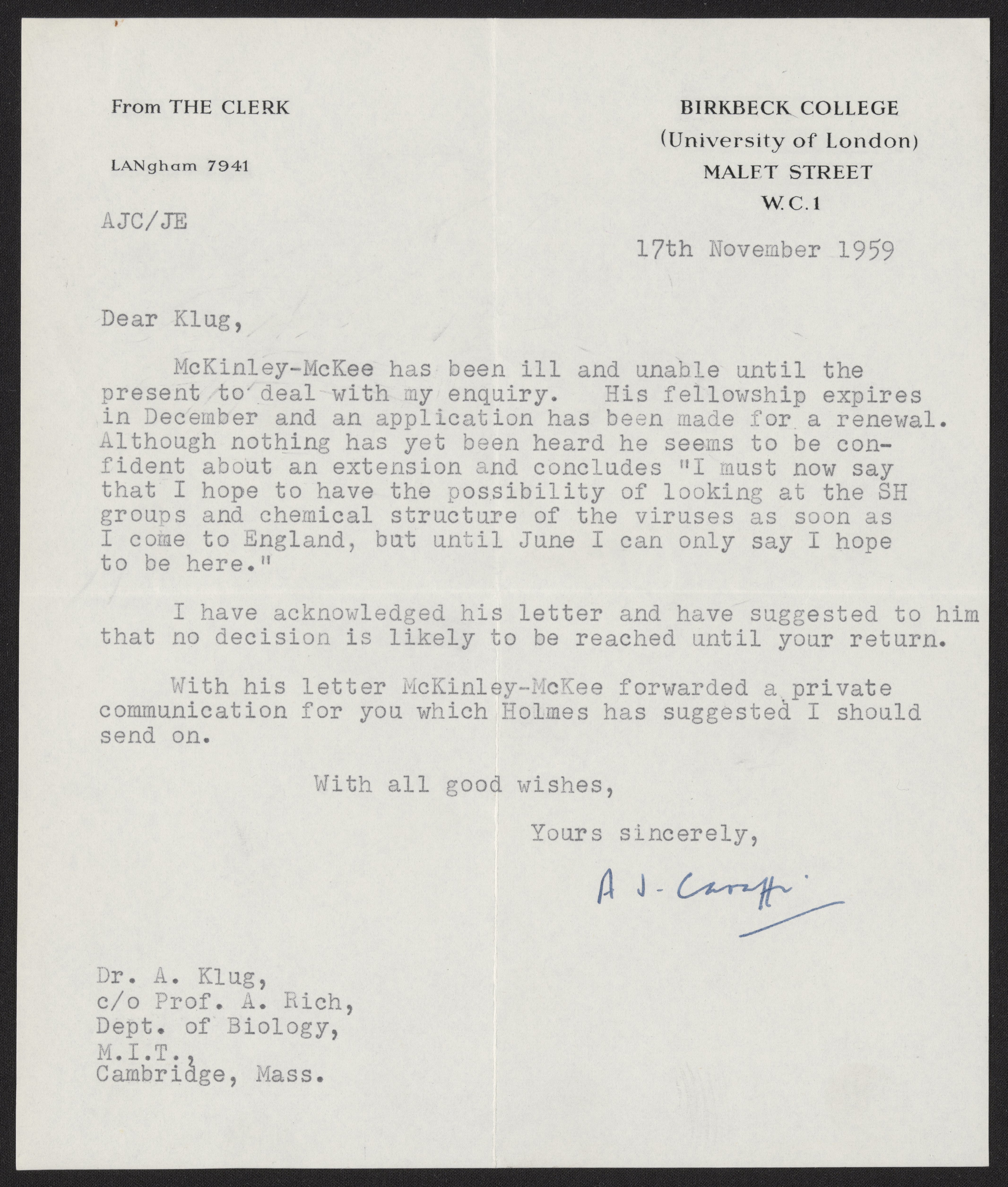 Letter from A. J. Caraffi to Aaron Klug, November 17, 1959