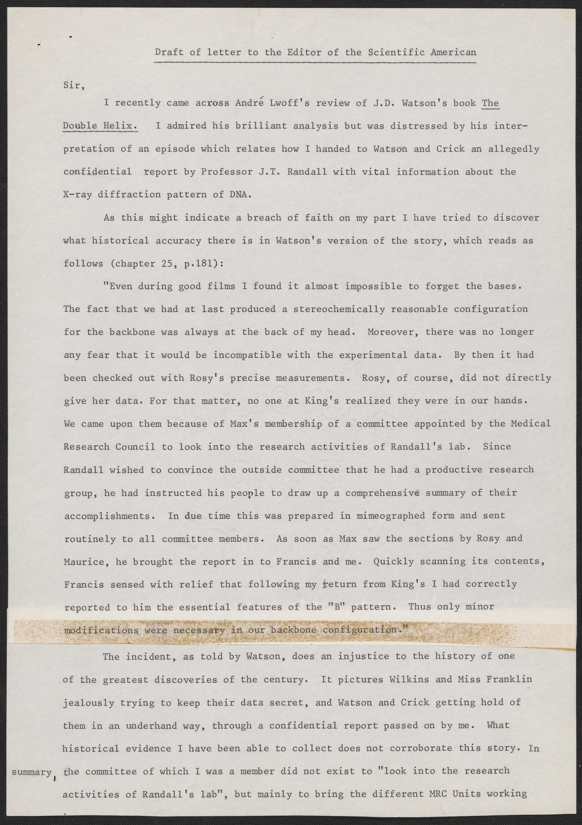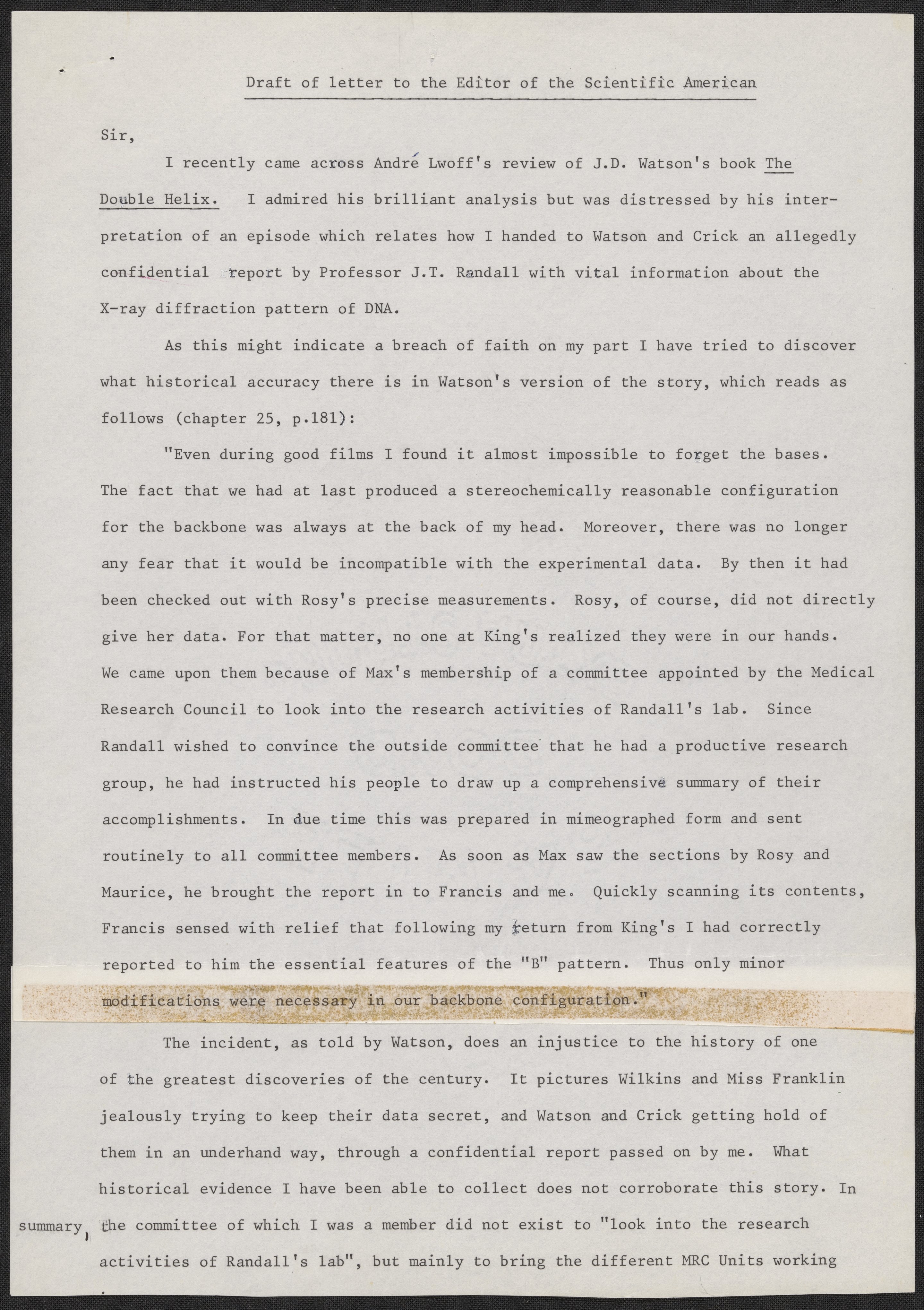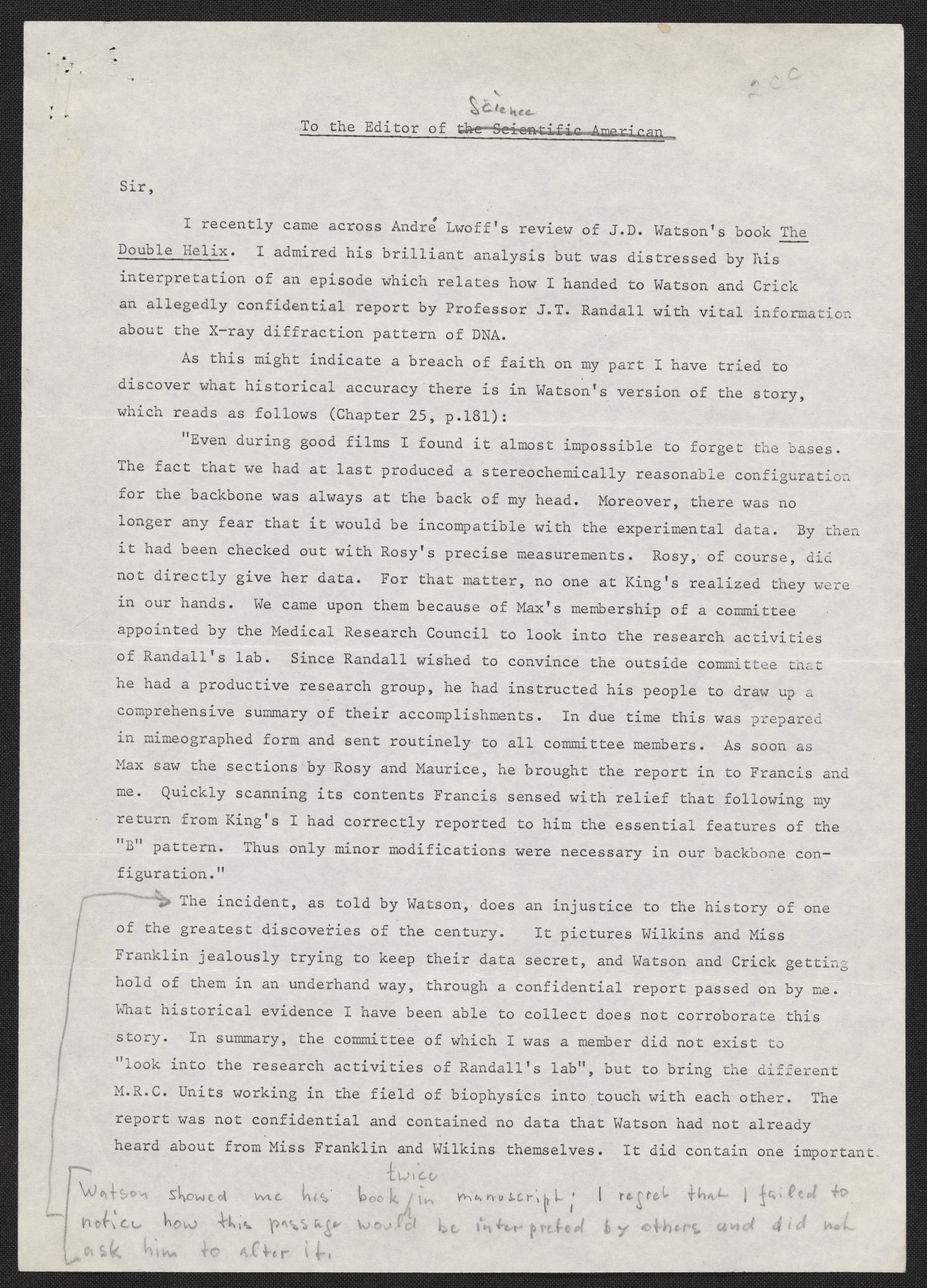 Small JPG1200 x 1701px — 351 KBLarge JPG2880 x 4081px — 1.8 MBFull-sized JPG5183 x 7345px — 5.5 MBOriginal fileTIFF — 5183 x 7345px — 109 MBDrafts of a letter to the editor of Scientific American, written by Max Perutz (1914-2002), regarding Andre Lwoff's (1902-1994) review of James D. Watson's (1928-2025) book The Double Helix.