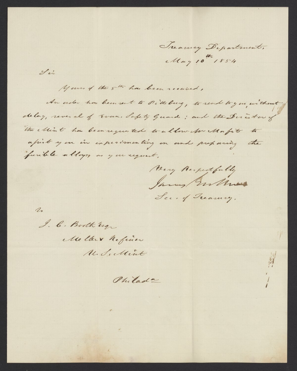Small JPG1200 x 1497px — 159 KBLarge JPG2880 x 3593px — 893 KBFull-sized JPG3309 x 4128px — 1.1 MBOriginal fileTIFF — 3309 x 4128px — 39.1 MBJames B. Guthrie (1792 - 1869), United States Secretary of the Treasury from 1853-1857, writes to James Curtis Booth (1810-1888) concerning an order of Evans Safety Guards sent to Booth from Pittsburgh.