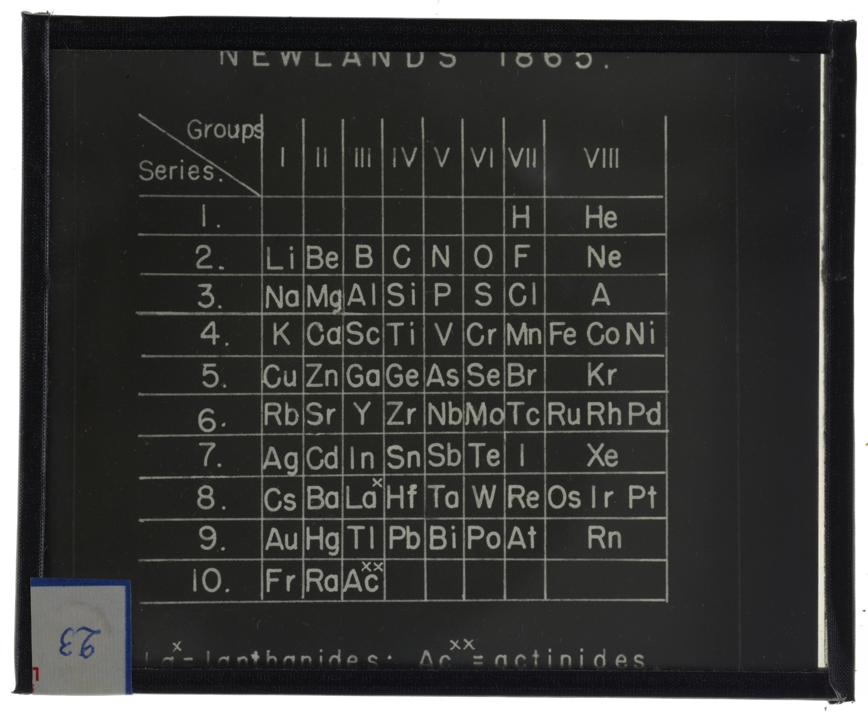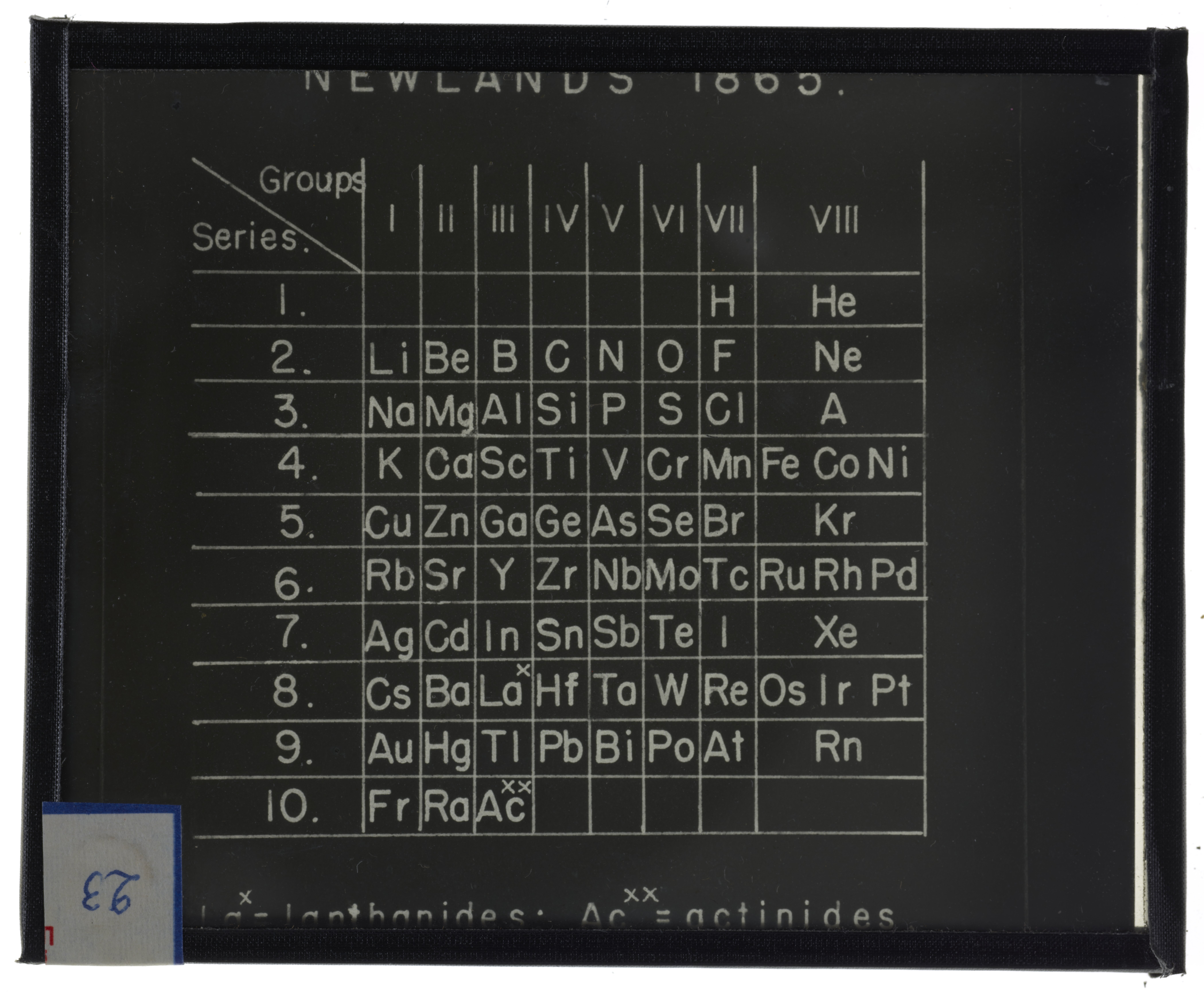 Newlands, John A. R., and Edward G. Mazurs. “Series Table Based on Law of Octaves.” Glass (material), circa 1865–1957. Edward G. Mazurs Collection of Periodic Systems Images, Box 1. Science History Institute. Philadelphia. https://digital.sciencehistory.org/works/xg94hq04d.