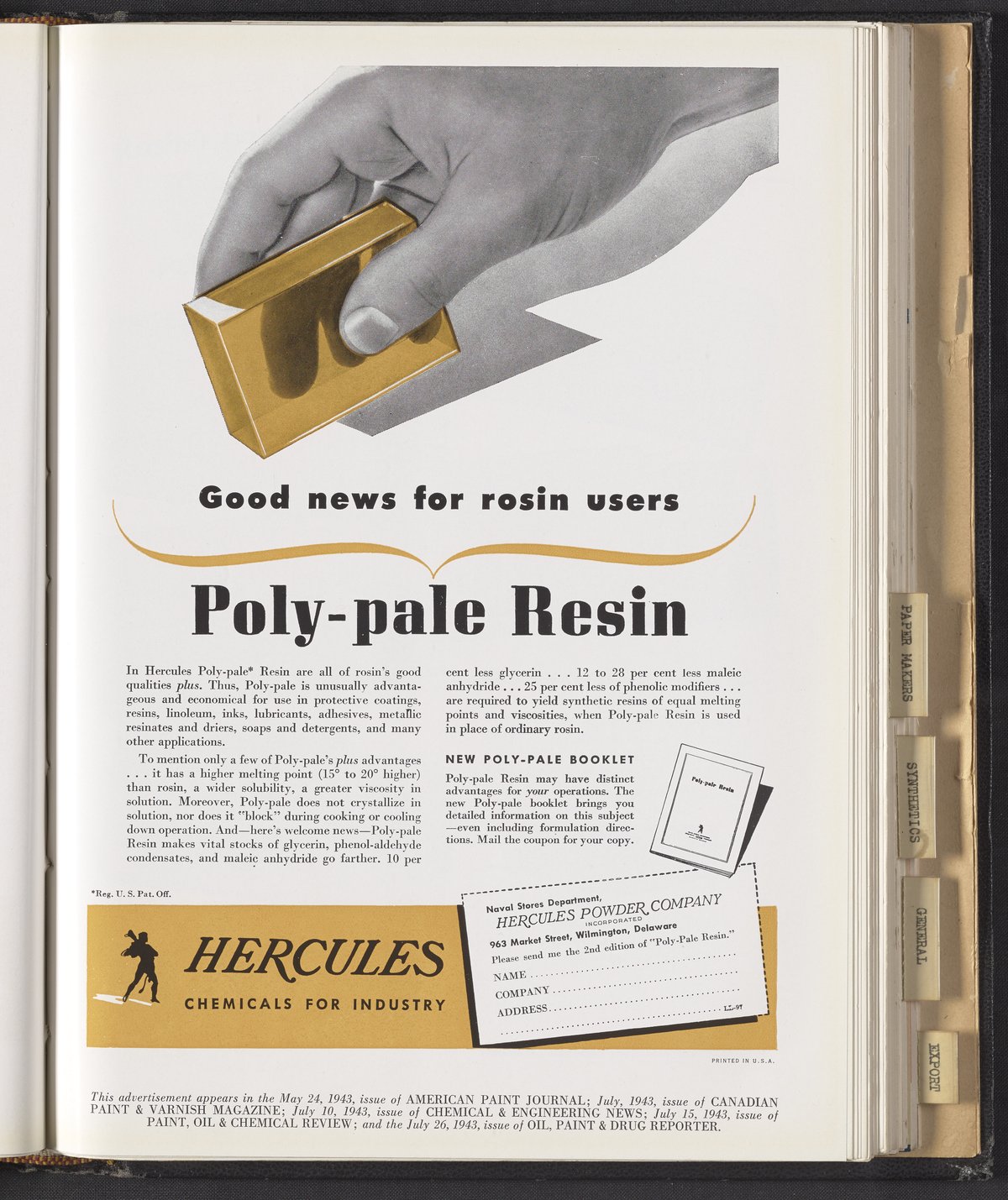 Hercules Incorporated. “Good News for Rosin Users.” 1943 Hercules Advertisements, 1943. Records of Hercules Incorporated, Volume 1943. Science History Institute. Philadelphia. https://digital.sciencehistory.org/works/xg94hq255.