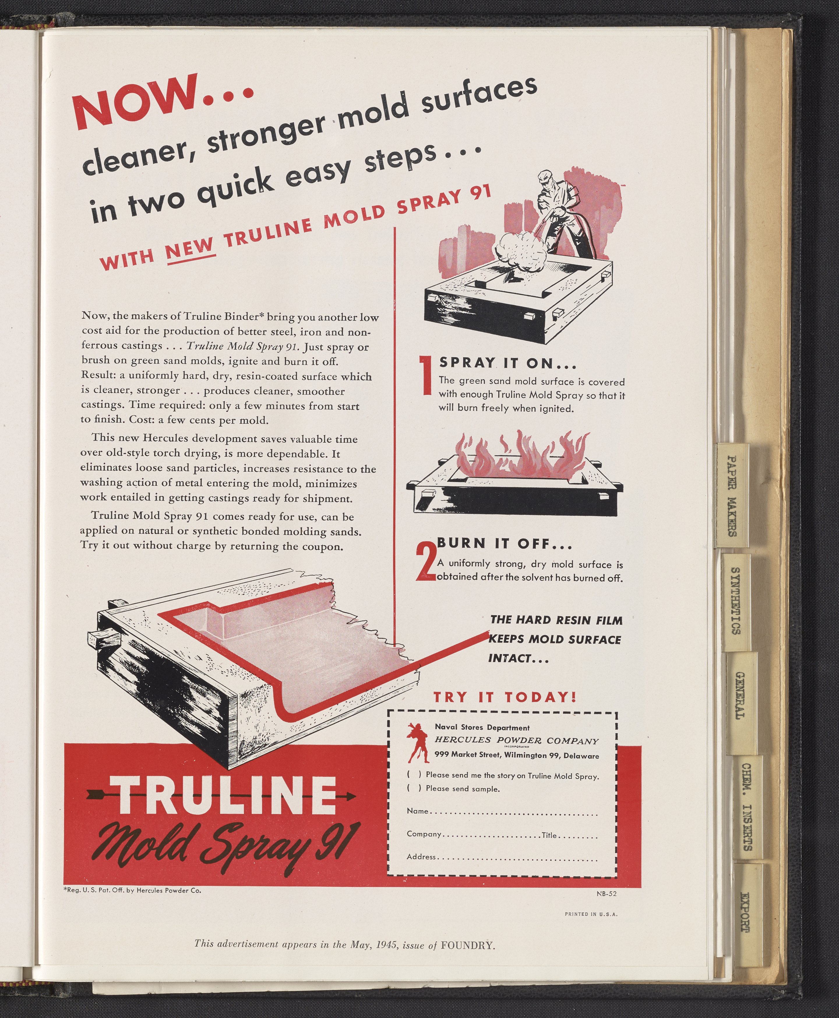 Hercules Incorporated. “Now...Cleaner, Stronger Mold Surfaces in Two Quick Easy Steps...” 1945 Hercules Advertisements, 1945. Records of Hercules Incorporated, Volume 1945. Science History Institute. Philadelphia. https://digital.sciencehistory.org/works/xg94hq27q.