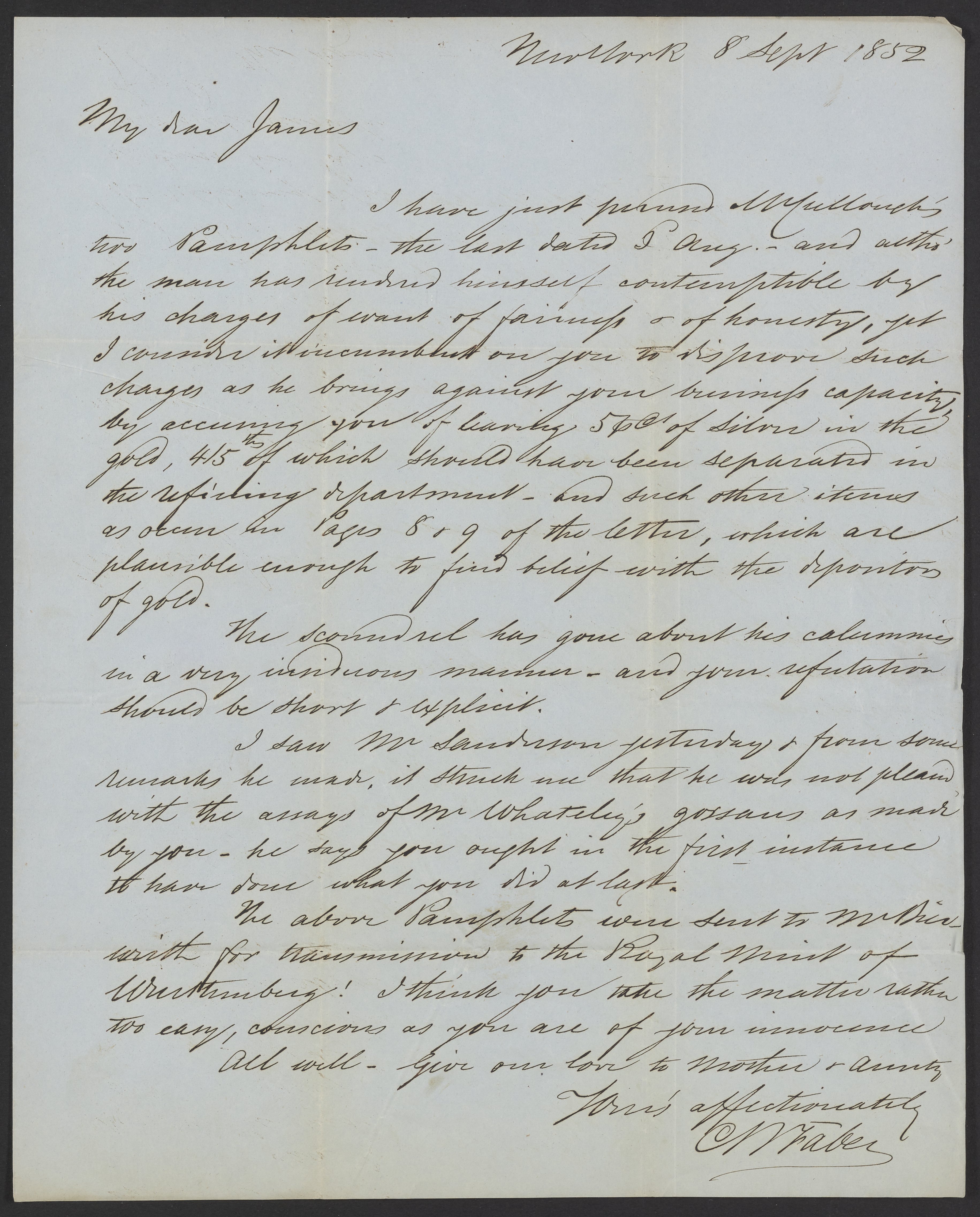 Small JPG1200 x 1490px — 325 KBLarge JPG2880 x 3575px — 1.4 MBFull-sized JPG3662 x 4546px — 2.1 MBOriginal fileTIFF — 3662 x 4546px — 47.7 MBWritten to James Curtis Booth (1810-1888) from his brother-in-law, Conrad W. Faber concerning charges leveled against Booth by Richard Sears McCulloh (1818 – 1894). Booth allegedly left 5% silver content in with refined gold, 4/5 of which should have been separated out by the Refining Department.