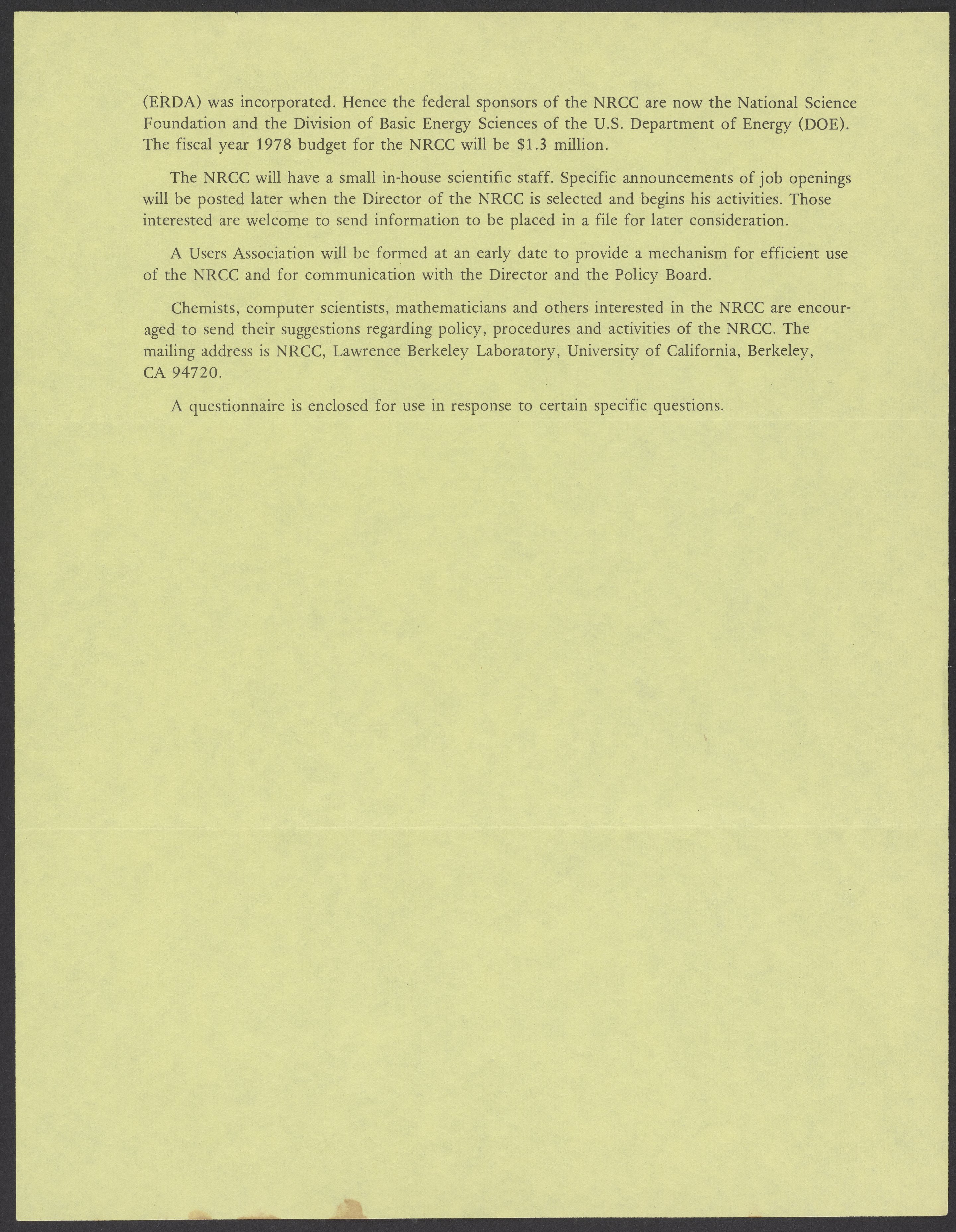 Small JPG1200 x 1537px — 351 KBLarge JPG2880 x 3690px — 1.8 MBFull-sized JPG5380 x 6893px — 5.9 MBOriginal fileTIFF — 5380 x 6893px — 106 MBVolume 1, no. 1 (October 1977) issue of the Bulletin of the National Resource for Computation in Chemistry (NRCC). Included in the bulletin is a questionnaire and list of the members of the NRCC policy board. 4 volumes of the Bulletin of were published; it ended with volume 4, no. 1 (Spring 1981)