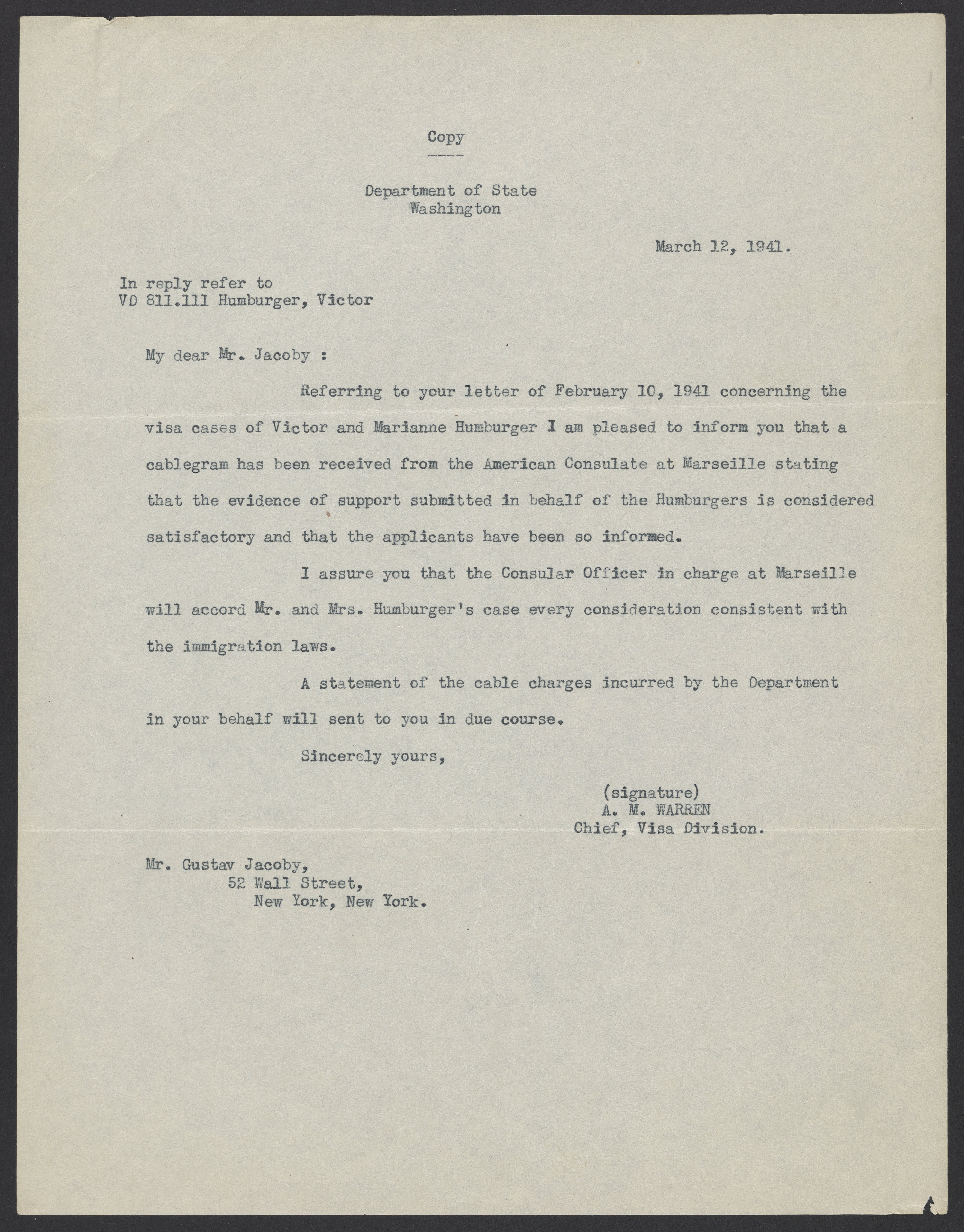 A. M. Warren, United States Department of State chief of immigration visas, informs Gustav Jacoby that the appropriate paperwork has been received and approved by the American Consulate of Marseille for the immigration of Marianne (1903-1986) and Viktor Homburger (1888-1968).