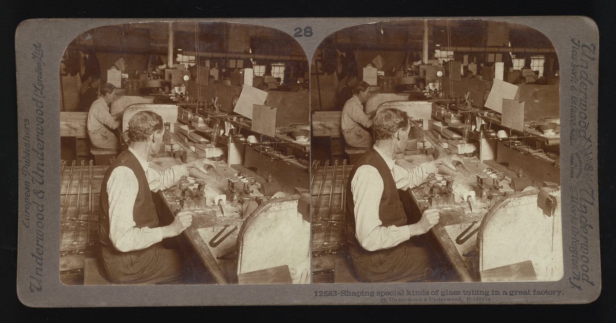 “Shaping Special Kinds of Glass Tubing in a Great Factory.” Underwood & Underwood, n.d. Underwood & Underwood Stereographs of Manufacturing Industries. Science History Institute. Philadelphia. https://digital.sciencehistory.org/works/xk81jk36q.