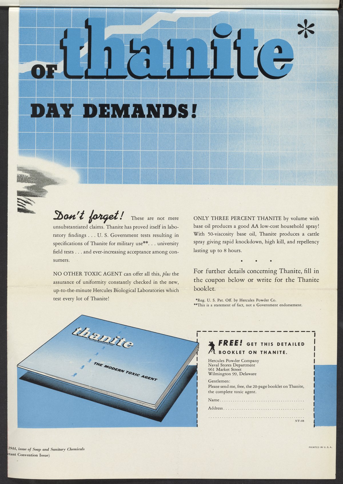 Hercules Incorporated. “Increased Production of Thanite to Meet Present-Day Demands!” 1944 Hercules Advertisements, 1944. Records of Hercules Incorporated, Volume 1944. Science History Institute. Philadelphia. https://digital.sciencehistory.org/works/xk81jm17q.