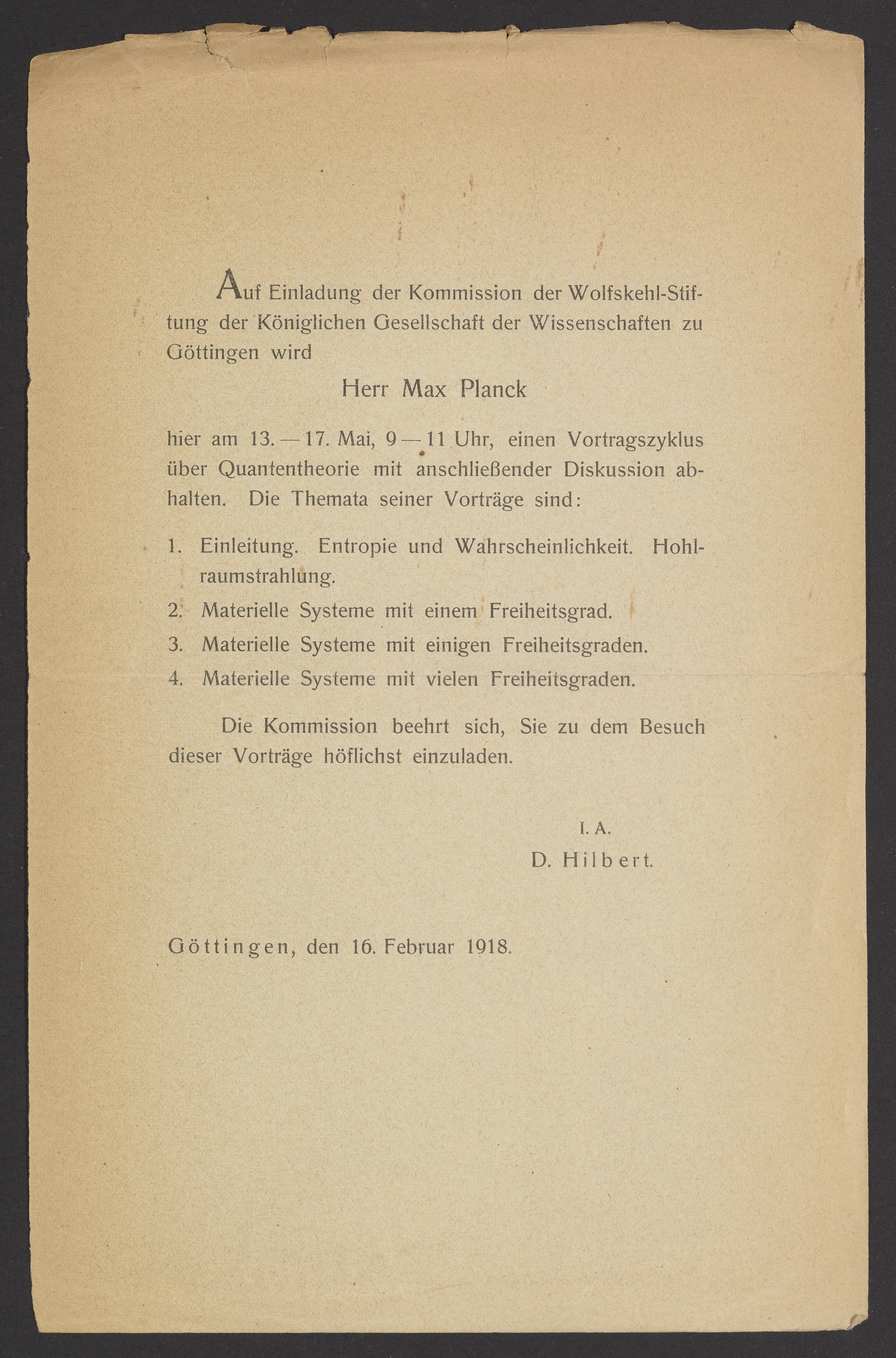 Upon invitation from the Commission of the Wolfskehl Foundation of the Royal Society of Sciences in Göttingen, Mr. Max Planck will hold a lecture series here from May 13-17 from 9:00-11:00 AM on quantum theory with a concluding discussion. The topics of his lectures are: