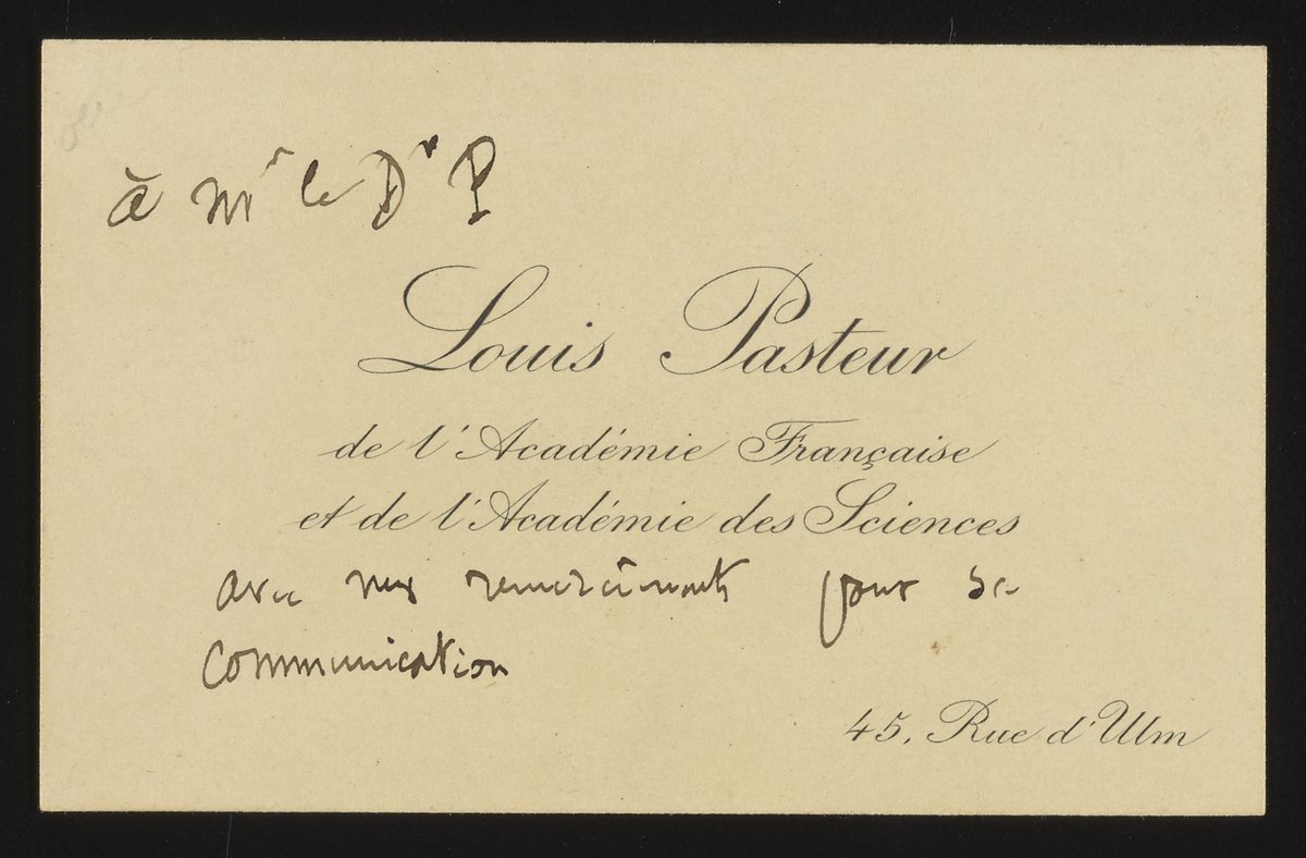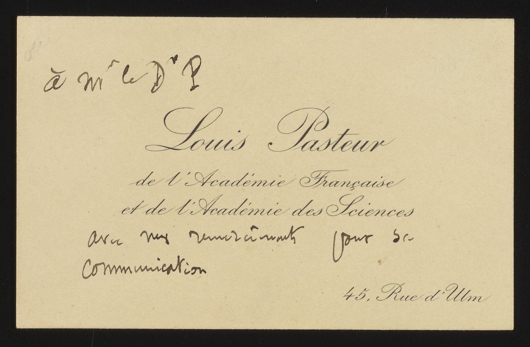 “Louis Pasteur's Personal Calling Card,” circa 1887. Fisher-Pasteur Memorial Collection, Box 1, Folder 24. Science History Institute. Philadelphia. https://digital.sciencehistory.org/works/xp68kg31v.