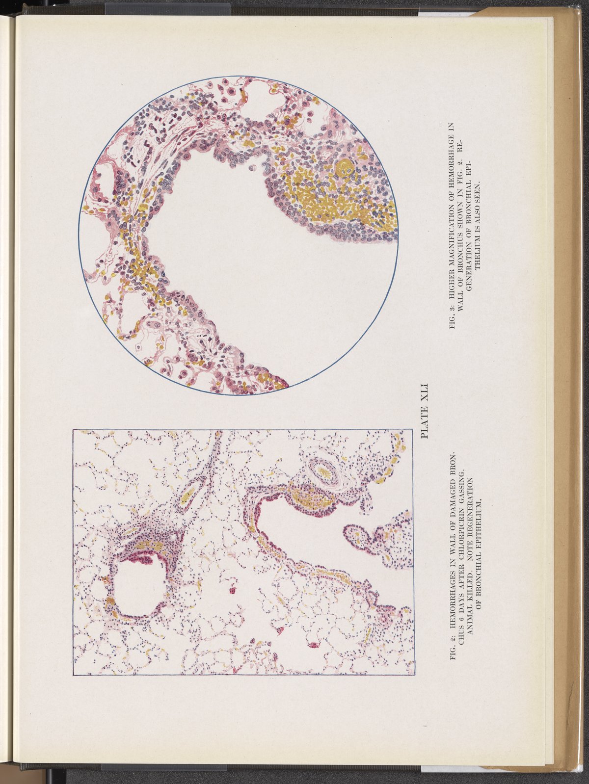 Winternitz, M. C. (Milton C.). “Plate XLI (Fig. 2): Hemorrhages in Wall of Damaged Bronchus 6 Days after Chlorpicrin Gassing. (Fig. 3) Higher Magnification of Hemorrhage in Wall of Bronchus Shown in Fig. 2.” Collected Studies on the Pathology of War Gas Poisoning. New Haven, Connecticut: Yale University Press, 1920. https://digital.sciencehistory.org/works/xp68kg392.