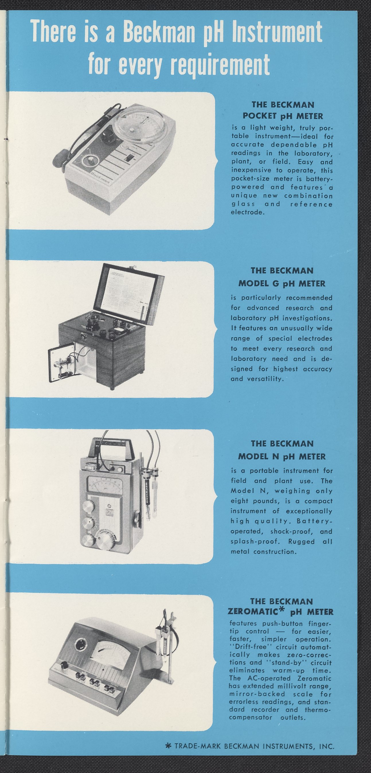 Small JPG1200 x 2381px — 304 KBFull-sized JPG1365 x 2708px — 376 KBOriginal fileTIFF — 1365 x 2708px — 10.6 MBThe brochure outlines the importance of pH, Beckman's expertise, and several instruments: the Pocket pH meter, the Model G, the Model N, and the Zeromatic pH meter.