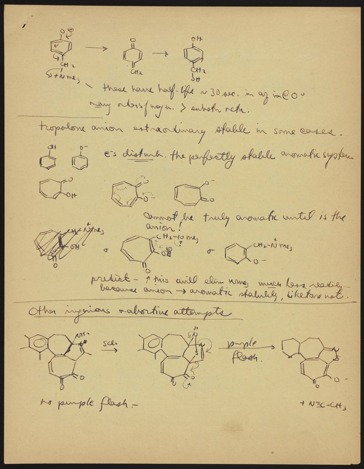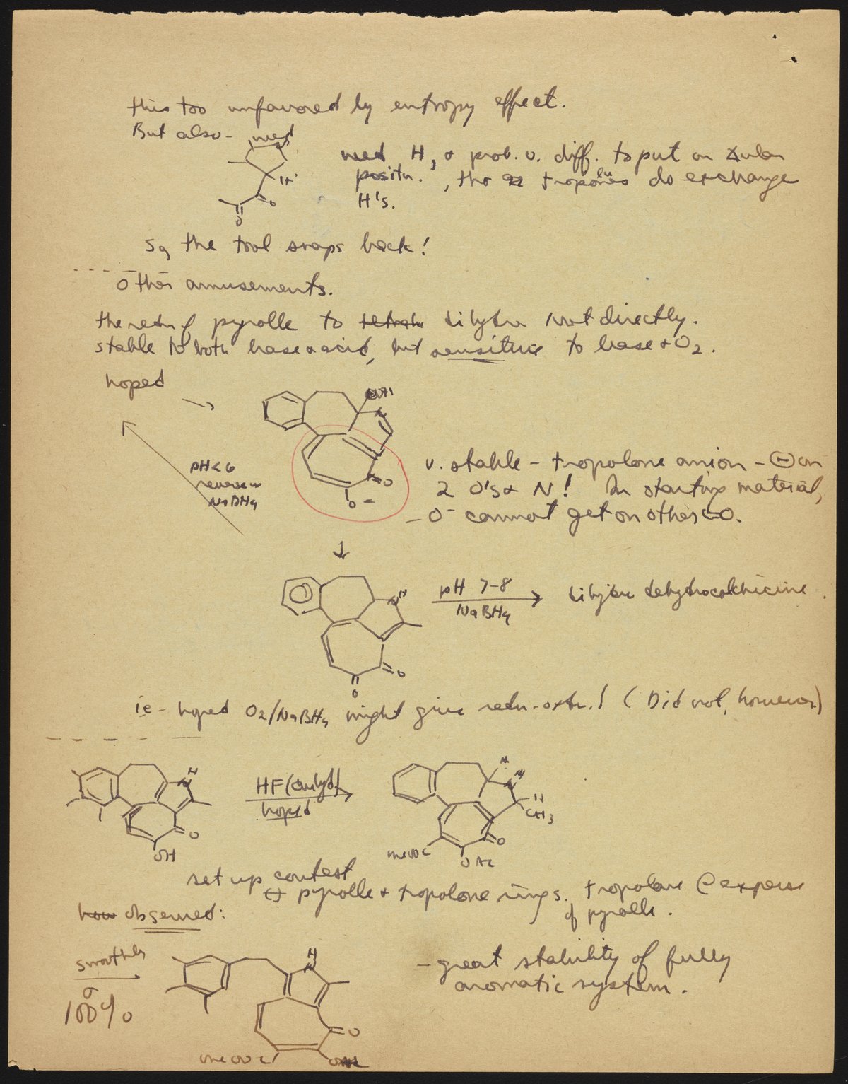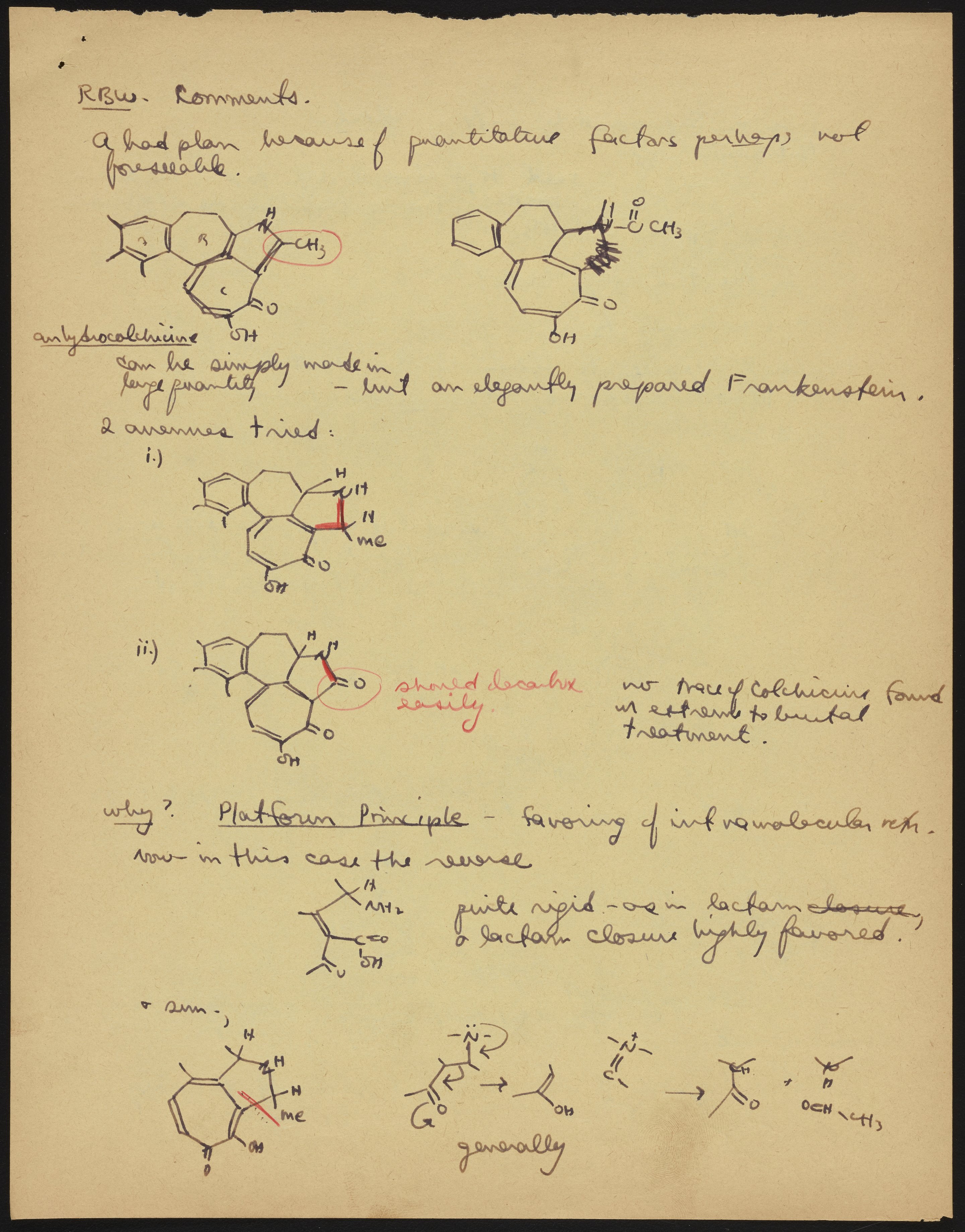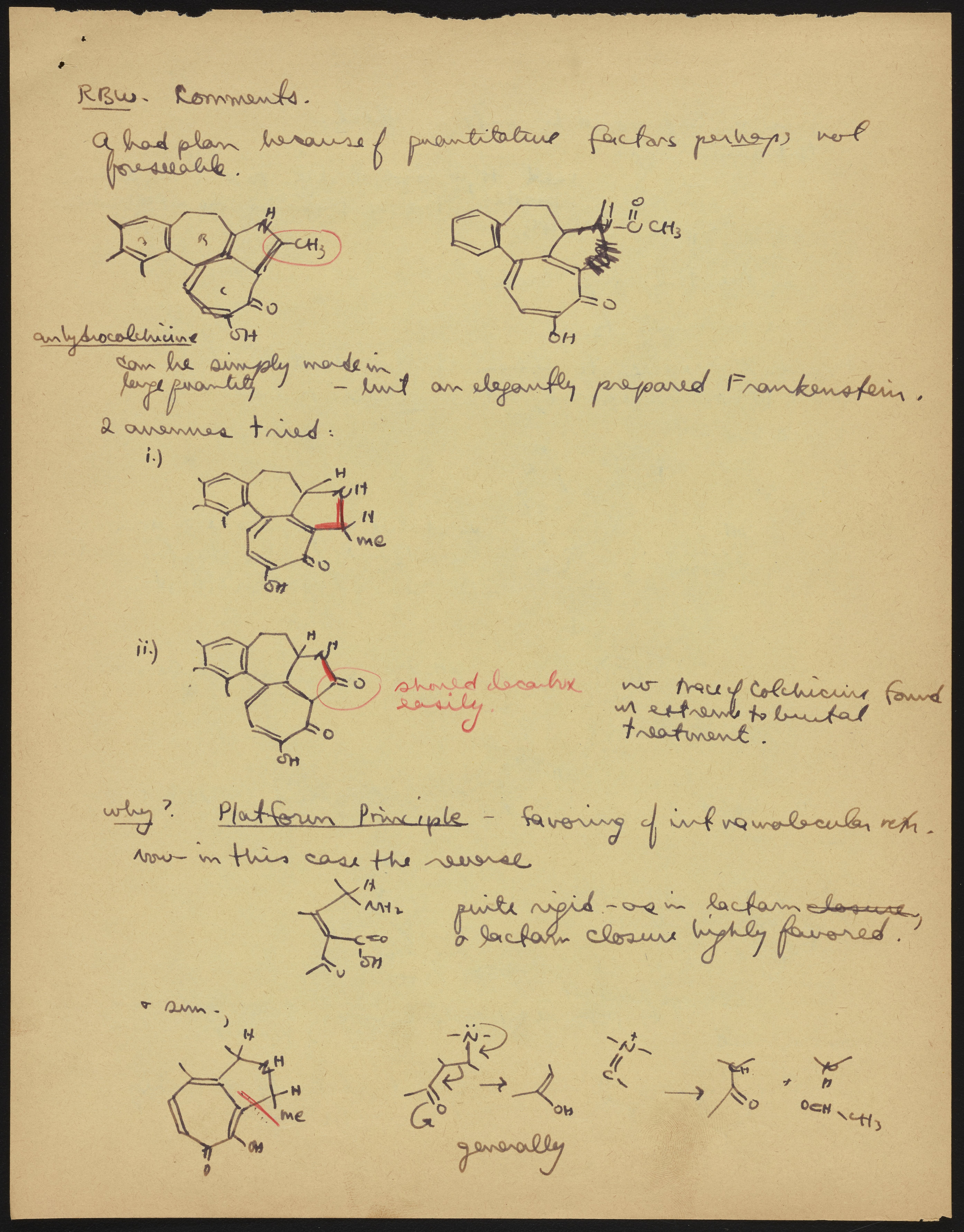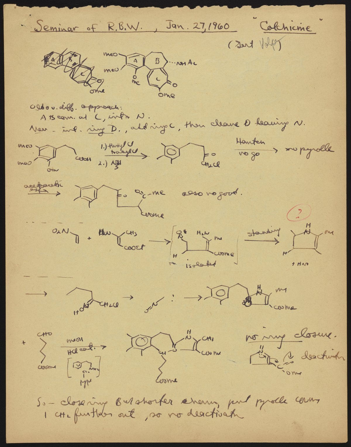 Kohler, Robert E. “R. B. (Robert Burns) Woodward Seminar Entitled ‘Colchicine.’” Notes from R. B. (Robert Burns) Woodward's Seminars, circa 1959–1966. Folder 2. Science History Institute. Philadelphia. https://digital.sciencehistory.org/works/xp68kh266.