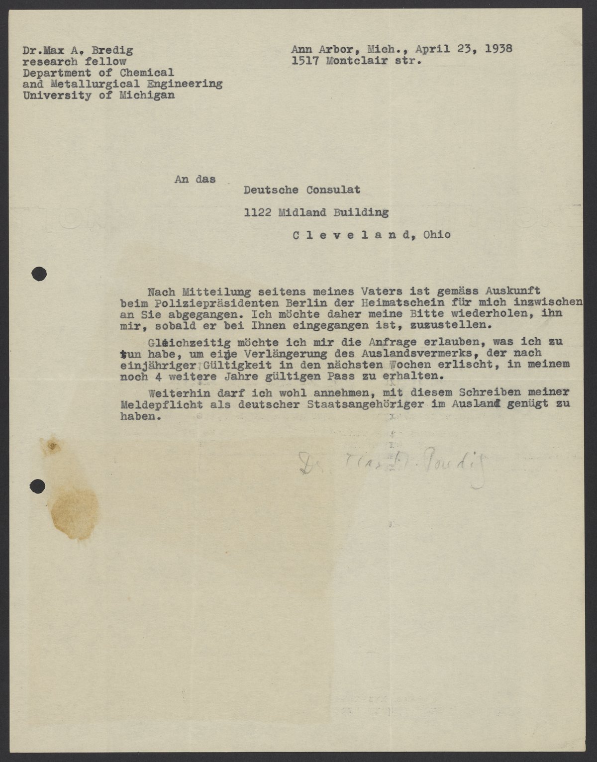 Bredig, Max Albert. “Letter from Max Bredig to the German Consulate, April 23, 1938,” April 23, 1938. Papers of Georg and Max Bredig, Box 7, Folder 37. Science History Institute. Philadelphia. https://digital.sciencehistory.org/works/xqixzlr.