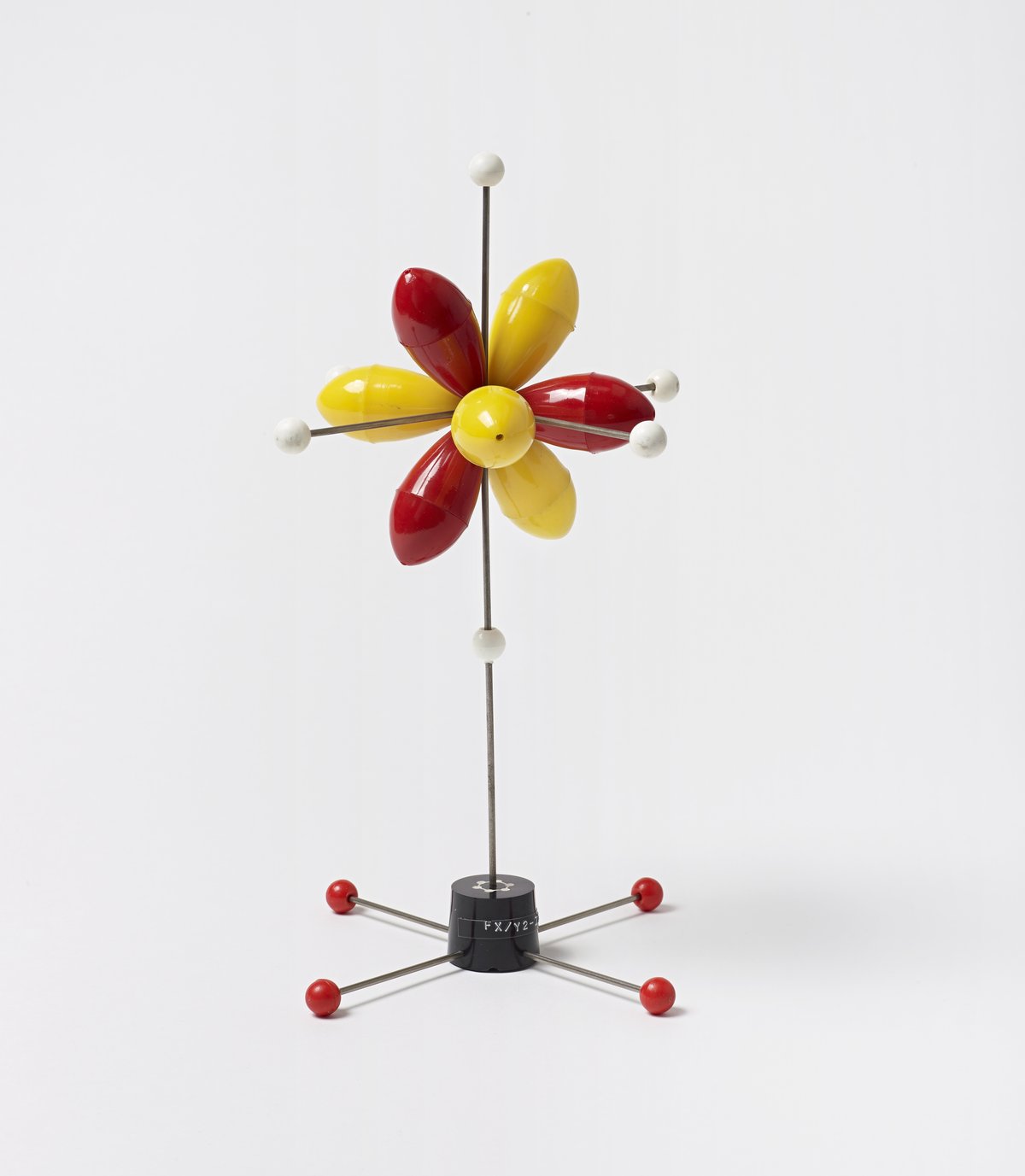 Black Bakelite cylindrical base with four steel arms giving it support; red Bakelite circles are attached to the end of each arm; the model itself is attached with a steel arm that protrudes upward from the base; model is comprised of six white Bakelite balls, four yellow Bakelite elongated spheres, and four red Bakelite elongated spheres; the yellow and red pieces all emanate from the center in varying degrees.