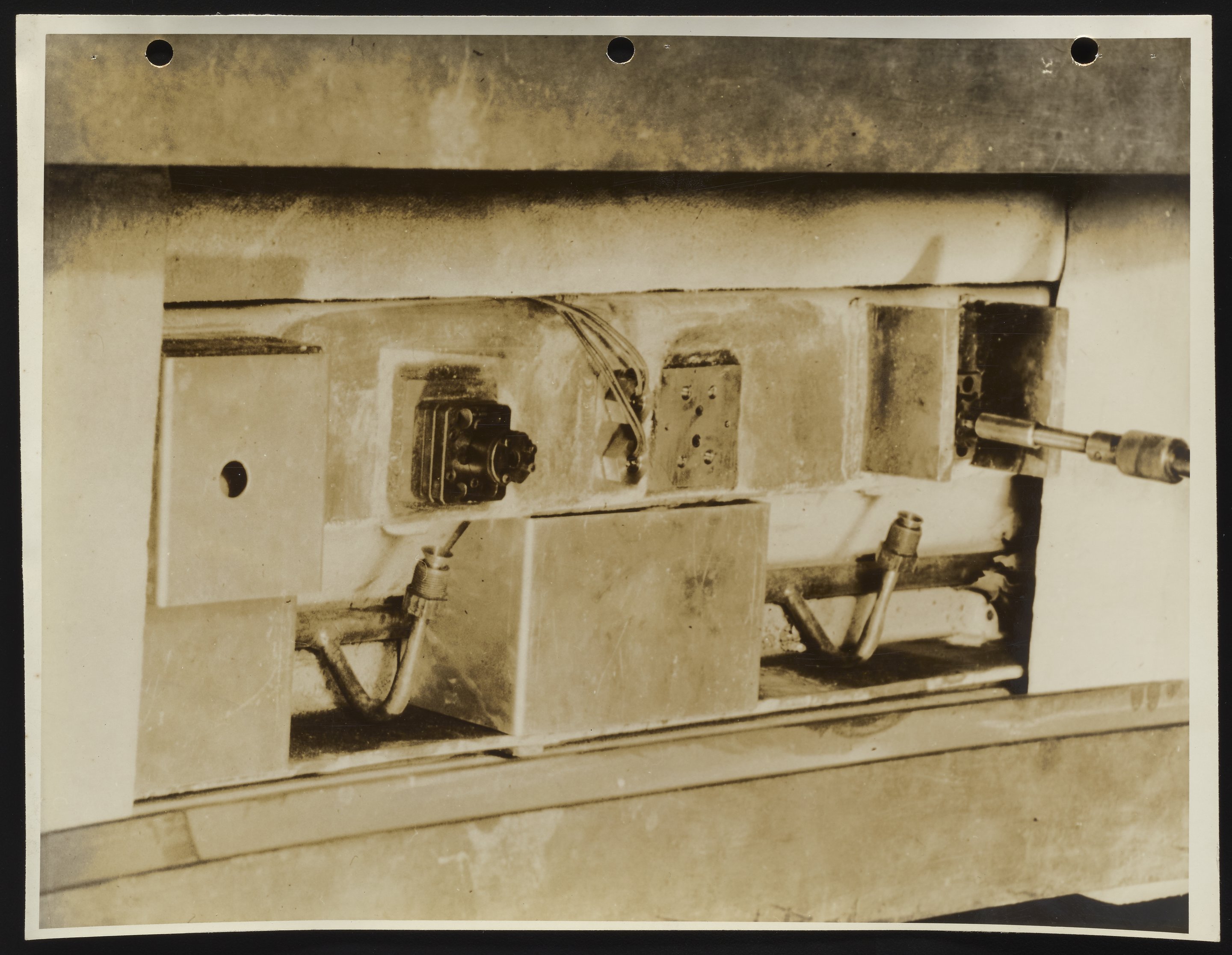 Close-up view of the pump block of a six-position spinner used during the early stages of synthetic fiber production and research at DuPont. During the production of nylon, melt from the spinning machine typically dripped into pump blocks, from where it was forced through and extruded from a steel spinneret (a small metal plate with fine holes). In this photograph, the block's insulation has been removed to show its assorted components, including pumps, pump mounting surfaces, a pump drive shaft, temperature controller, and detail of the polymer manifold.