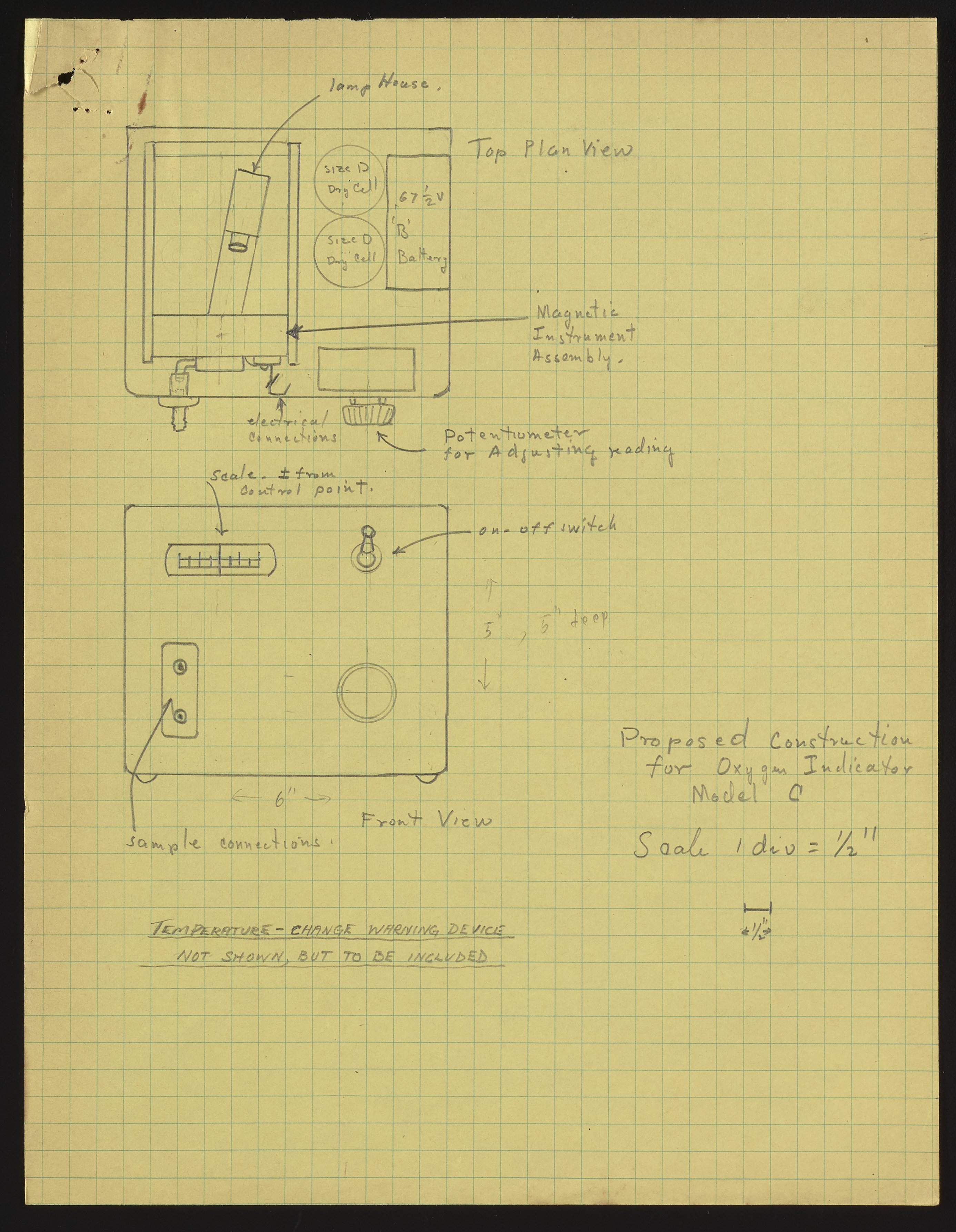 “Proposed Construction for Oxygen Indicator Model C,” circa 1944. Beckman Historical Collection, Box 19, Folder 8. Science History Institute. Philadelphia. https://digital.sciencehistory.org/works/xs55mc445.