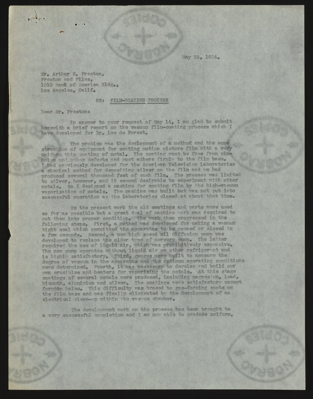 Small JPG1200 x 1528px — 352 KBFull-sized JPG2803 x 3568px — 1.8 MBOriginal fileTIFF — 2803 x 3568px — 28.7 MBArnold O. Beckman provides an overview of the vacuum film-coating process developed for Lee de Forest. The process successfully coated film with magnesium, lead, bismuth, aluminum, and silver. The letter is apparently addressed to de Forest's funding source.