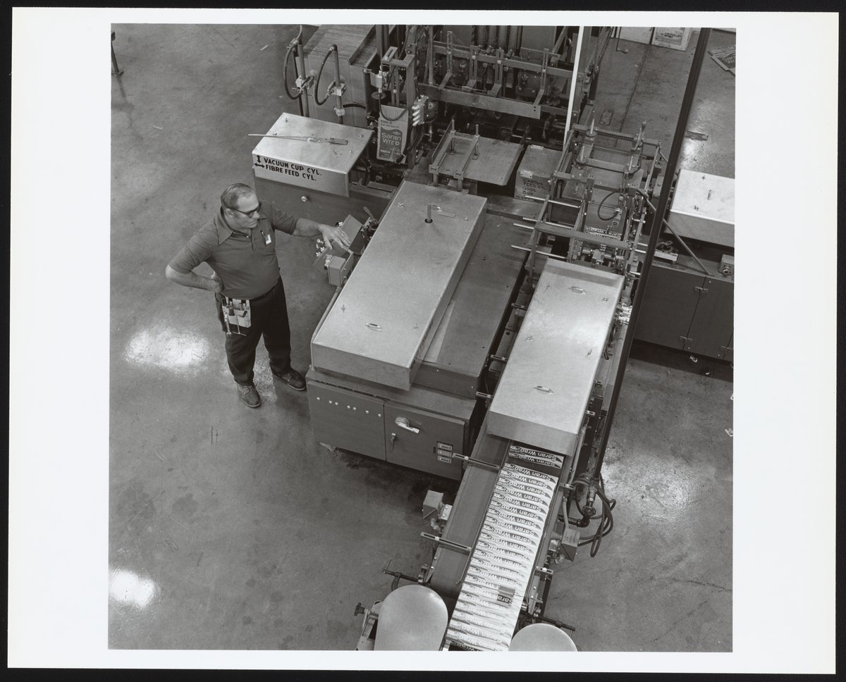 Dow Chemical Company. “Packaging of Saran Wrap at Dow Facility.” Midland, Michigan, 1972. Dow Chemical Company Historical Image Collection, Box 10, Folder Plants--Saran Production, 1952 thru 1983. Science History Institute. Philadelphia. https://digital.sciencehistory.org/works/xs55mc94c.