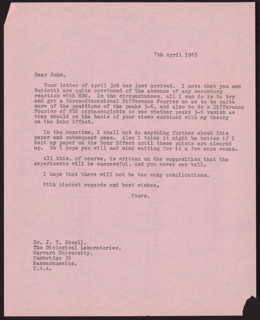 Perutz, Max F. “Letter from Max Perutz to John T. Edsall, April 7, 1965,” April 7, 1965. History of Molecular Biology Collection, Box 74, Folder 12. Science History Institute. Philadelphia. https://digital.sciencehistory.org/works/xt5y8bm.