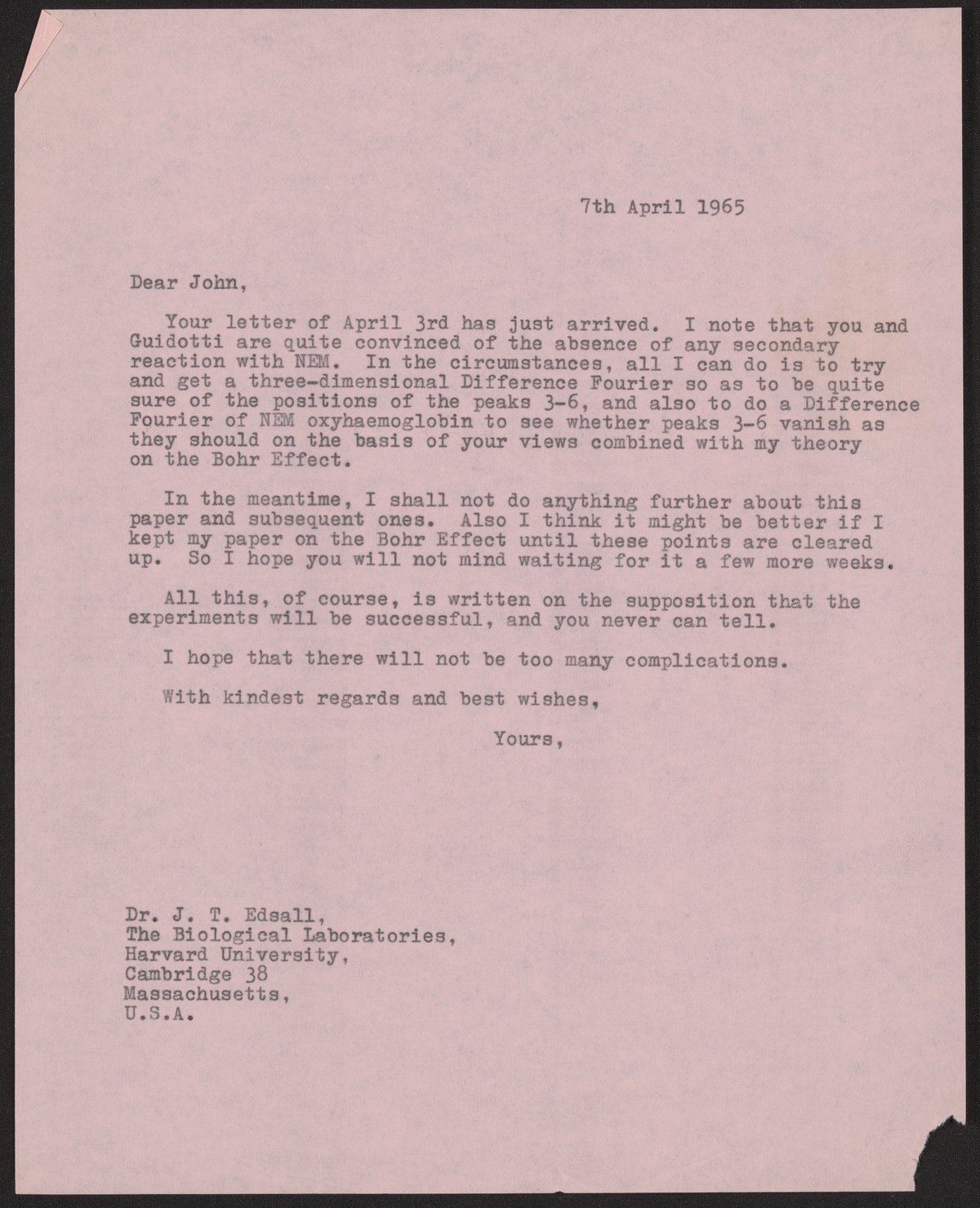 Letter from Max Perutz to John T. Edsall, April 7, 1965