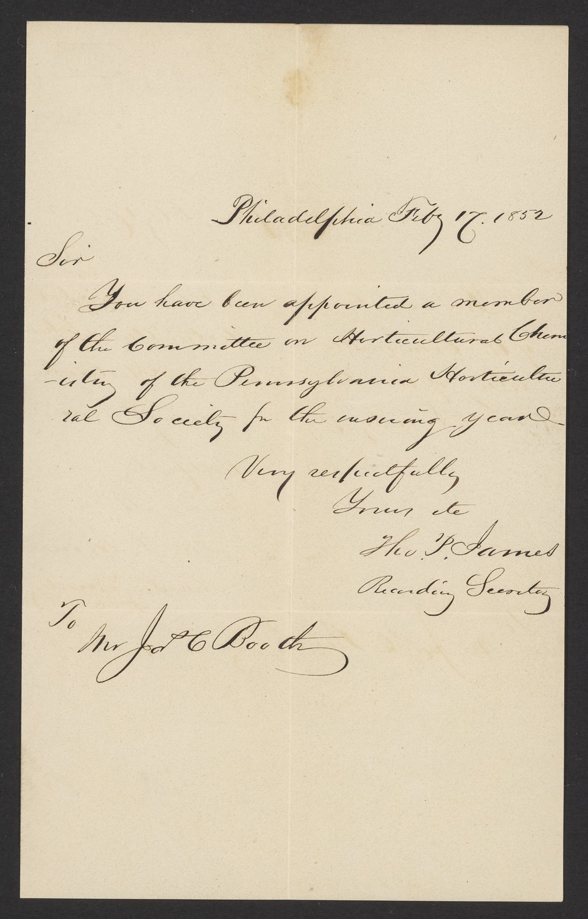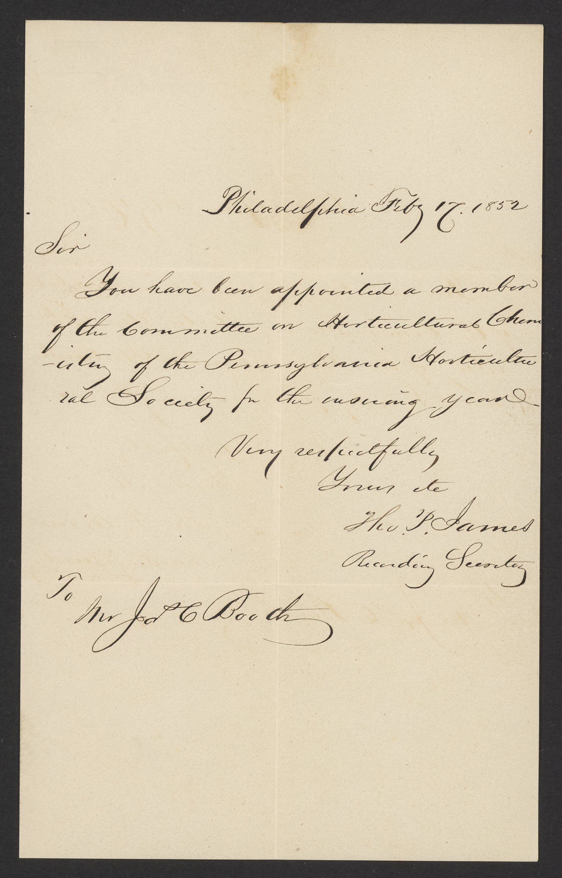 Small JPG1200 x 1875px — 297 KBFull-sized JPG1803 x 2817px — 632 KBOriginal fileTIFF — 1803 x 2817px — 14.6 MBThomas Potts James, recording secretary of the Pennsylvania Horticultural Society, writes to inform James Curtis Booth (1810-1888) that he has been appointed a member of the Committee on Horticultural Chemistry of the Society.