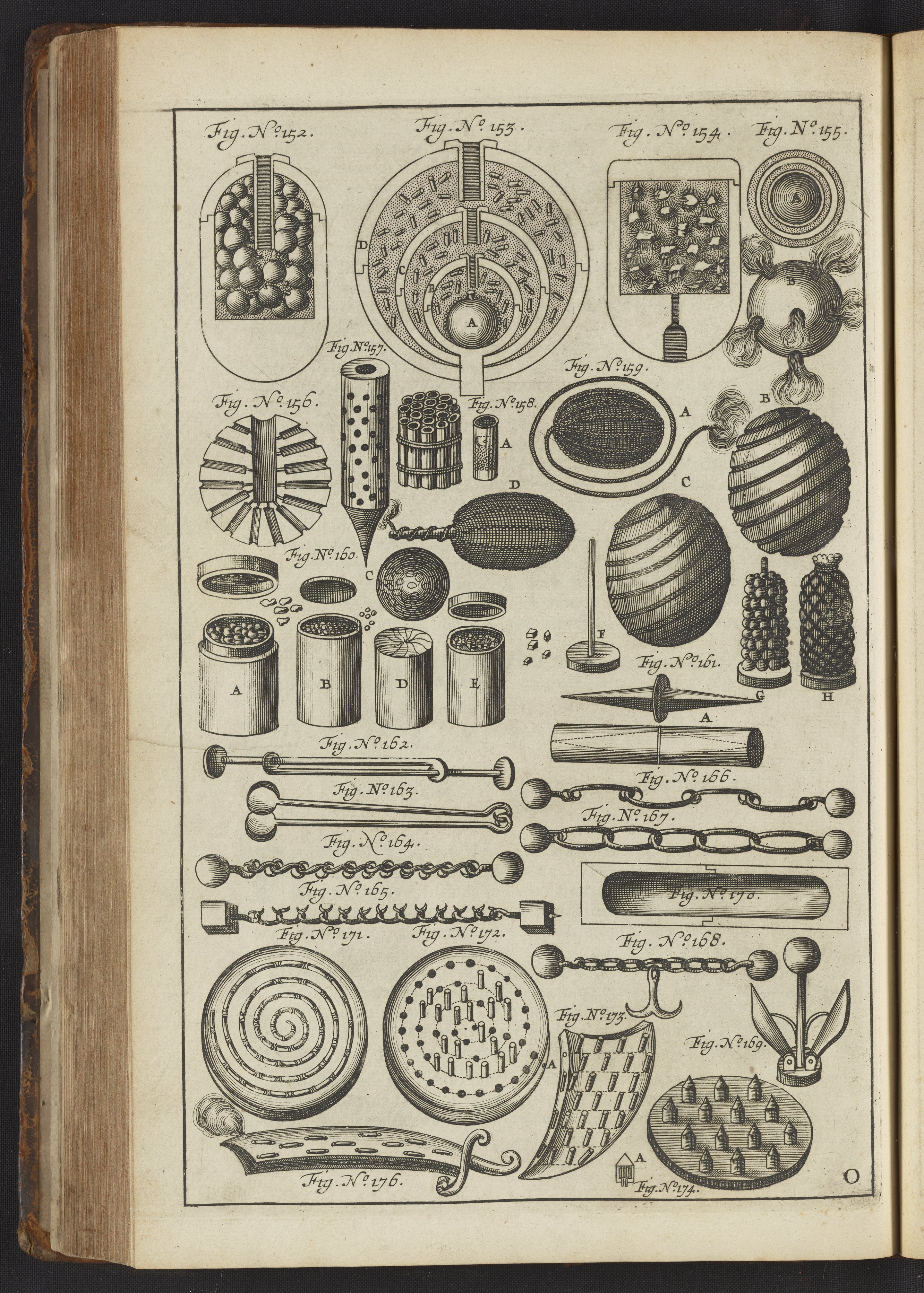 Siemienowicz, Kazimierz. “Plate O: Composite Fireball Weapons; Specialty Fireballs; Case Shot; Trundle and Chain Shot; Pyrotechnic Shields; Fire Weapon.” In Artis Magnae Artilleriae. Amsterdam, Netherlands: Jan Jansson, 1650. https://digital.sciencehistory.org/works/xw42n7934.