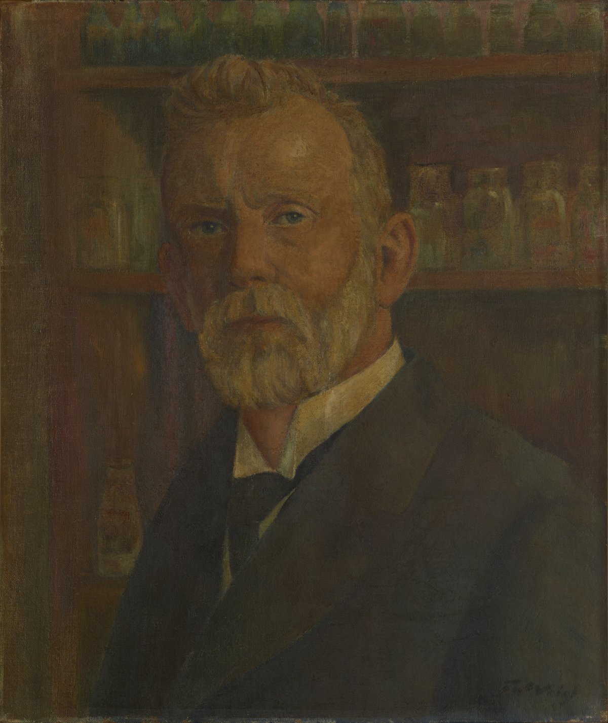 Portrait of Paul Erhlich, recipient of the 1908 Nobel Prize in Physiology or Medicine for his contributions to immunology. Ehrlich was a German Jewish physician and scientist who worked in the fields of hematology, immunology, and chemotherapy. This painting shows Ehrlich as a bearded man in late middle age, calmly contemplating the viewer as he stands before shelves of books and glassware.