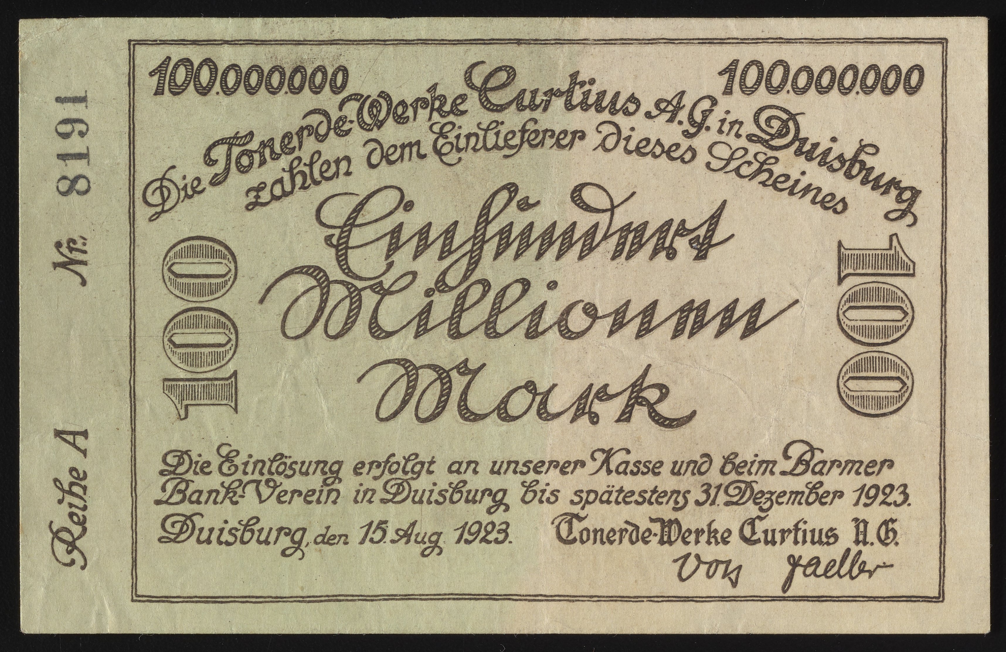 “Tonerde Werke Curtius A. G. Einhundert Millionen Mark Gutschein.” Duisburg, Germany: Curtius, August 15, 1923. Robert J. Bauman collection. Science History Institute. Philadelphia. https://digital.sciencehistory.org/works/xw42n885n.