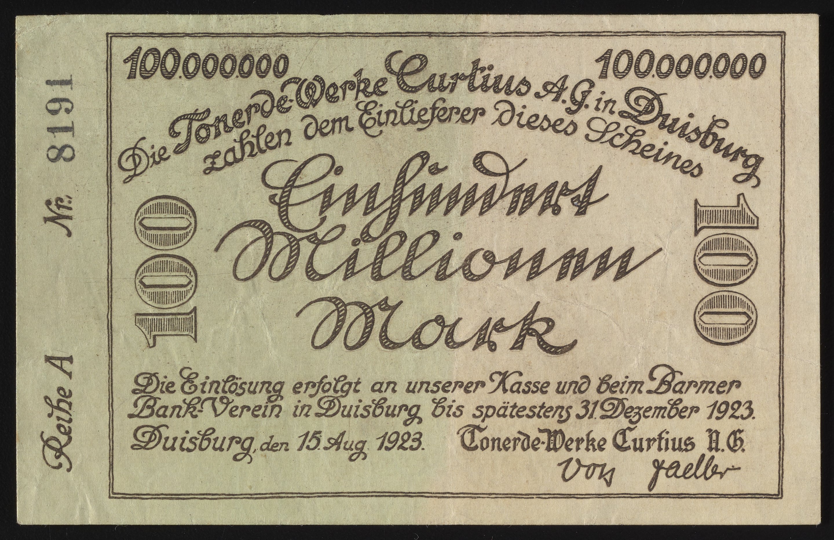 Curtius Clay Works A. G. one hundred million Mark voucher