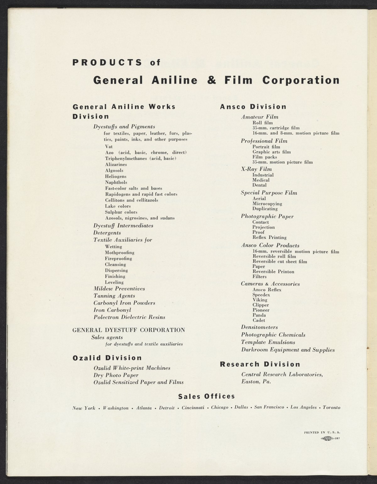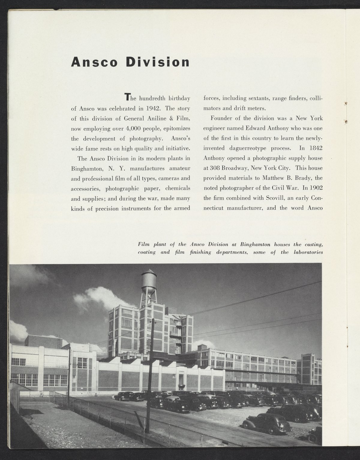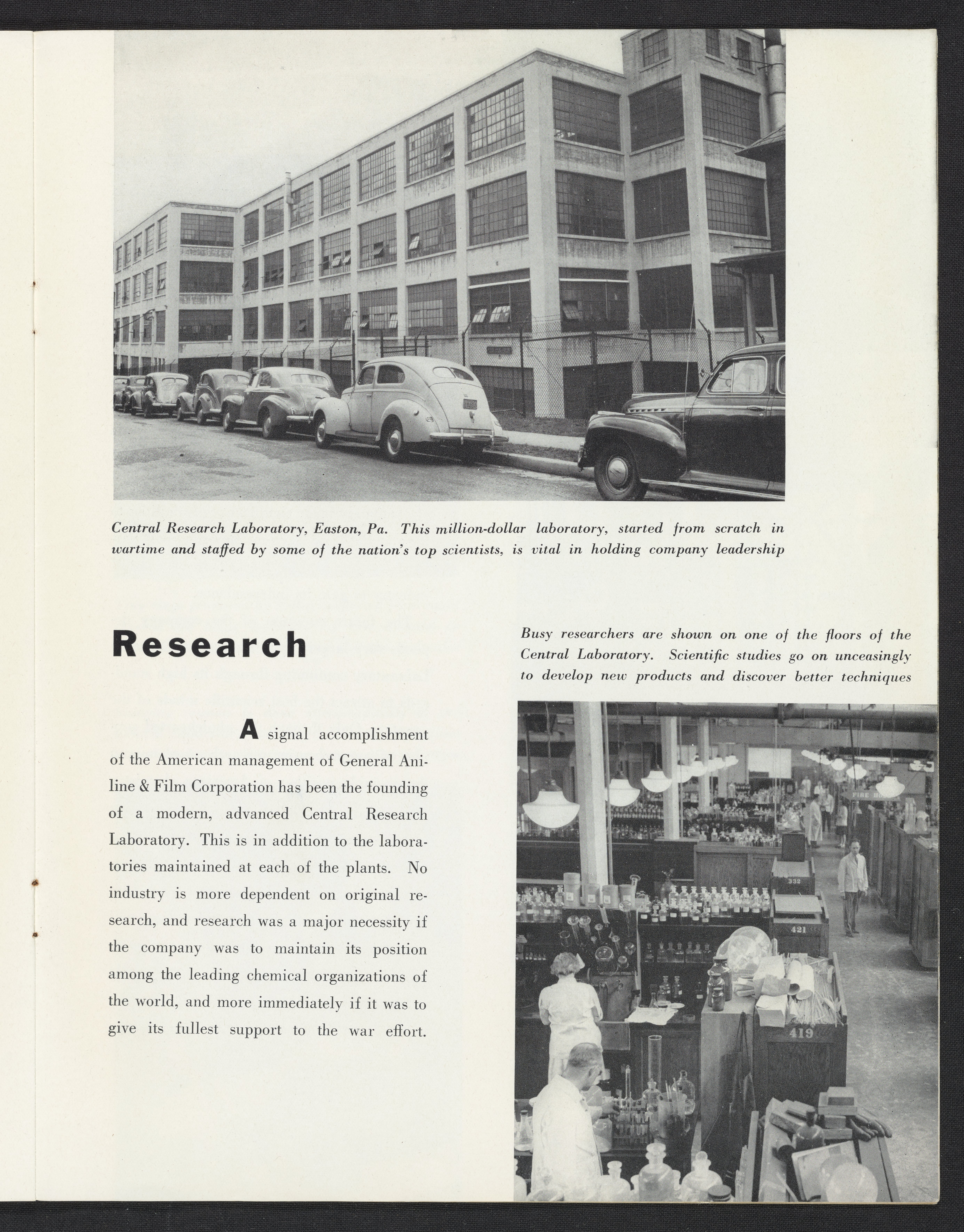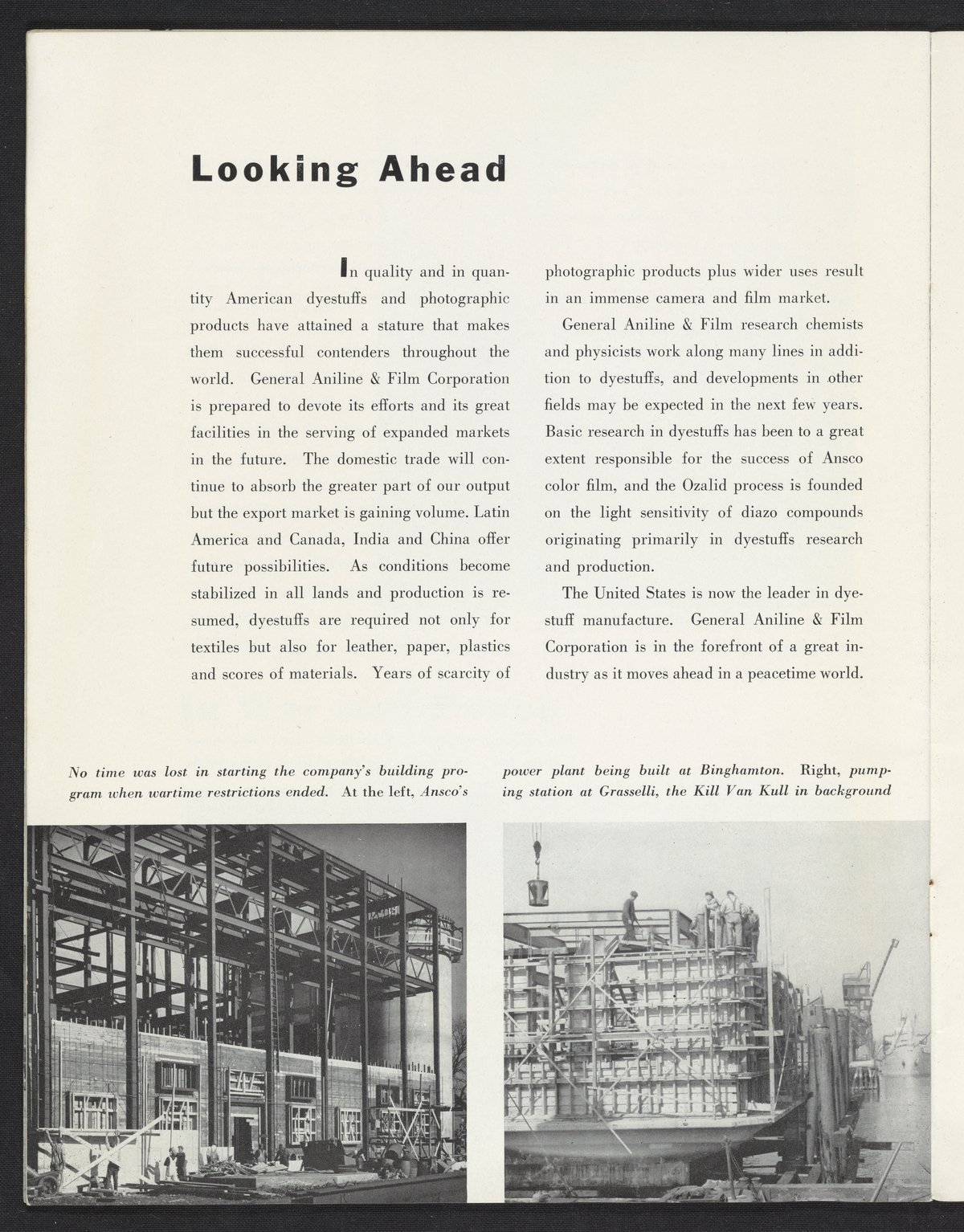 Small JPG1200 x 1538px — 267 KBLarge JPG2880 x 3691px — 2.2 MBFull-sized JPG5370 x 6883px — 7.6 MBOriginal fileTIFF — 5370 x 6883px — 106 MBDigitized in entirety, this illustrated work outlines the history of the General Aniline & Film Corporation. Intended as an advertising brochure, includes information on the General Aniline Works Division, detailing operations within their dye factory and manufacturing plant; the Ansco Division, where the manufacturing of photographic products occurs including the manufacturing of Ansco Color film and paper; the Ozalid Division, where their all-in-one Ozalid exposure and dry development photography equipment is made. There is also a section on research, a section entitled "In War and Peace" on the company's activities during World War II as well as a section entitled "Looking Ahead."