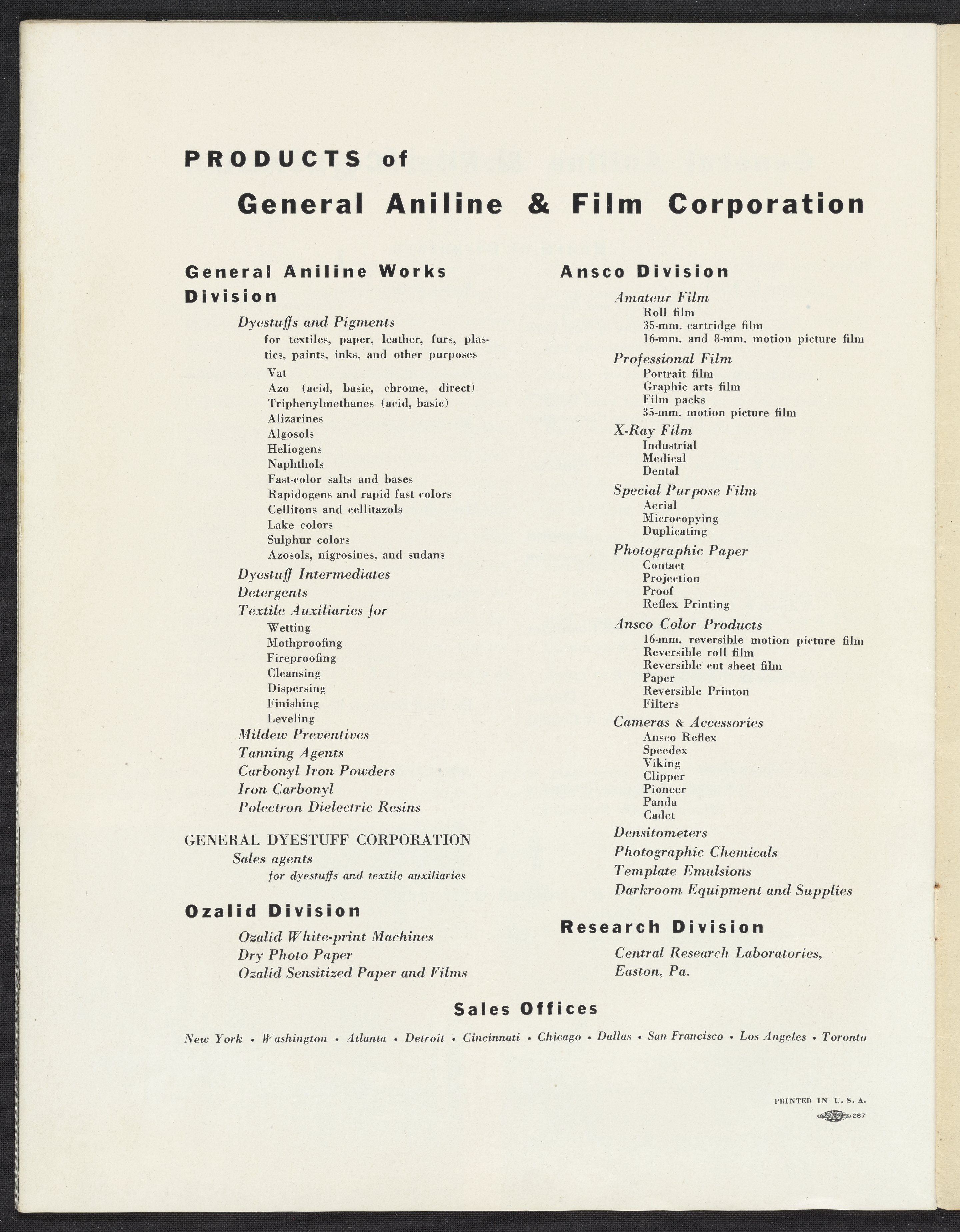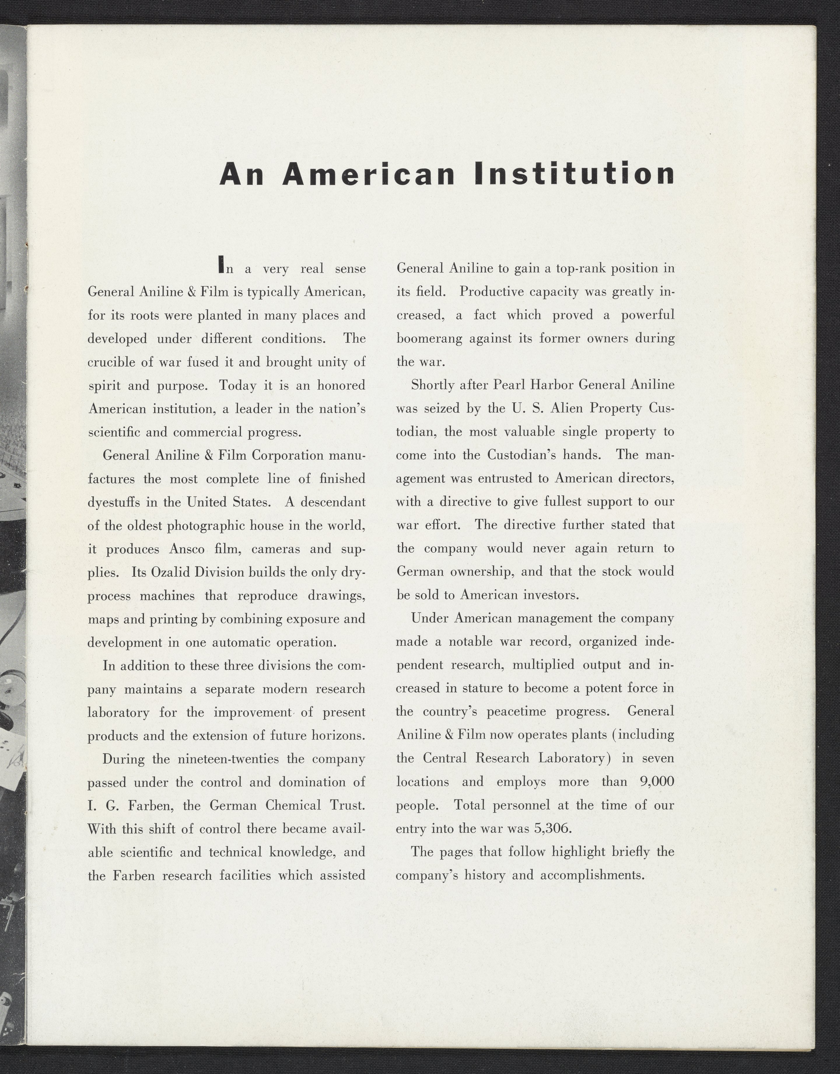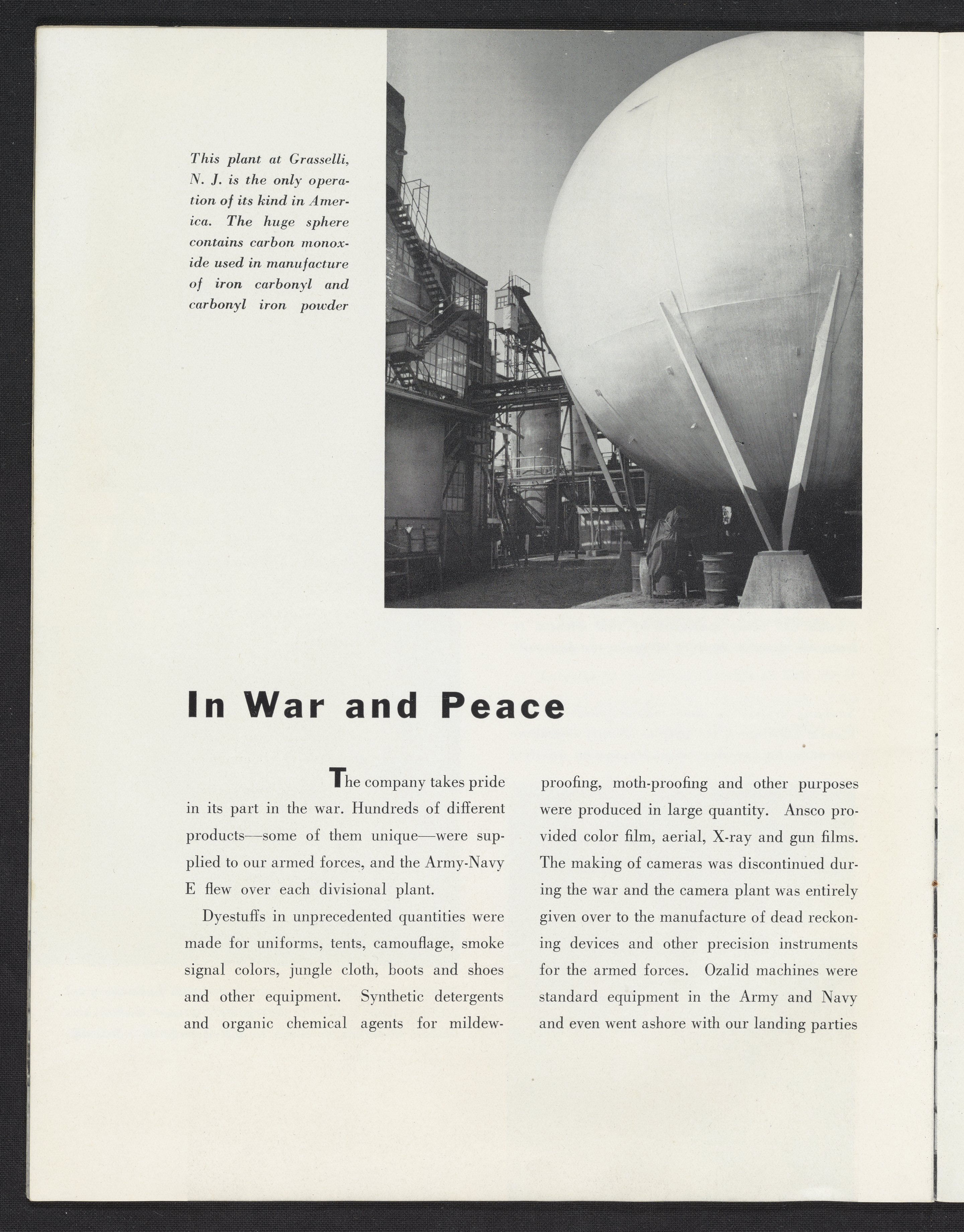 Small JPG1200 x 1538px — 267 KBLarge JPG2880 x 3691px — 2.2 MBFull-sized JPG5370 x 6883px — 7.6 MBOriginal fileTIFF — 5370 x 6883px — 106 MBDigitized in entirety, this illustrated work outlines the history of the General Aniline & Film Corporation. Intended as an advertising brochure, includes information on the General Aniline Works Division, detailing operations within their dye factory and manufacturing plant; the Ansco Division, where the manufacturing of photographic products occurs including the manufacturing of Ansco Color film and paper; the Ozalid Division, where their all-in-one Ozalid exposure and dry development photography equipment is made. There is also a section on research, a section entitled "In War and Peace" on the company's activities during World War II as well as a section entitled "Looking Ahead."