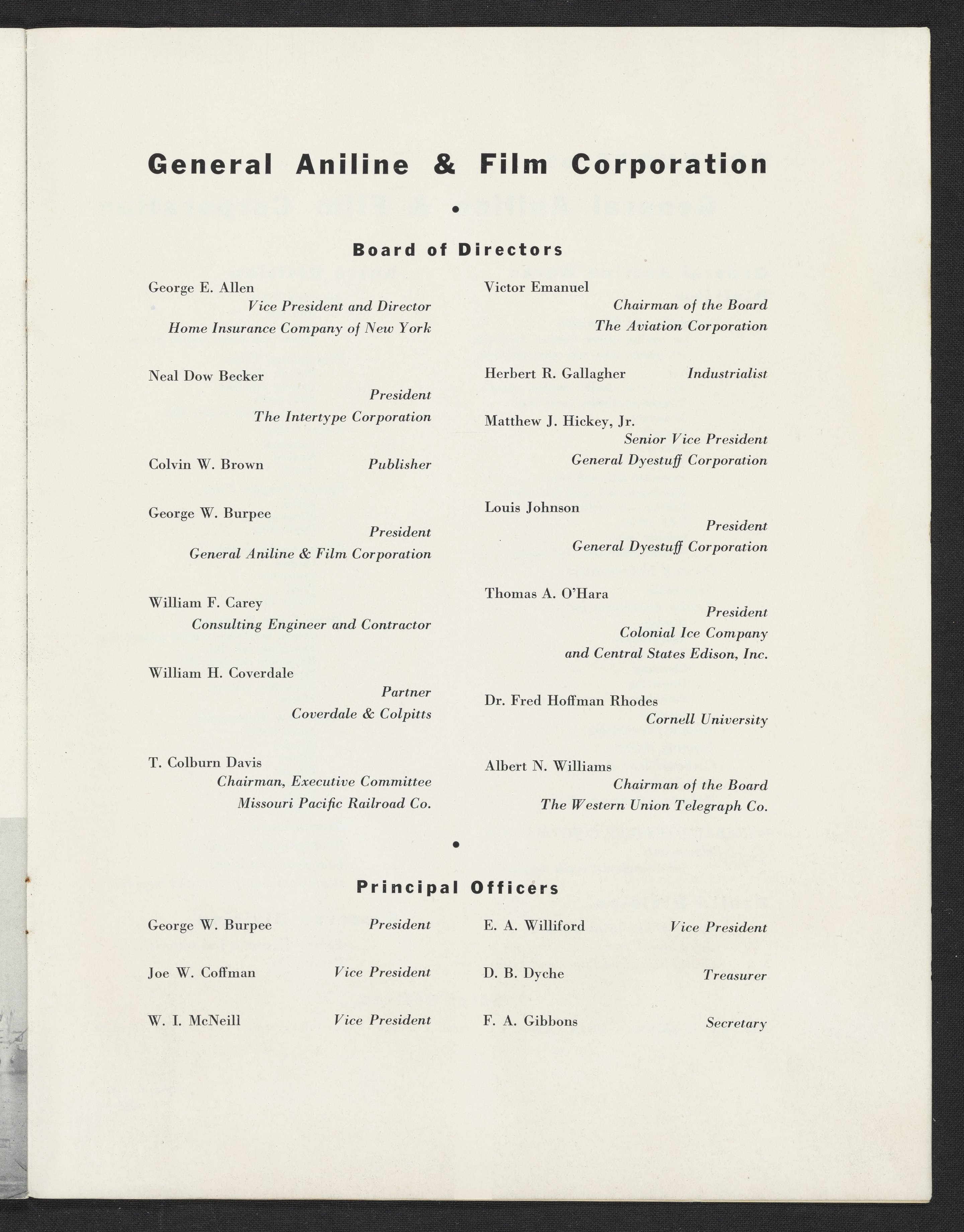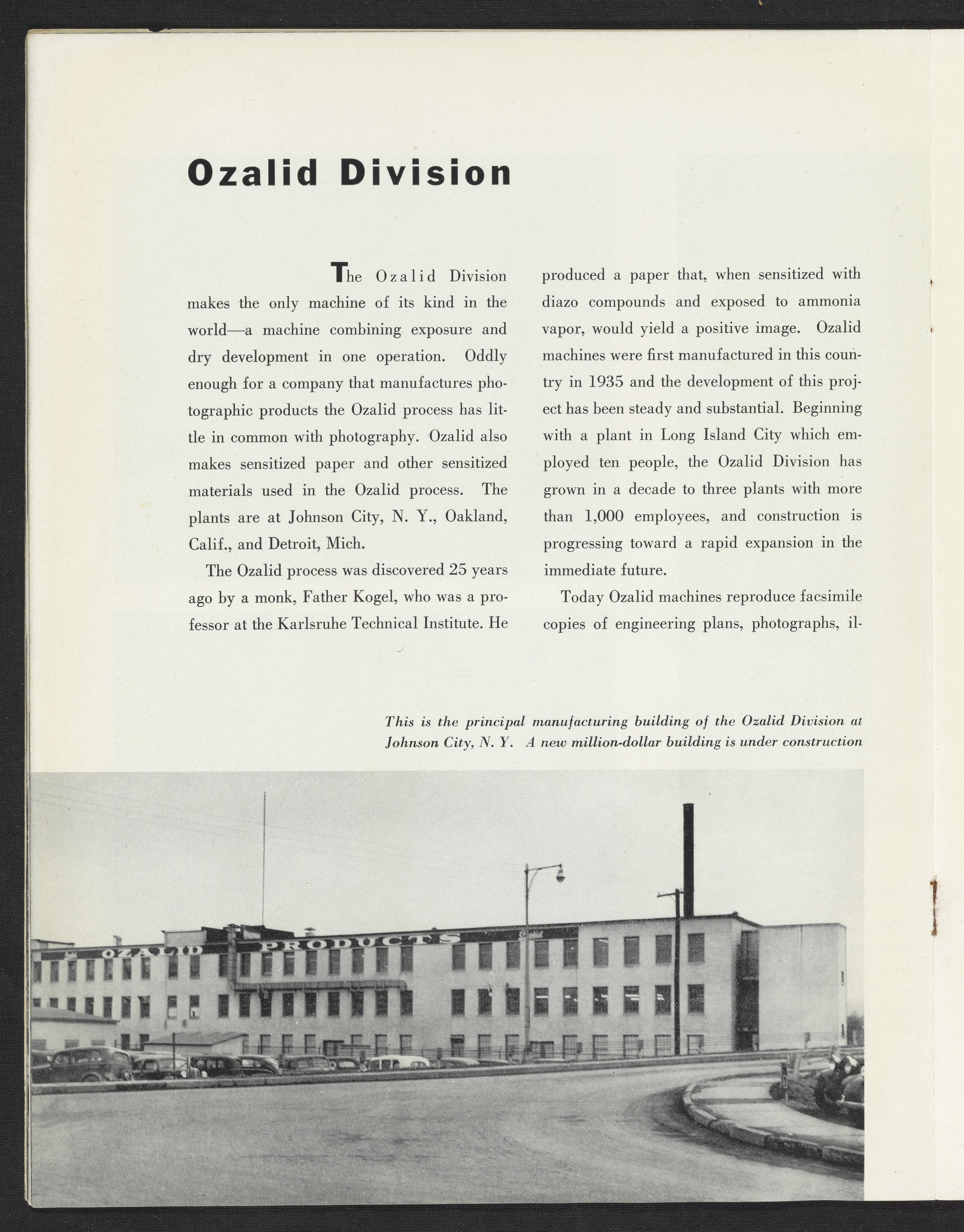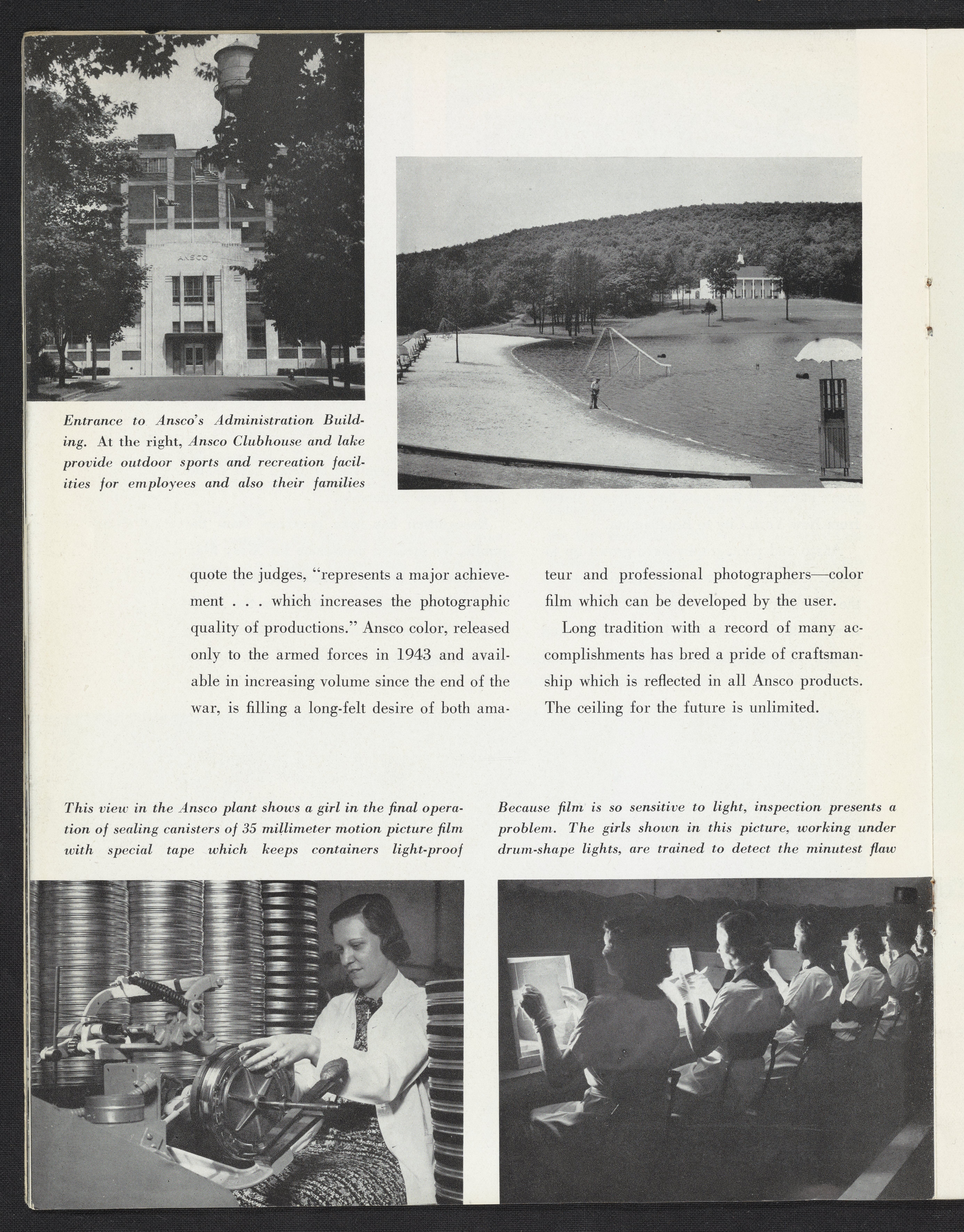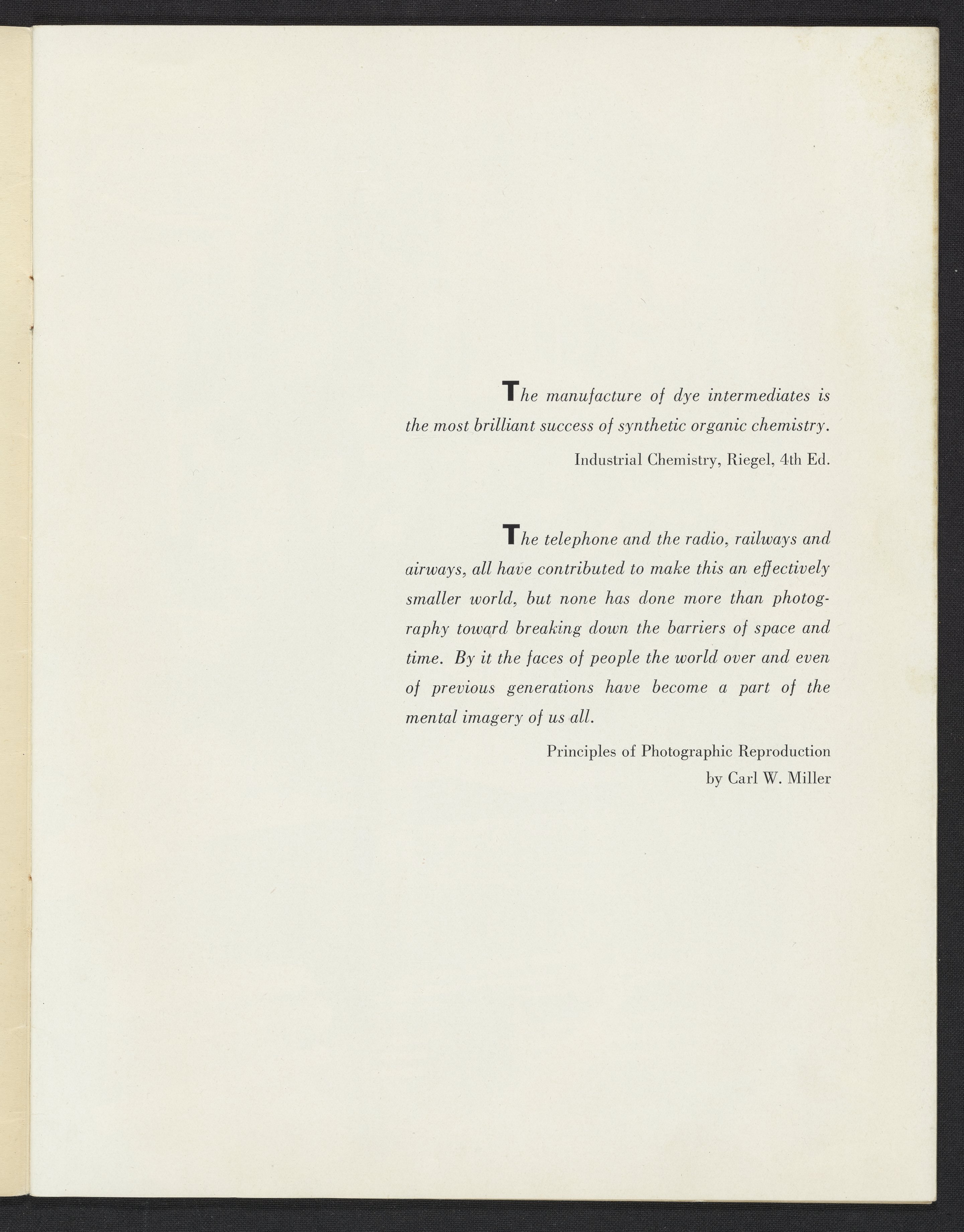 Small JPG1200 x 1538px — 267 KBLarge JPG2880 x 3691px — 2.2 MBFull-sized JPG5370 x 6883px — 7.6 MBOriginal fileTIFF — 5370 x 6883px — 106 MBDigitized in entirety, this illustrated work outlines the history of the General Aniline & Film Corporation. Intended as an advertising brochure, includes information on the General Aniline Works Division, detailing operations within their dye factory and manufacturing plant; the Ansco Division, where the manufacturing of photographic products occurs including the manufacturing of Ansco Color film and paper; the Ozalid Division, where their all-in-one Ozalid exposure and dry development photography equipment is made. There is also a section on research, a section entitled "In War and Peace" on the company's activities during World War II as well as a section entitled "Looking Ahead."