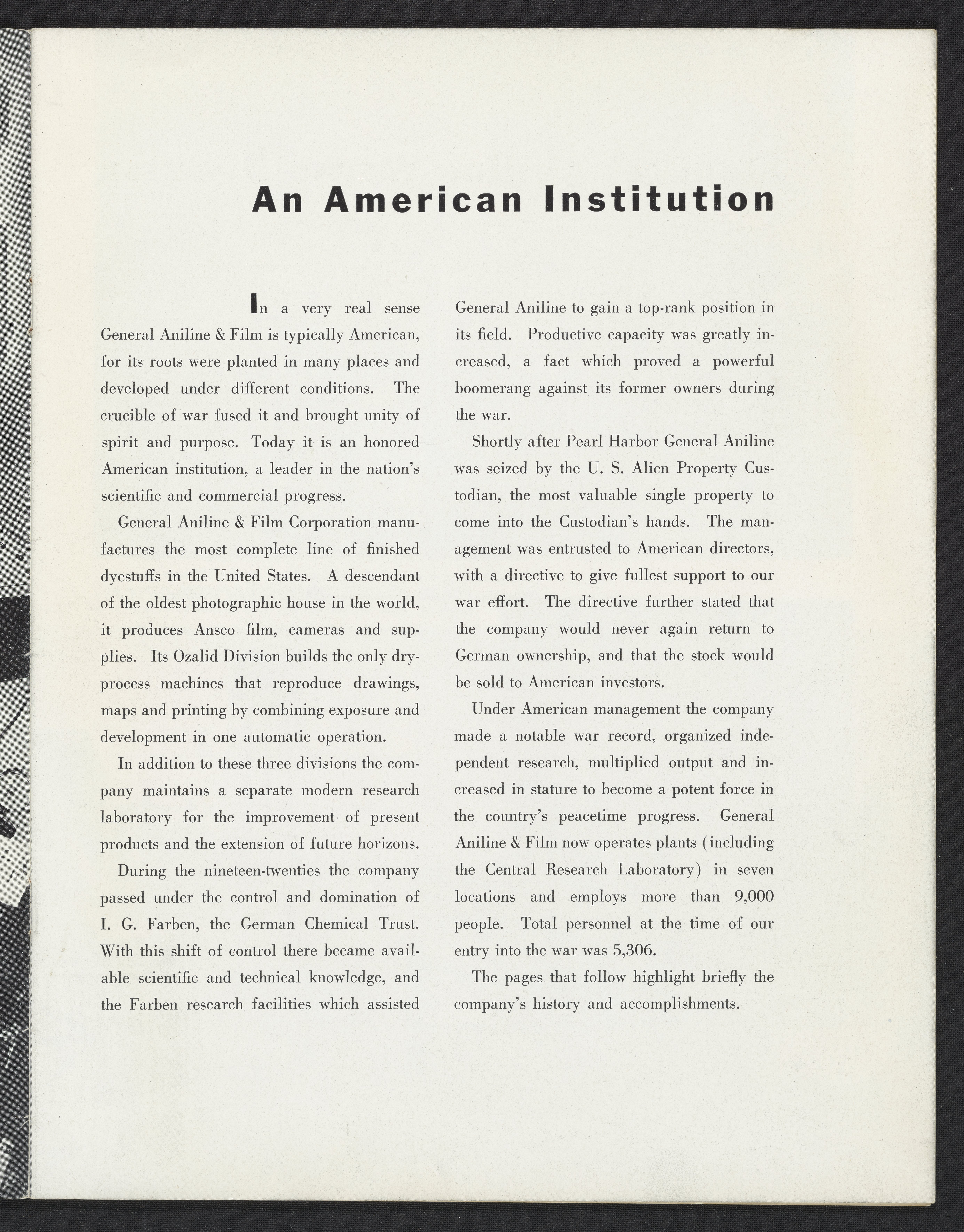 General Aniline & Film Corporation. “The Making of an American Company: General Aniline & Film Corporation 1842-1946.” New York, New York, 1946. https://digital.sciencehistory.org/works/xw42n9112.