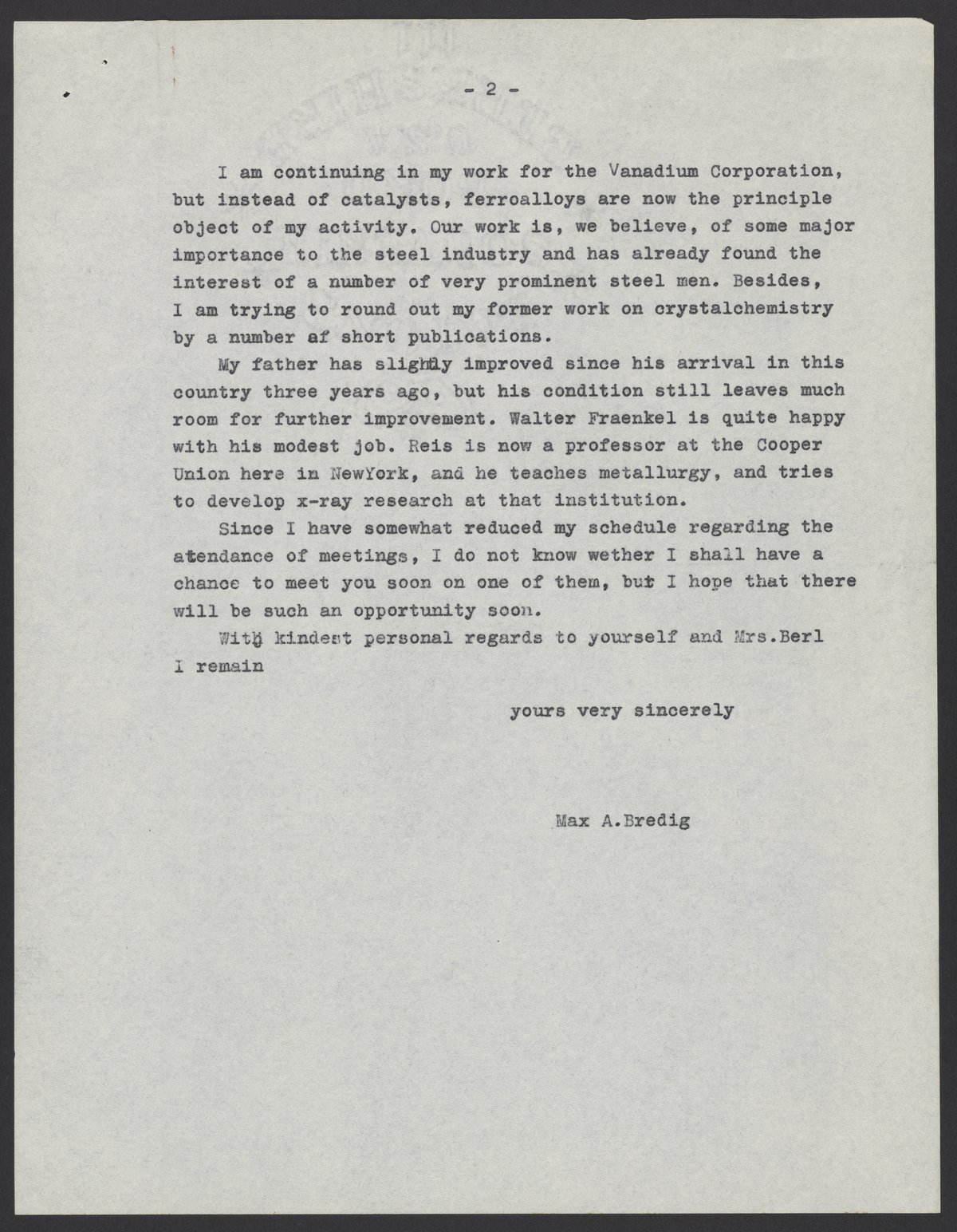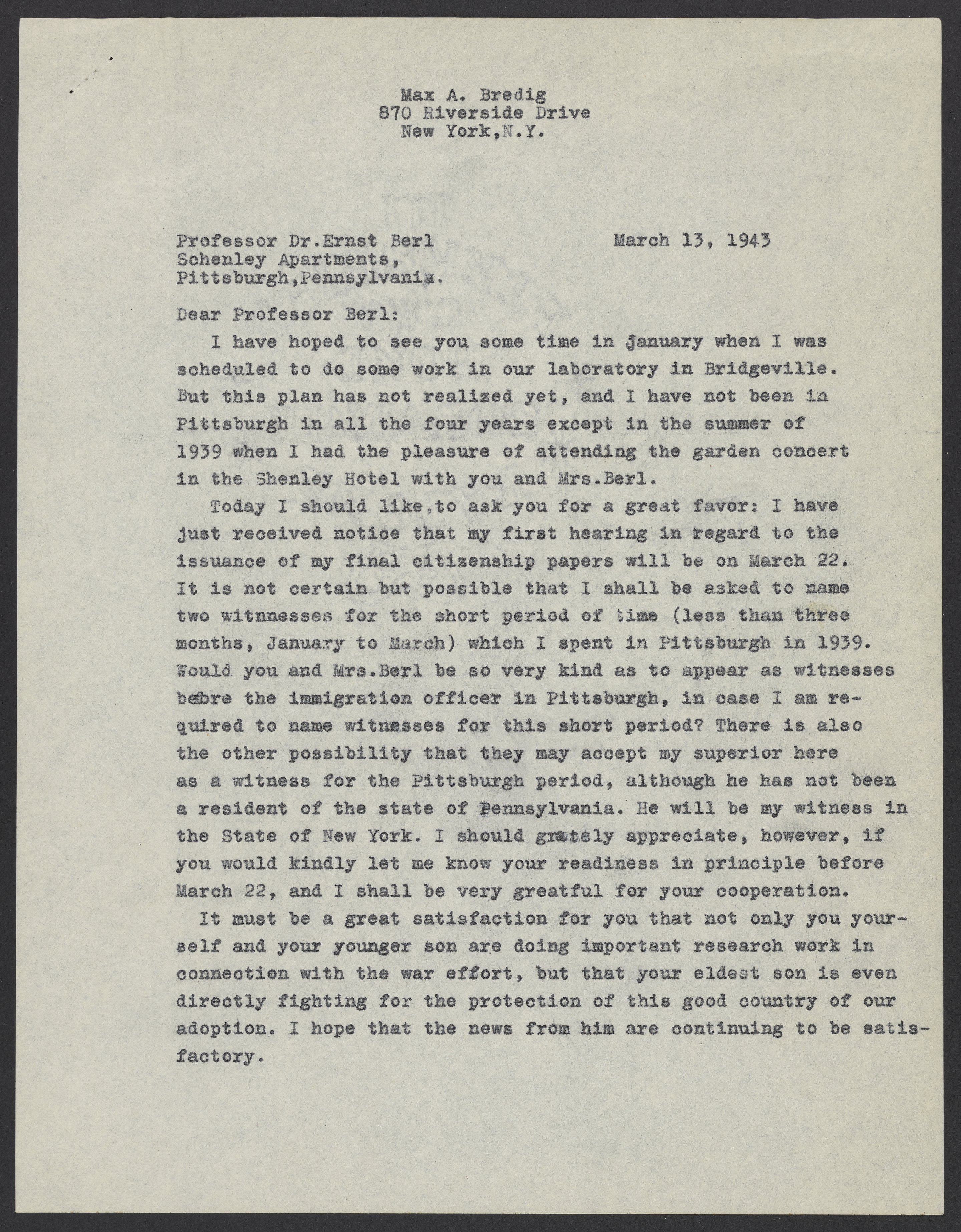 Bredig, Max Albert. “Letter from Max Bredig to Ernst Berl, March 13, 1943,” March 13, 1943. Papers of Georg and Max Bredig, Box 8, Folder 36. Science History Institute. Philadelphia. https://digital.sciencehistory.org/works/xy48bmh.