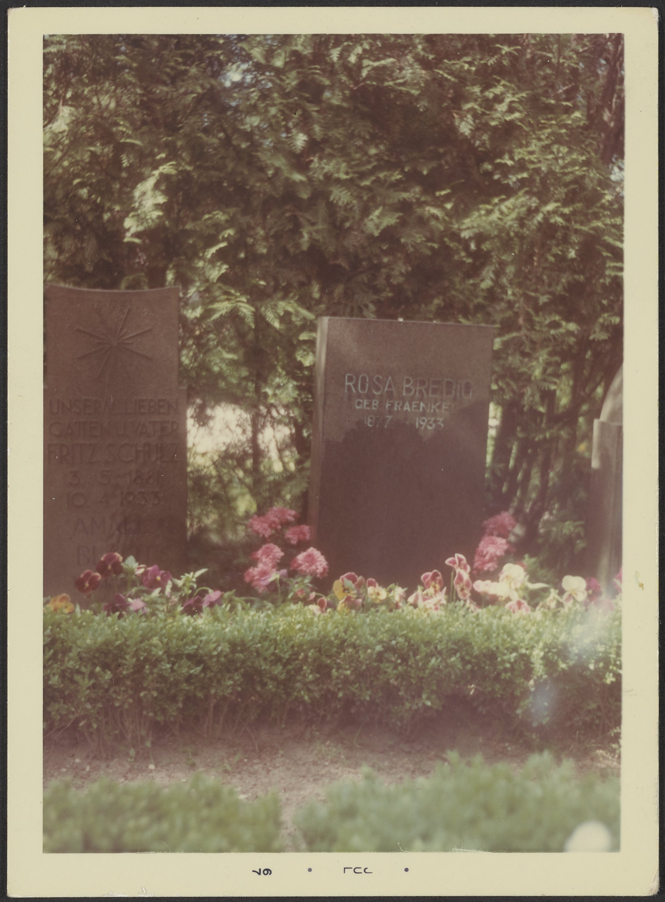 Small JPG1200 x 1627px — 250 KBFull-sized JPG2182 x 2959px — 642 KBOriginal fileTIFF — 2182 x 2959px — 18.5 MBColor photograph showing the grave of Rosa née Fraenkel (1877-1933). Though little is known about Bredig as an individual, in 1901 she was married to physical chemist Georg Bredig (1868-1944) and had two children, Max (1902-1977) and Marianne (1903-1986).