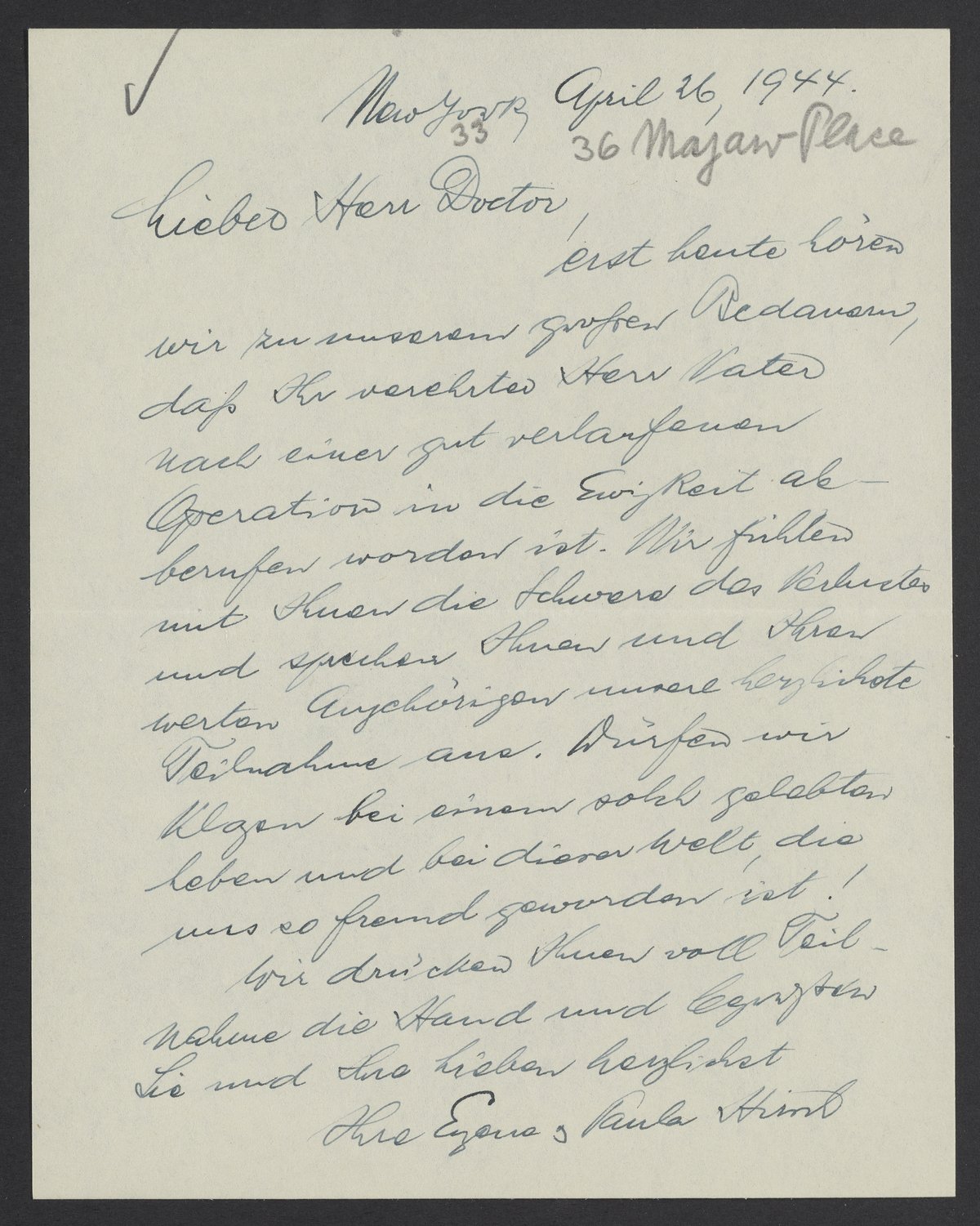 erst heute hören wir zu unserem großen Bedauern, dass Ihr verehrter Herr Vater nach einer gut verlaufenen Operation in die Ewigkeit abberufen worden ist. Wir fühlen mit Ihnen die Schwere des Verlustes und sprechen, Ihnen und Ihren werten Angehörigen unsere herzlichste Teilnahme aus. Dürfen wir klagen bei einem solch gelebten Leben und bei dieser Welt, die uns so fremd geworden ist!
