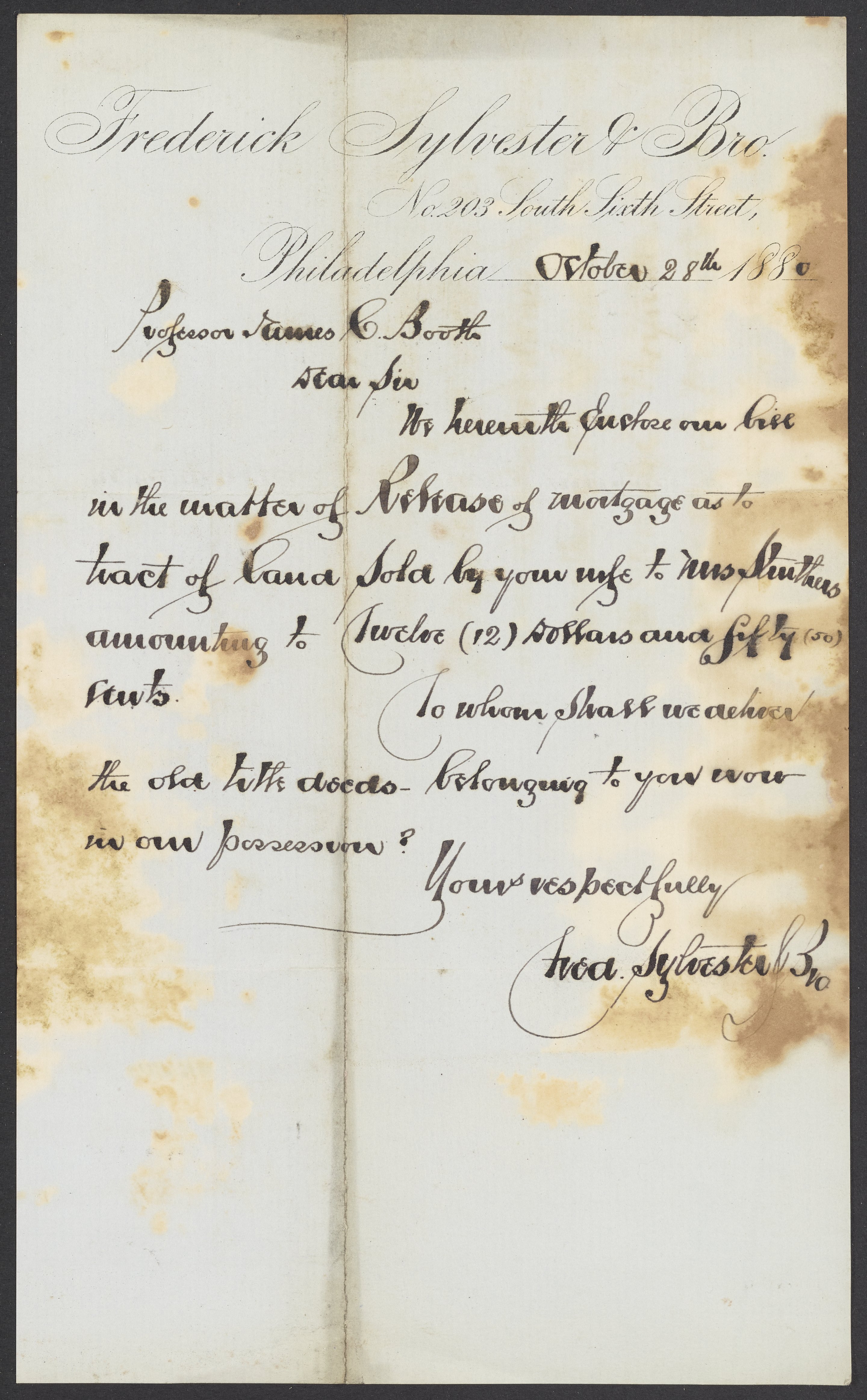 Letter from Frederick Sylvester & Brother to James Curtis Booth, October 28, 1880