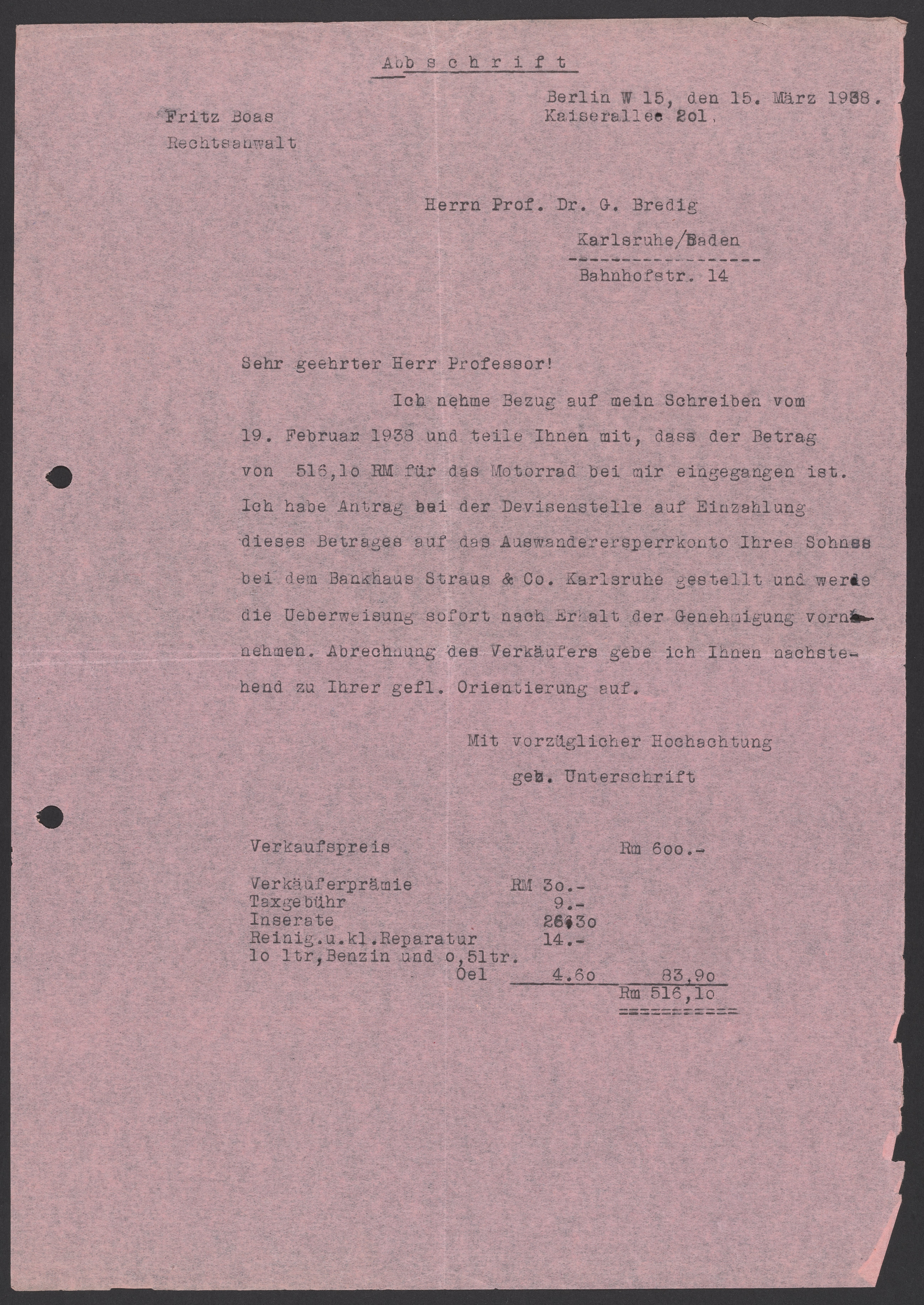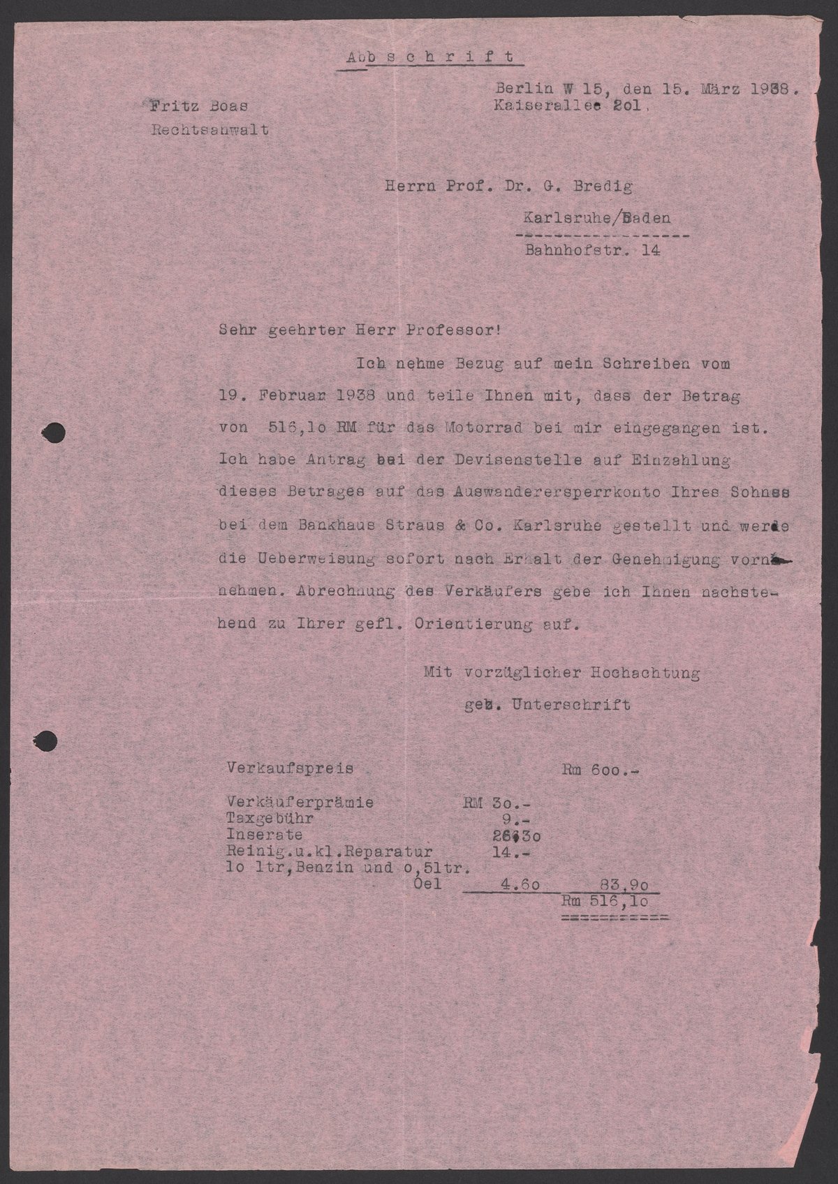 Letter from Fritz Boas to Georg Bredig