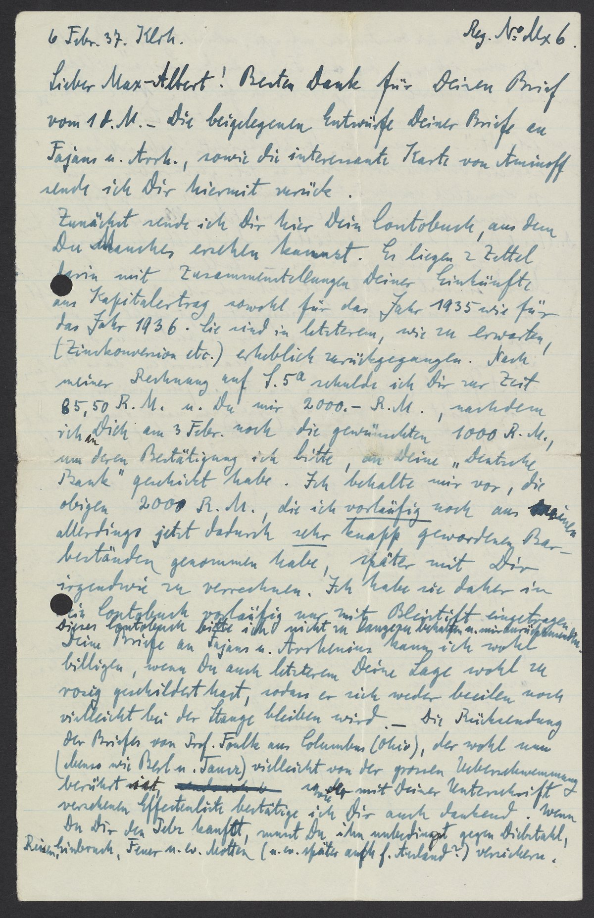 Zunächst sende ich Dir hier Dein Contobuch, aus dem Du Manches ersehen kannst. Es liegen 2 Zettel darin mit Zusammenstellungen Deiner Einkünfte aus Kapitalertrag sowohl für das Jahr 1935 wie für das Jahr 1936. Sie sind in letzterem, wie zu erwarten (Zinsenkonversion etc.) erheblich zurückgegangen. Nach meiner Rechnung auf S.5a schulde ich Dir zur Zeit 85.50 R.M. u. Du mir 2000. – R.M, nachdem ich an Dich an 3. Febr. noch die gewünschten 1000 R.M., um deren Bestätigung ich bitte, an Deine „Deutsche Bank“ geschickt habe. Ich behalte mir vor, obigen 2000 R.M., die ich vorläufig noch aus meinen Beständen genommen habe, später mit Dir irgendwie zu verrechnen. Ich habe sie daher in ein Contobuch vorläufig nur mit Bleistift eingetragen. Dieses Contobuch bitte ich nicht zu behalten u. mir zurückzusenden.