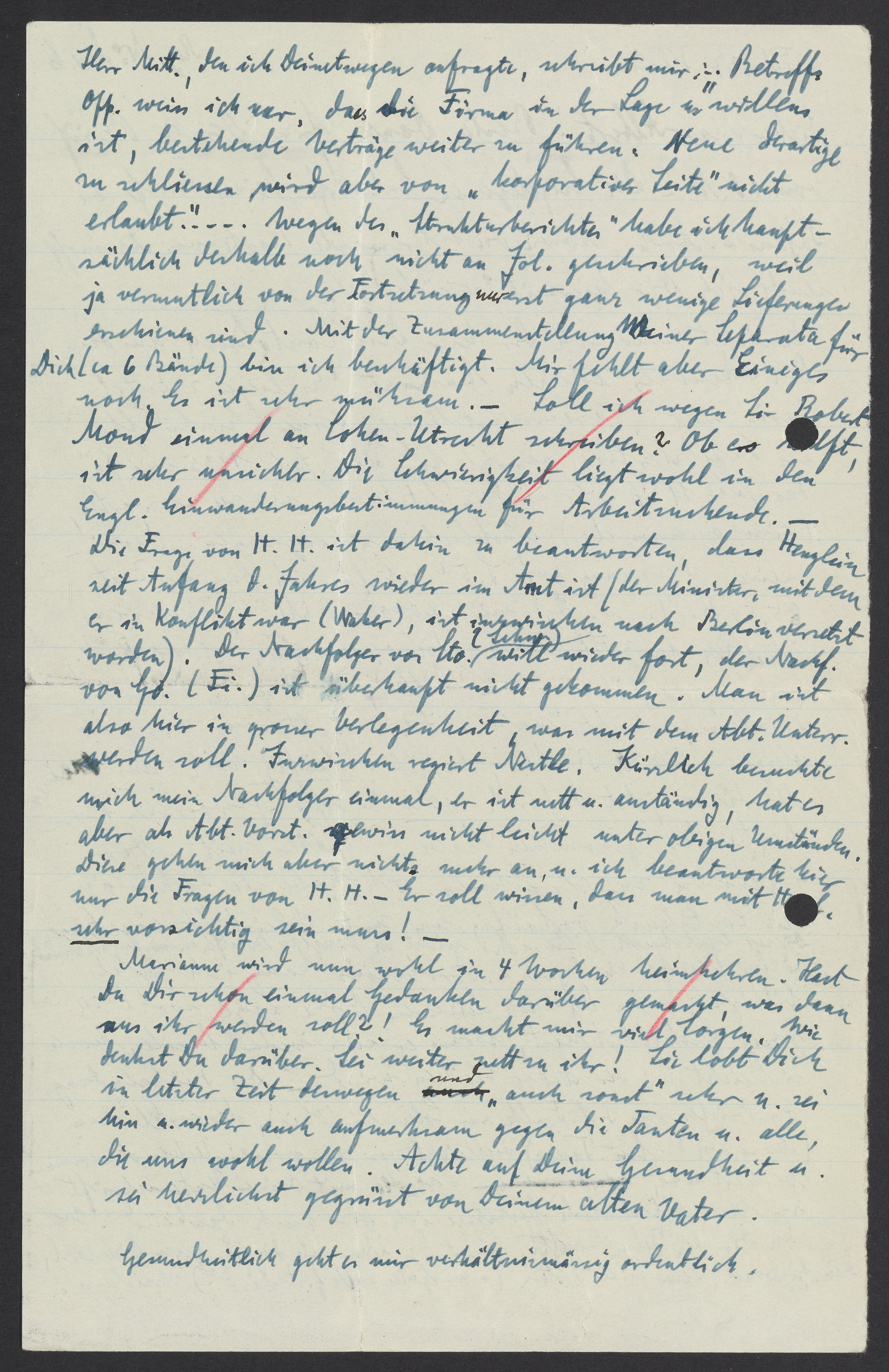 Marianne wird nun wohl in 4 Wochen heimkehren. Hast Du Dir schon einmal Gedanken darüber gemacht, was dann aus ihr werden soll?! Es macht mir viel Sorgen. Wie denkst Du darüber. Sei weiter nett zu ihr! Sie lobt Dich in letzter Zeit deswegen und „auch sonst“ sehr u. sei hin u. wieder auch aufmerksam gegen die Tanten u. alle, die uns wohl wollen. Acht auf Deine Gesundheit u. sei herzlichst gegrüsst von Deinem alten Vater.