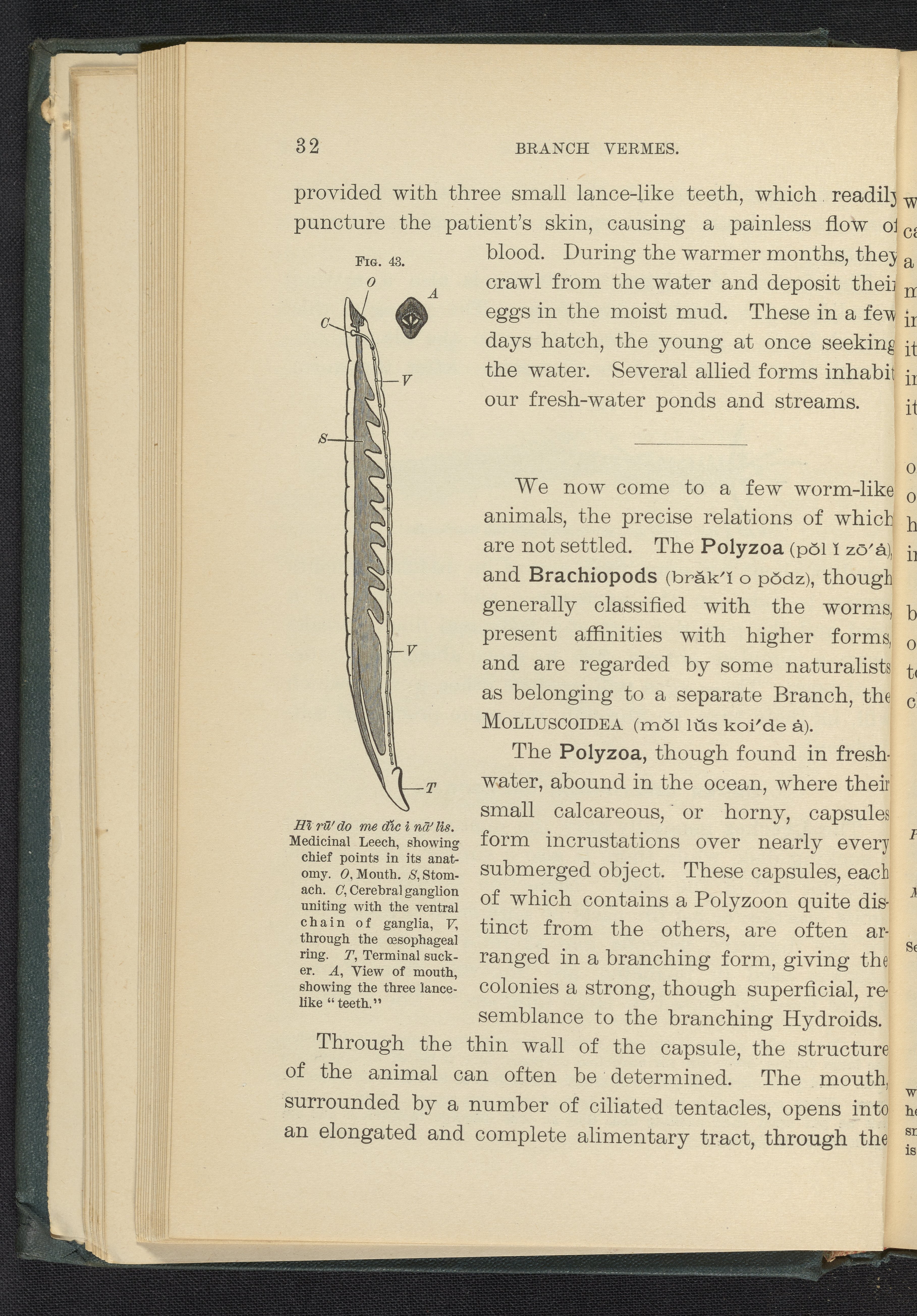 Figure 43 of the 1887 volume Popular Zoology depicting a medicinal leech, with view of chief points of anatomy including mouth, stomach, and terminal sucker.