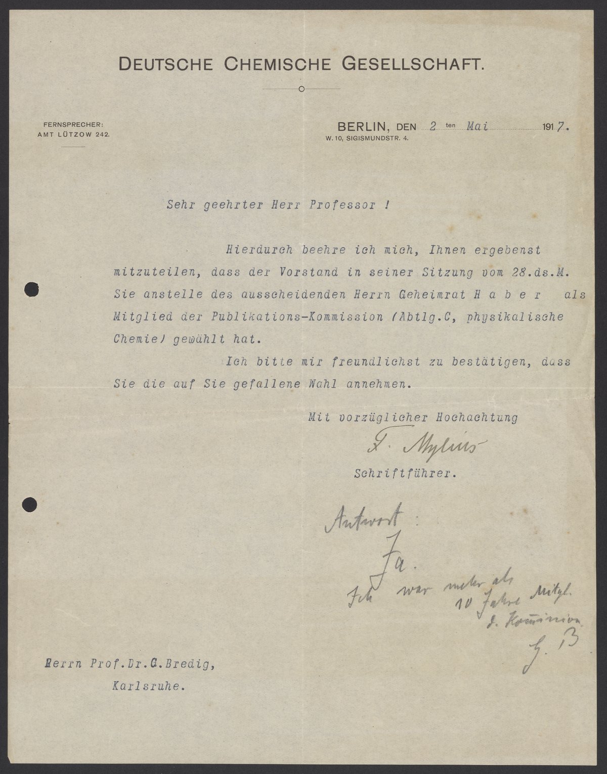Letter from the German Chemical Society to Georg Bredig (1868-1944) requesting he accept the publications committee membership position to which he has just been elected.