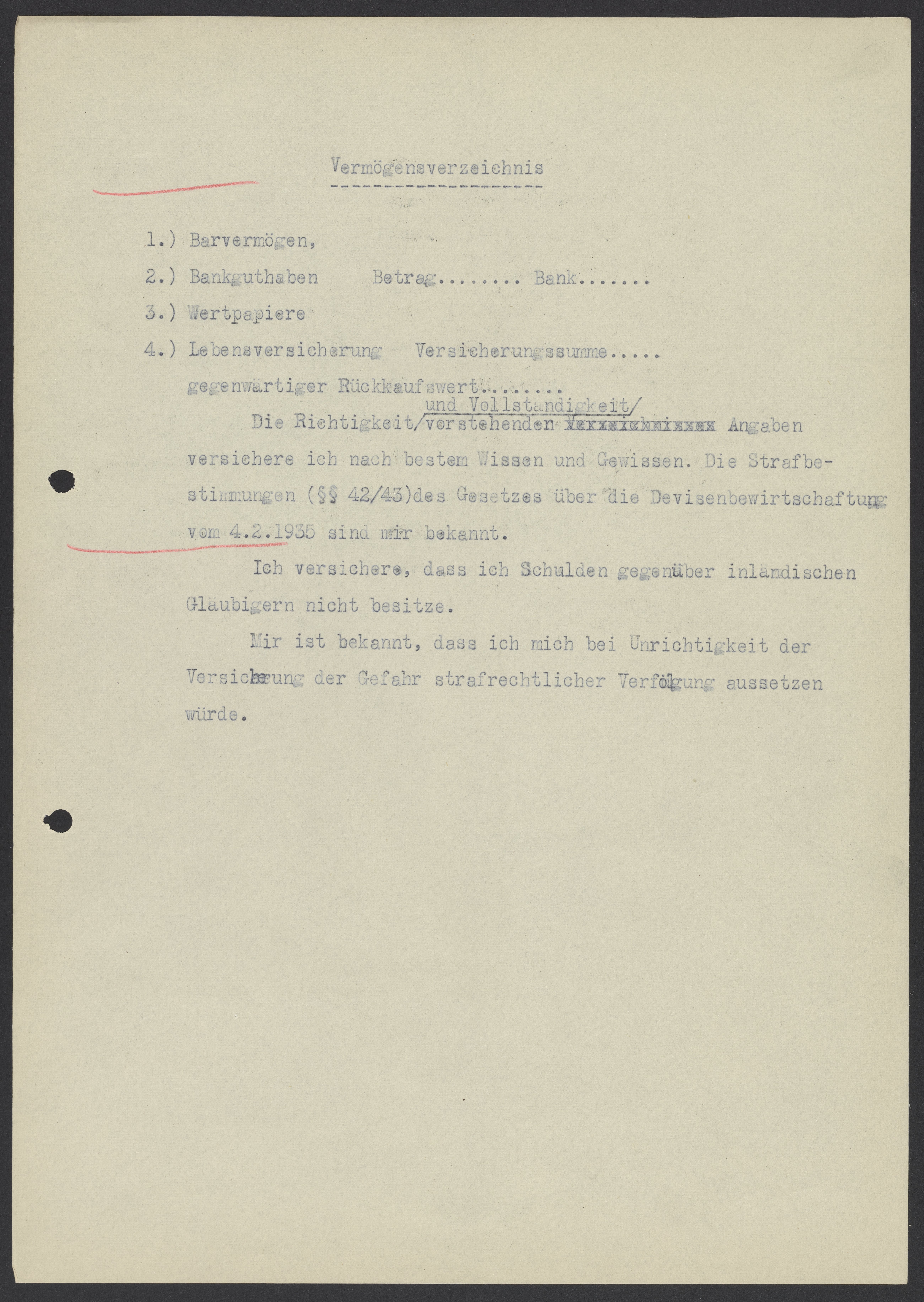 Die Richtigkeit und Vollständigkeit vorstehenden Angabe versichere ich nach bestem Wissen und Gewissen. Die Strafbestimmung (42/43) des Gesetzes über die Devisenbewirtschaftung vom 4.2.1935 sind mir bekannt.