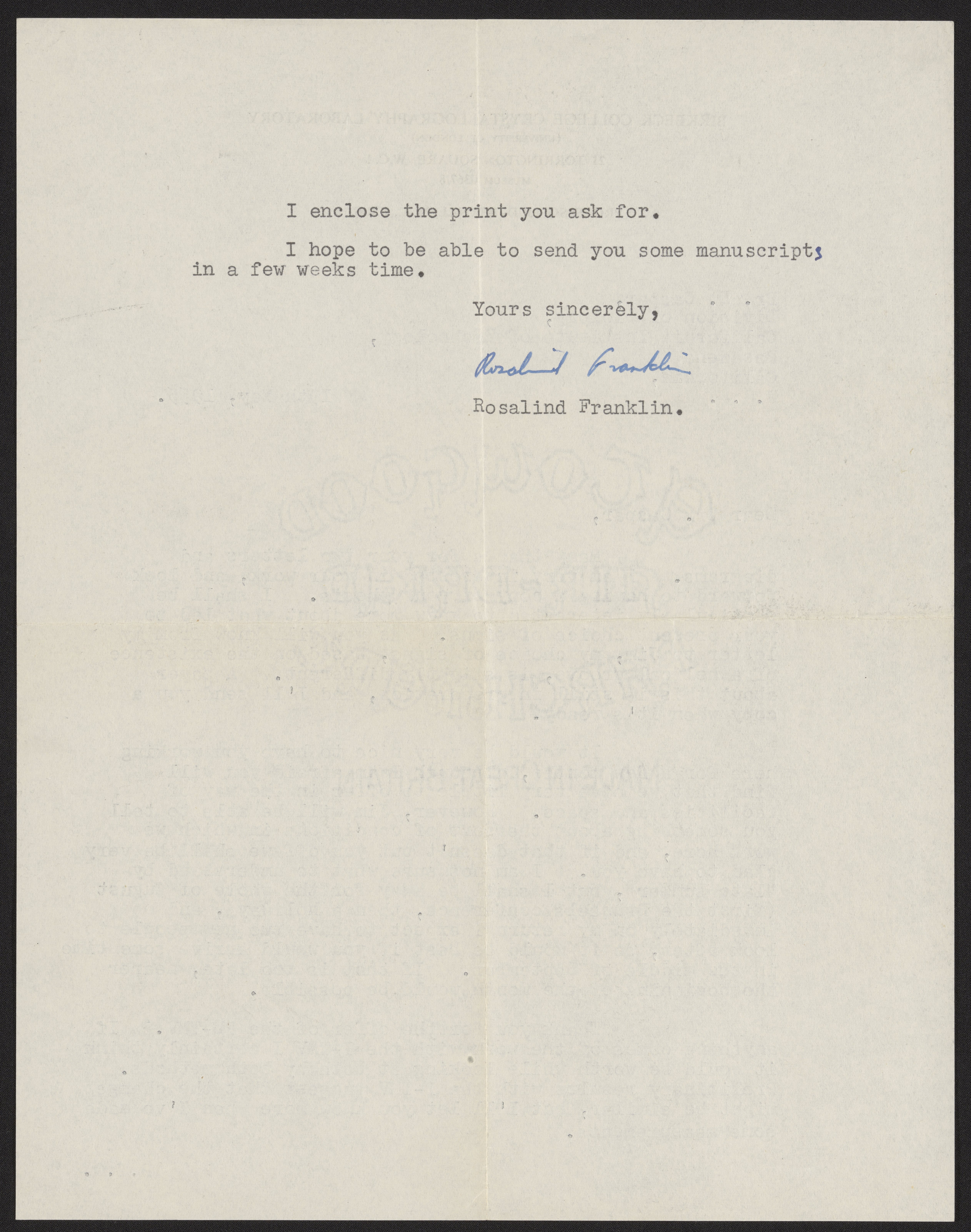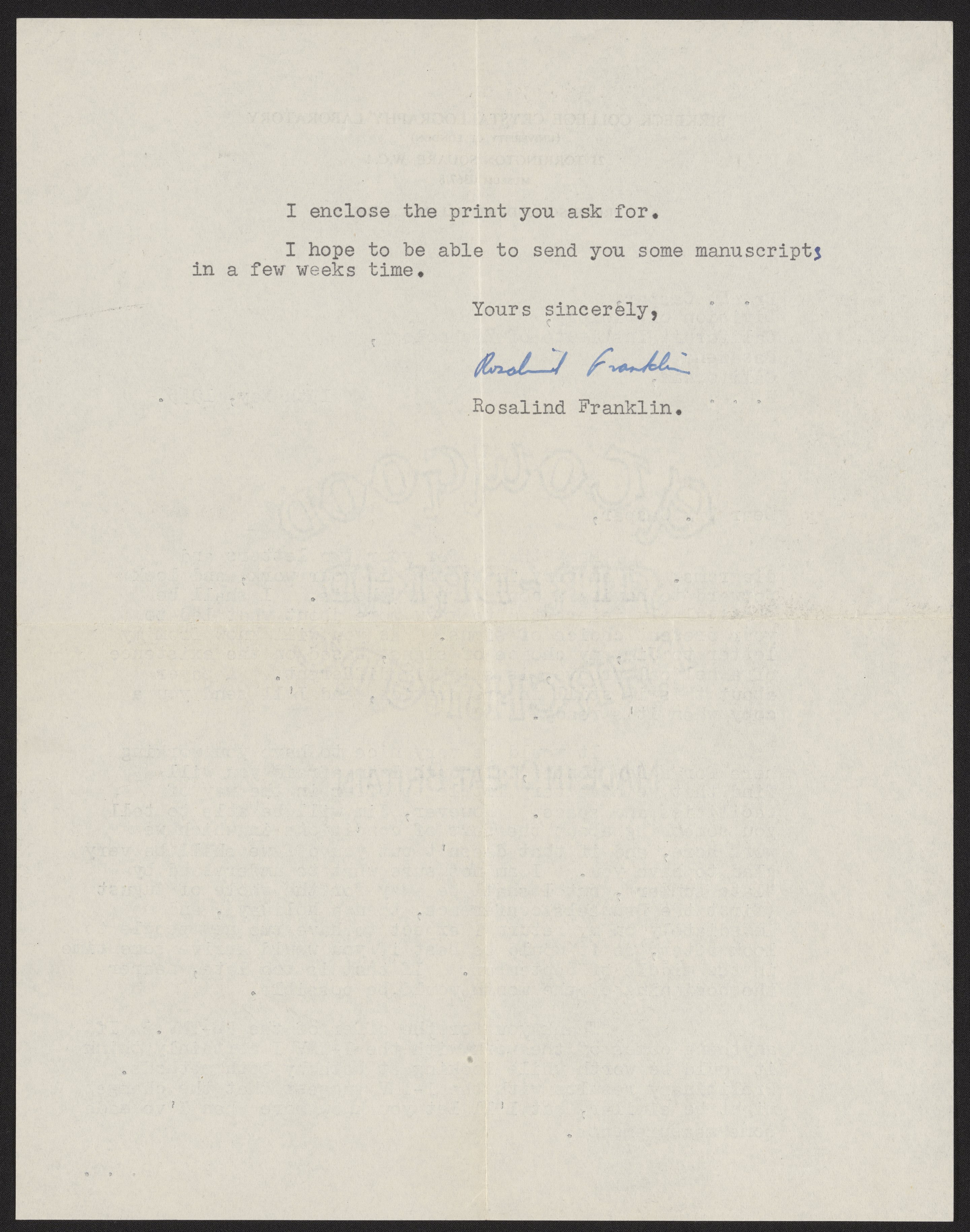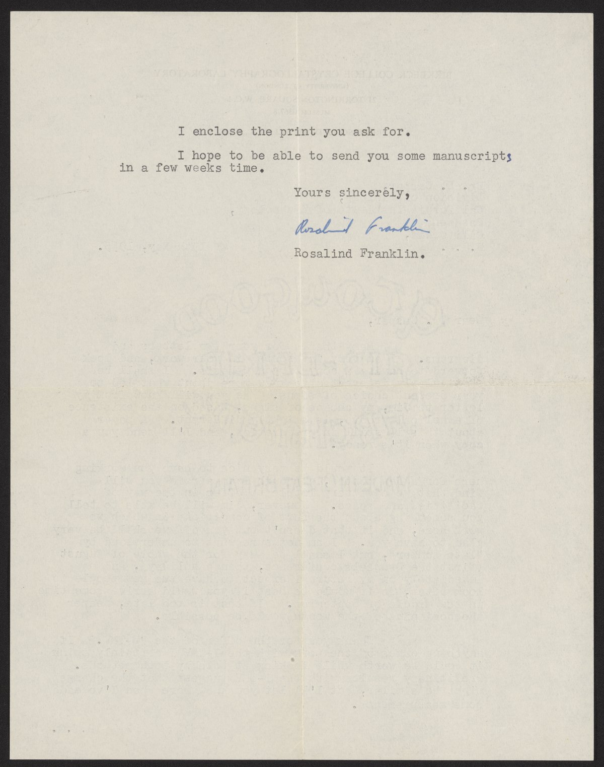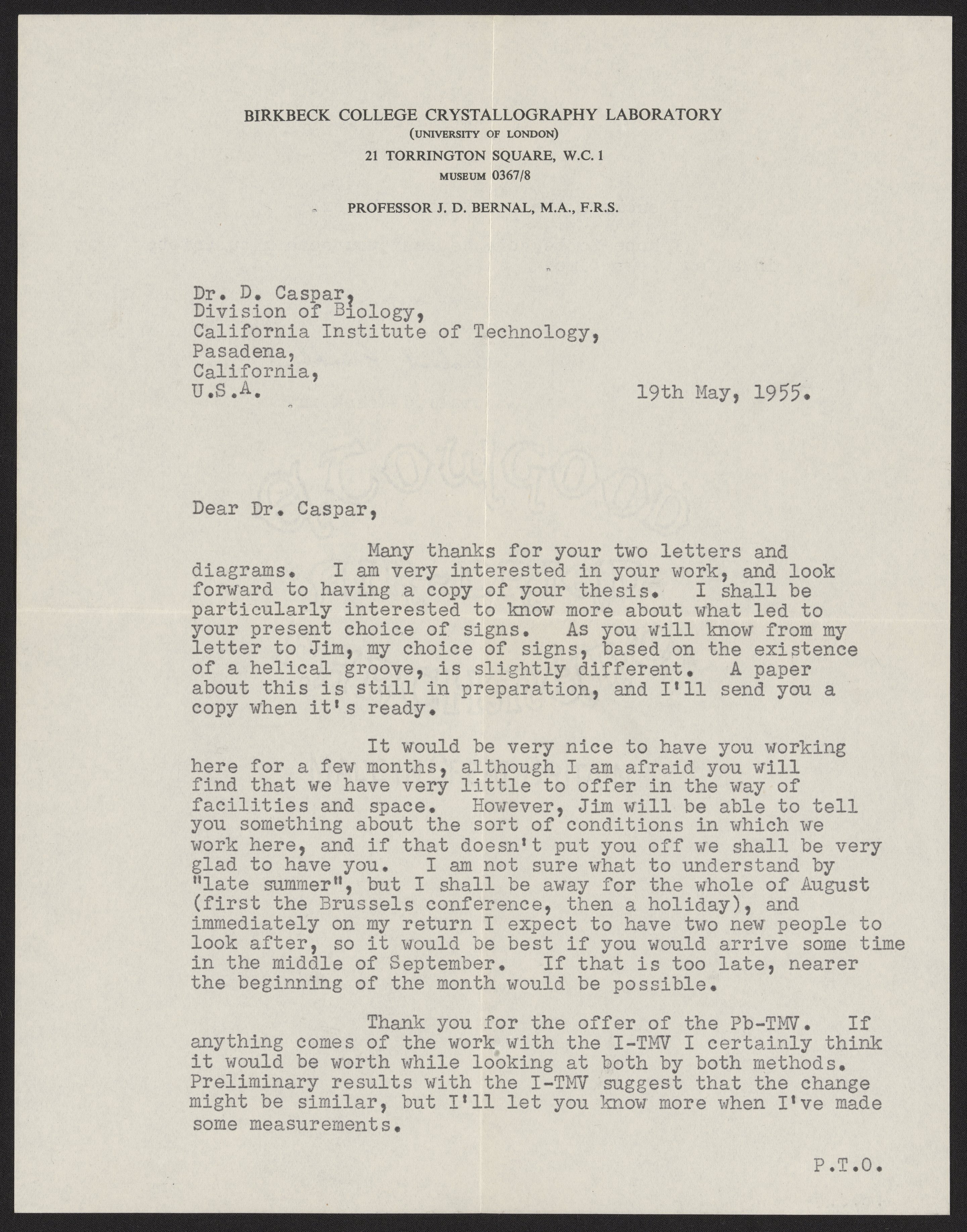 Letter from Rosalind Franklin to Donald Caspar, May 19, 1955