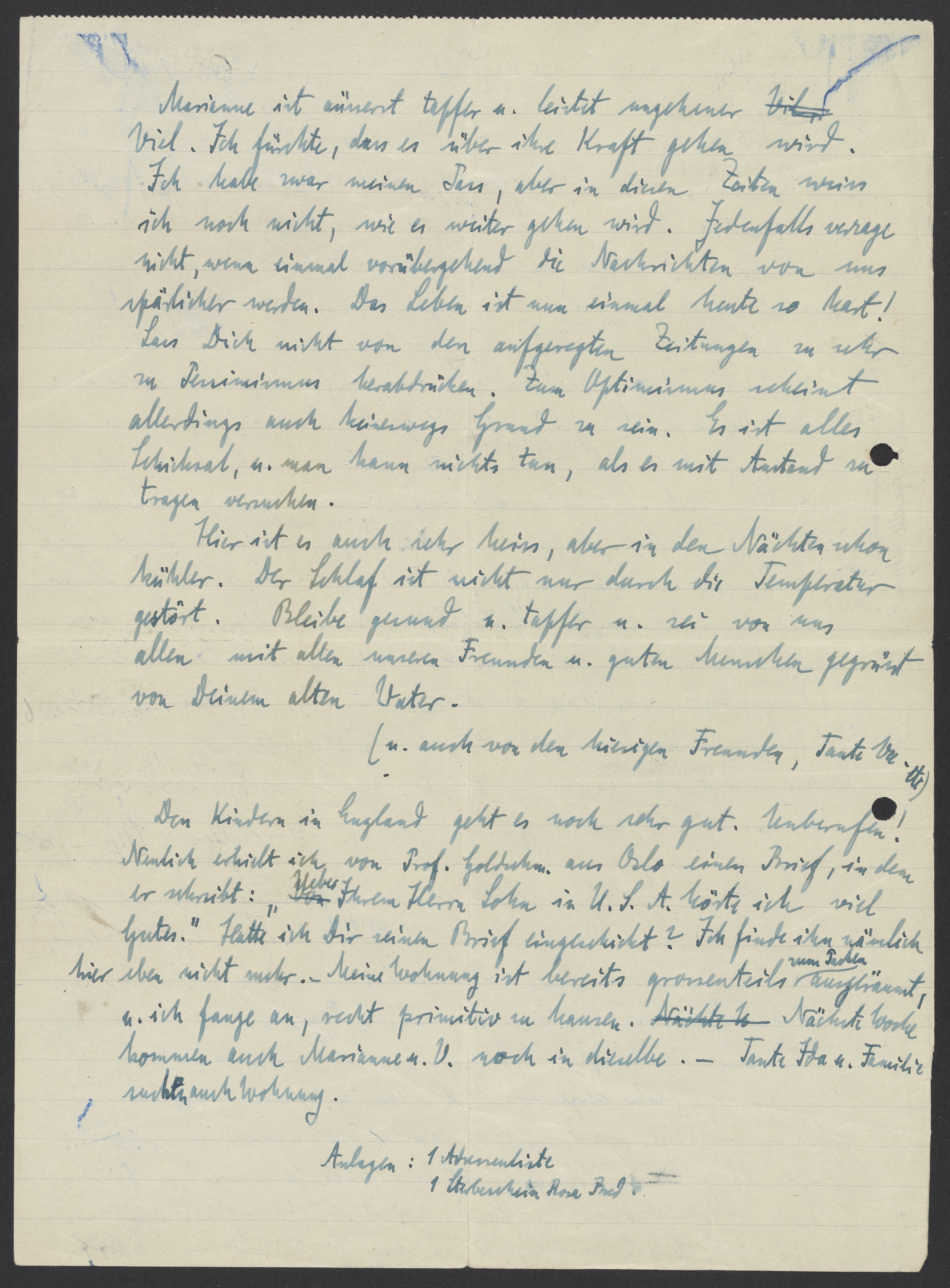 Marianne ist äusserst tapfer u. leistet ungeheuer viel. Ich fürchte, dass es über ihre Kraft gehen wird. Ich habe zwar meinen Pass, aber in diesen Zeiten weiss ich noch nicht, wie es weiter gehen wird. Jedenfalls verzage nicht, wenn einmal vorübergehend die Nachrichten von uns spärlicher werden. Das Leben ist nun einmal heute so hart! Lass Dich nicht von den aufgeregten Zeitungen zu sehr zu Pessimismus herabdrücken. Zum Optimismus scheint allerdings auch keineswegs Grund zu sein. Es ist alles Schicksal, u. man kann nichts tun, als es mit Anstand zu tragen versuchen.