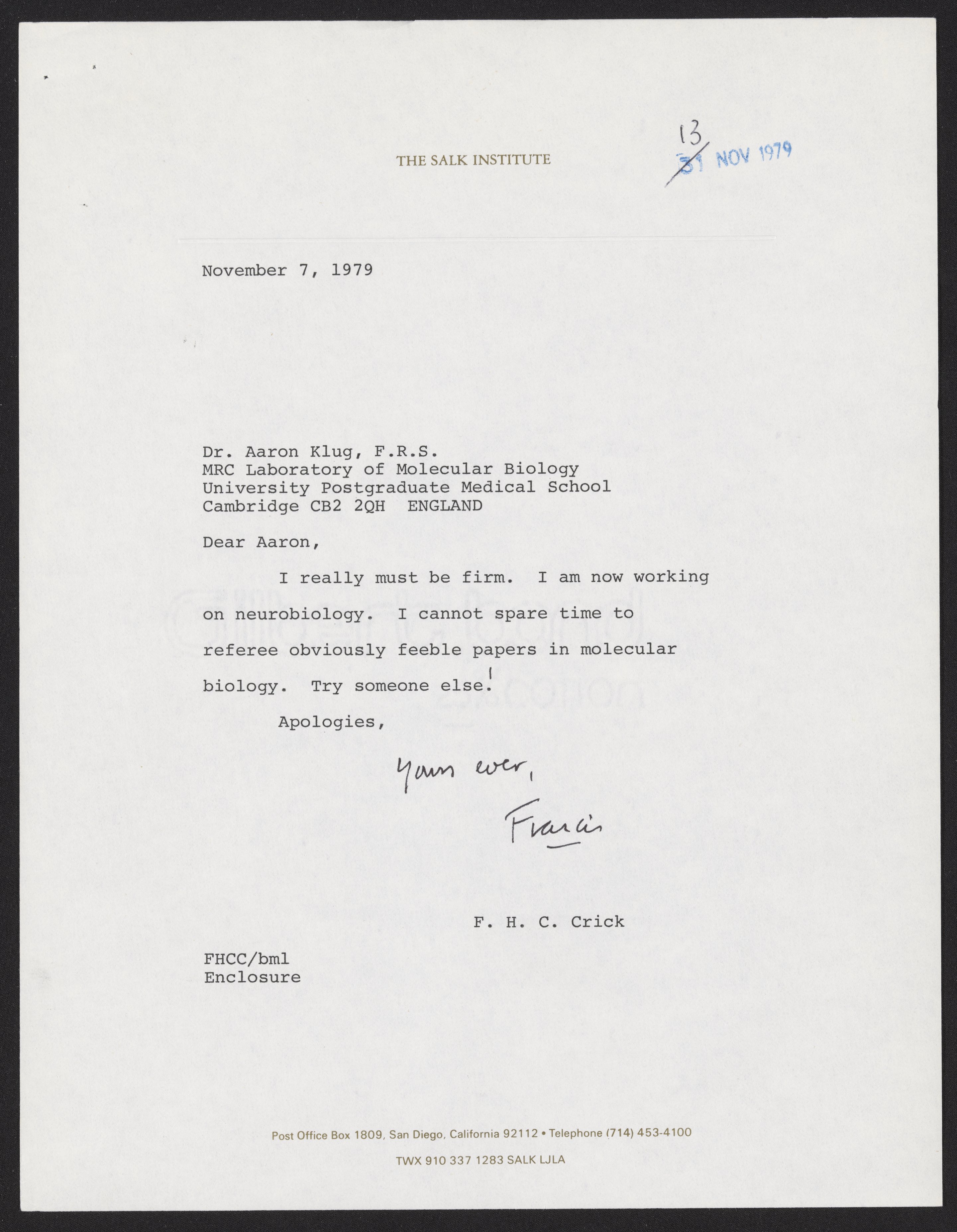 “Letter from Francis Crick to Aaron Klug, November 13, 1979,” November 13, 1979. History of Molecular Biology Collection, Box 20, Folder 3. Science History Institute. Philadelphia. https://digital.sciencehistory.org/works/y7lpxnj.